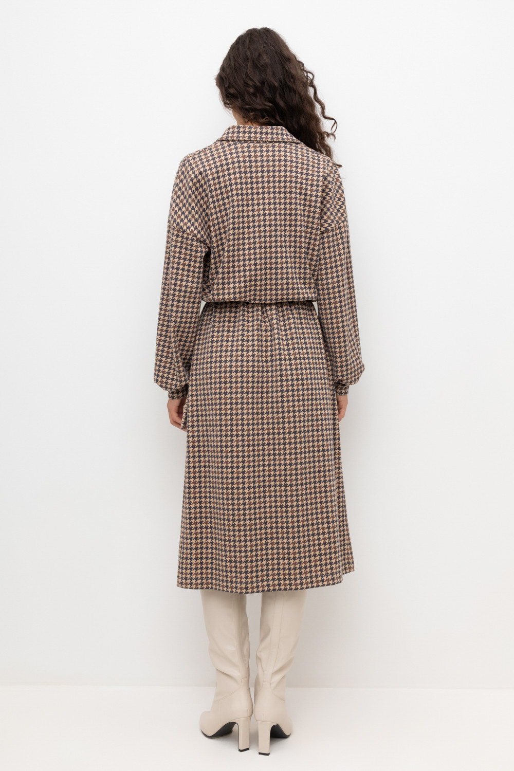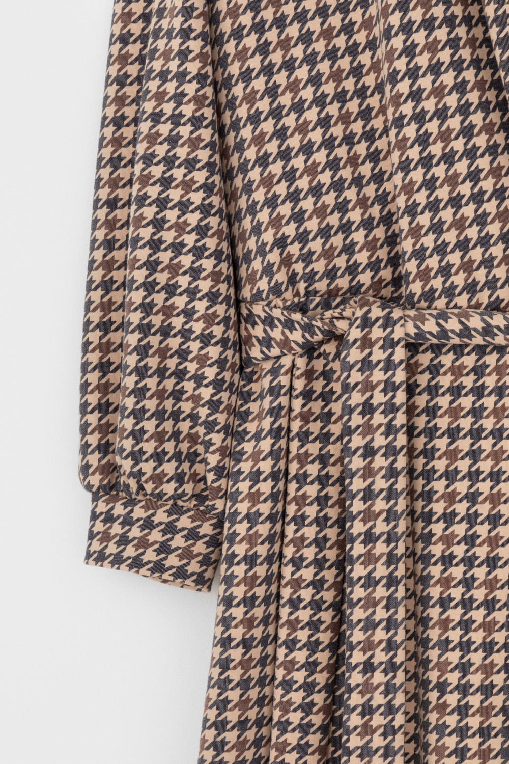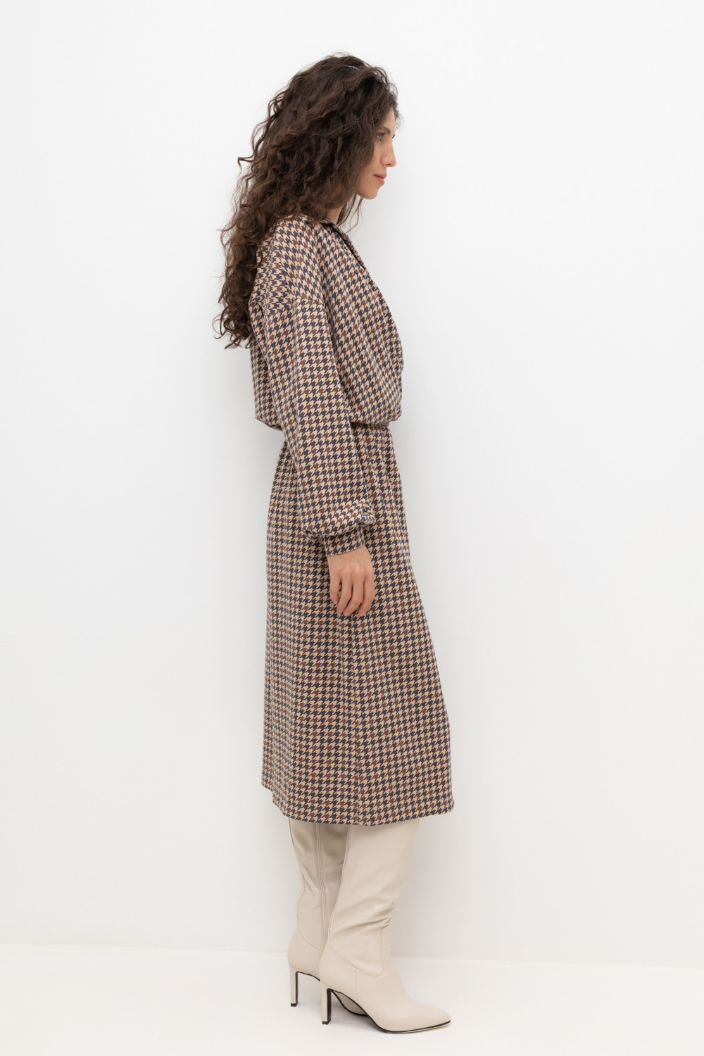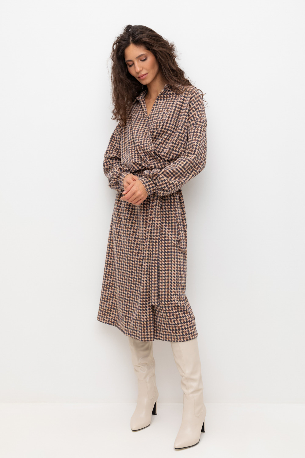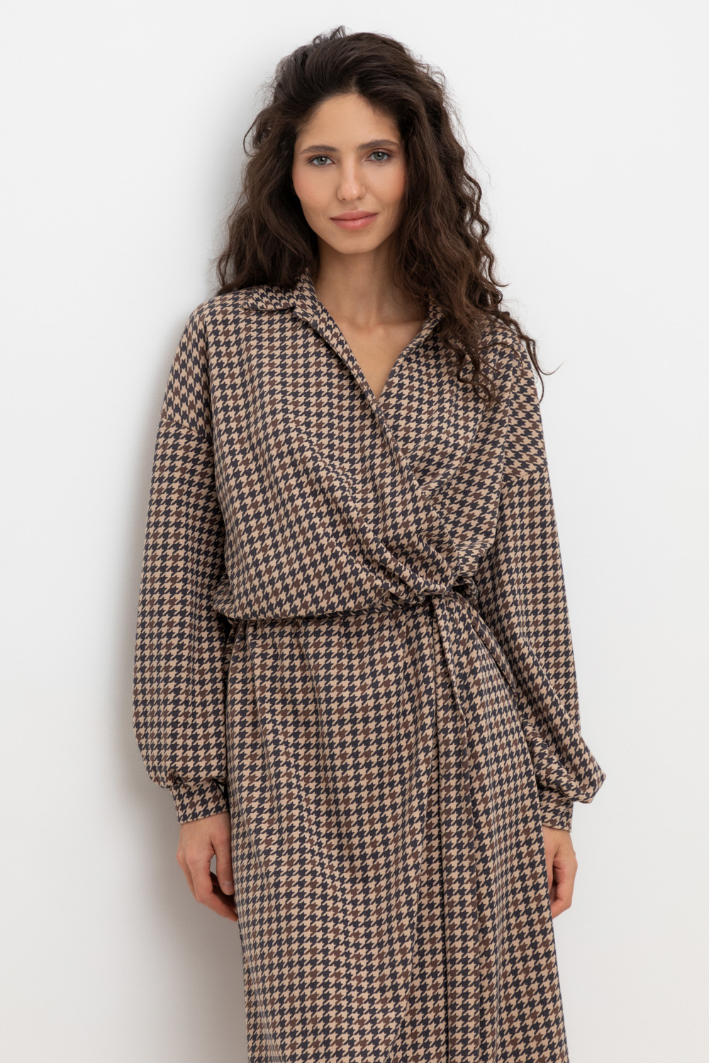 Платье на запах с воротником из плотного набивного трикотажа интерлок. Модель с длинными объемными рукавами. С помощью пояса можно регулировать посадку и силуэт.