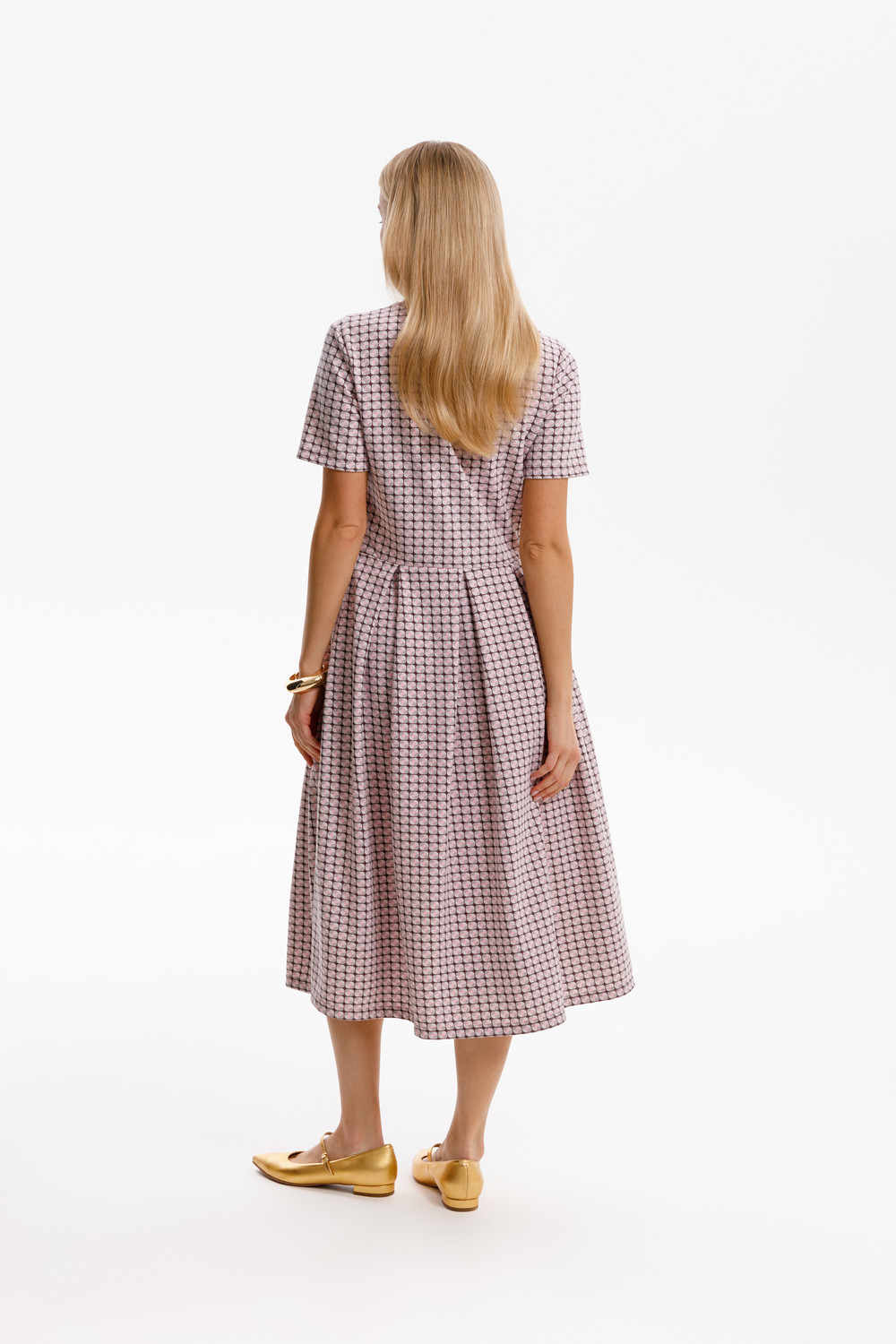 Платье отрезное по талии из премиального трикотажного полотна DOUBLE FACE. Встречные складки на юбке придают изделию женственный и романтичный образ. Яркий геометрический рисунок добавляет летнего настроения. Натуральный состав трикотажа приятен к телу, что делает его комфортным при носке в любое время года