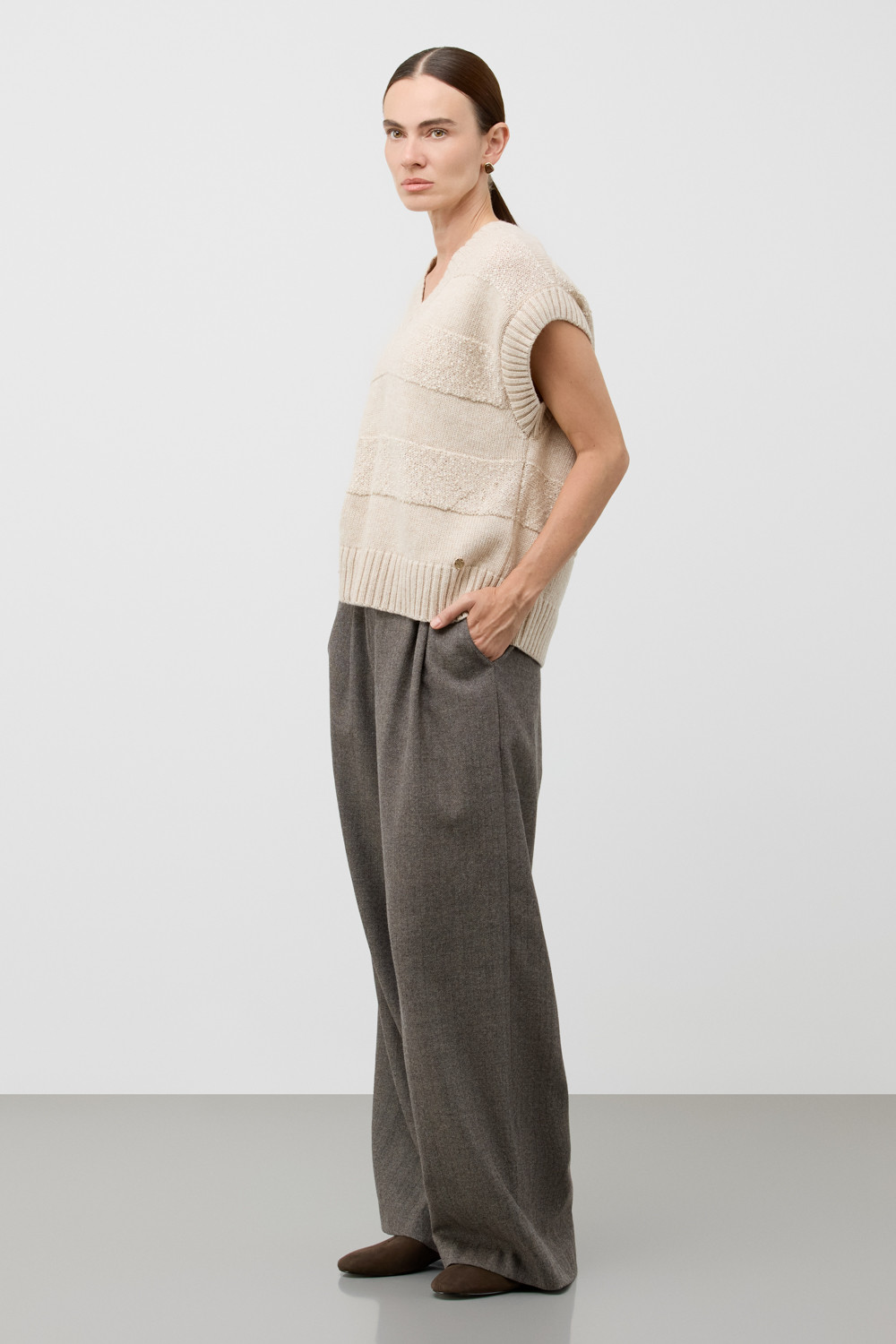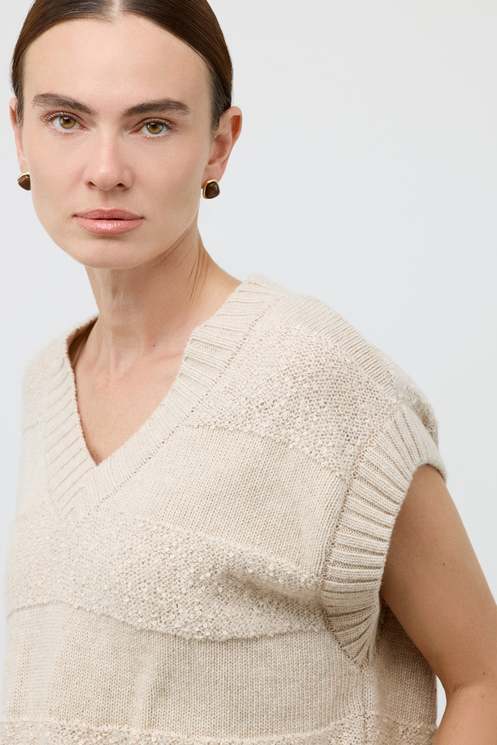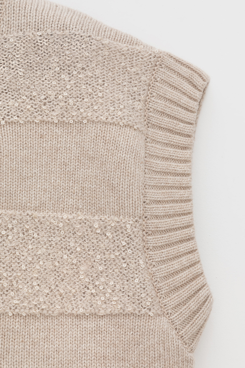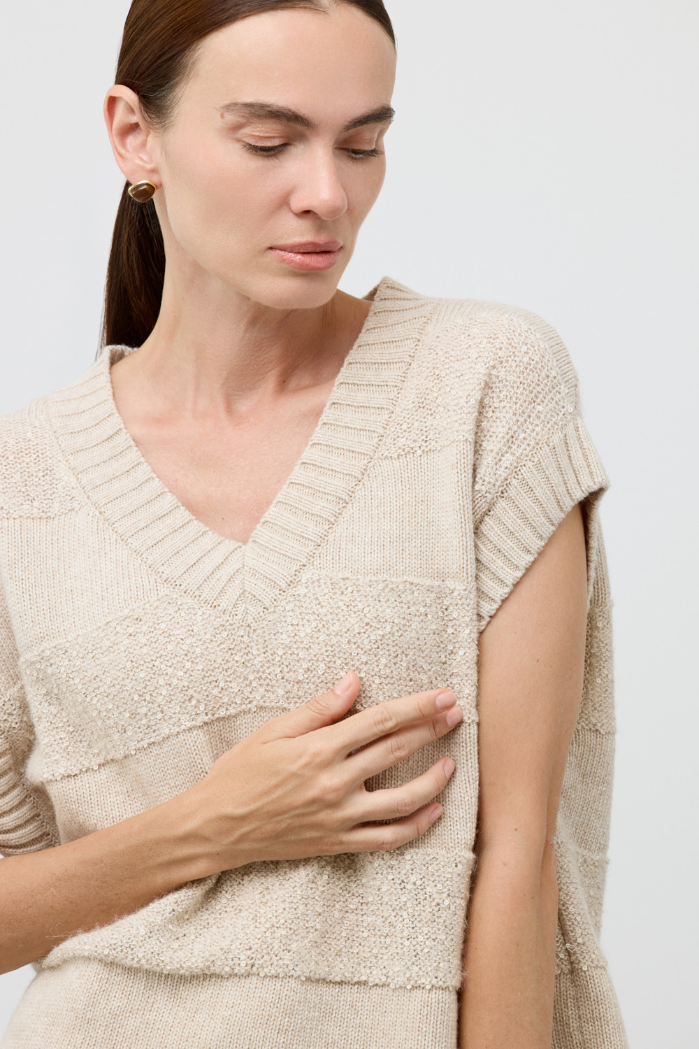 Жилет из изысканной пряжи с пайетками. Уникальное сочетание натуральных волокон обеспечивает непревзойденную мягкость. Меринос отлично удерживает тепло, альпака дарит легкость и воздушность, кашемир придает шелковистость, а вискоза приятный блеск. Нежные пайетки ненавязчиво мерцают при каждом движении, добавляя Вашему образу утонченную элегантность.