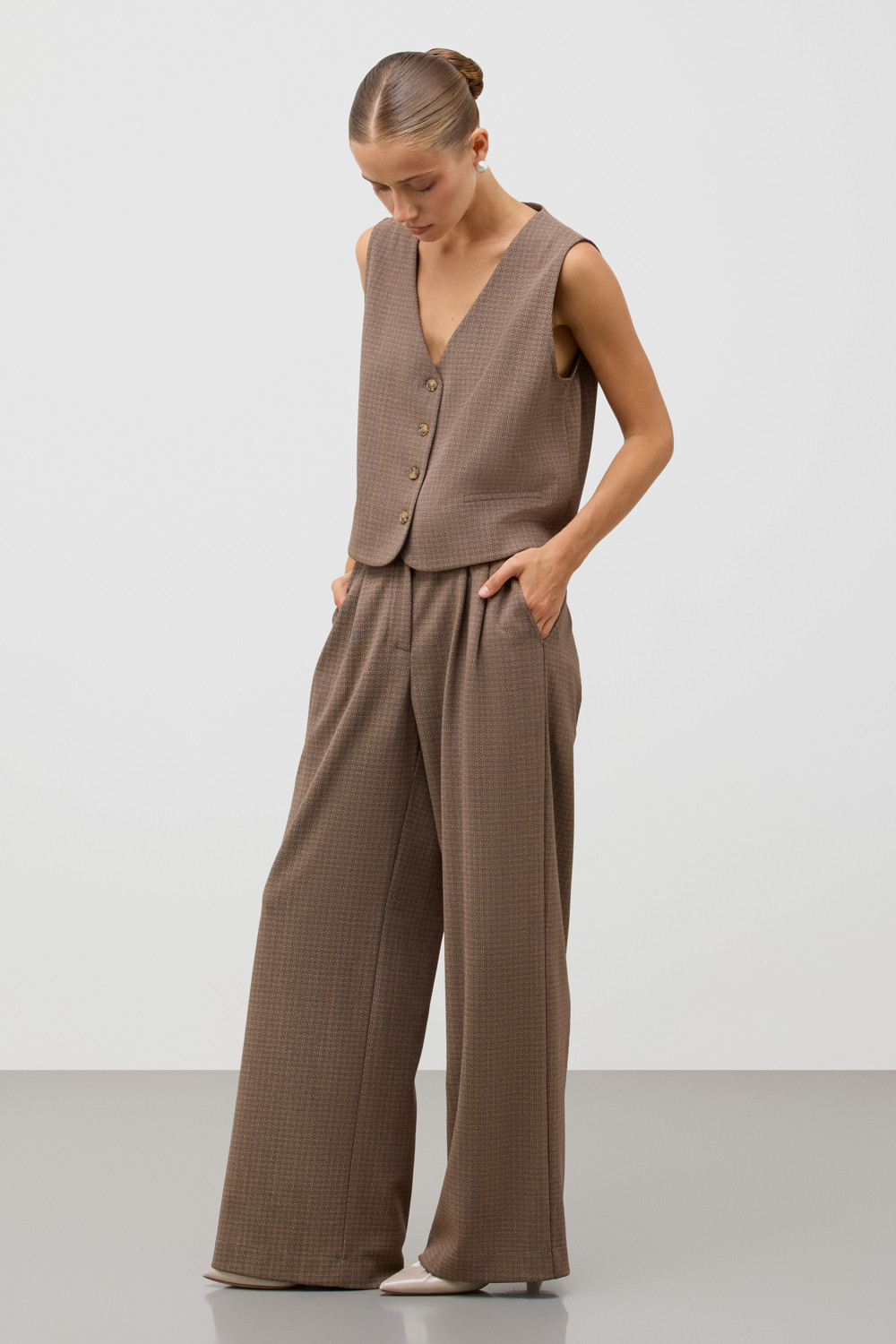 Классический жилет, изготовленый из высококачественного трикотажного полотна DOUBLE FACE. Ткань прошла инновационную силиконовую обработку. Благодаря этой технологии поверхность приобретает невероятно нежную, почти воздушную структуру с легким шелковистым блеском.