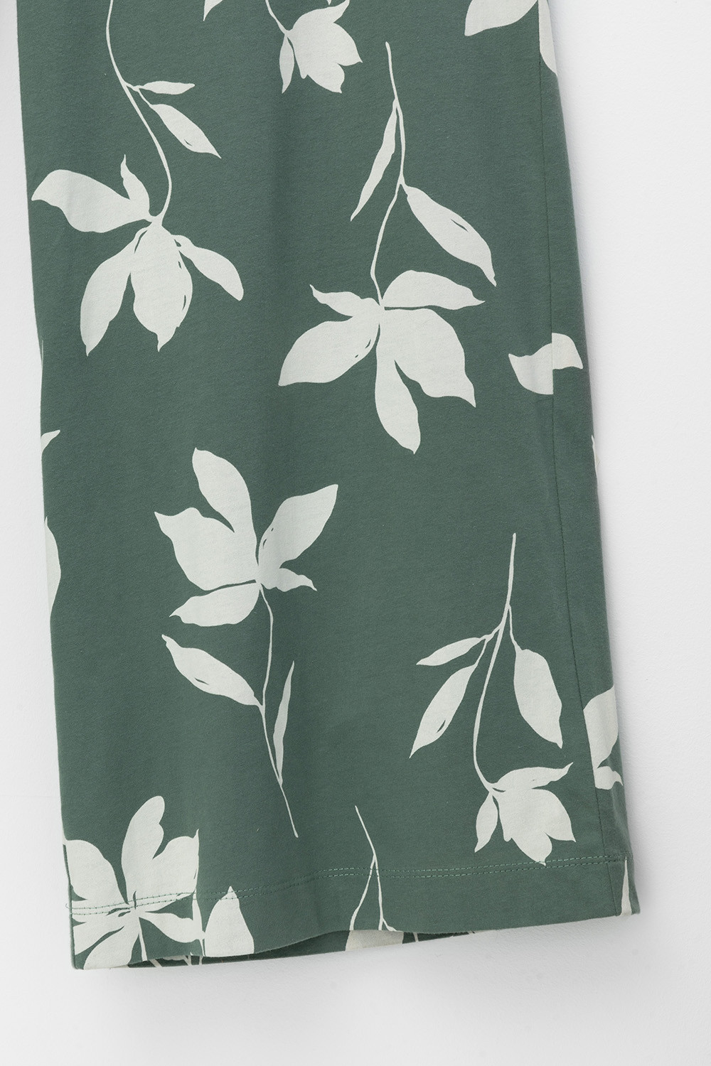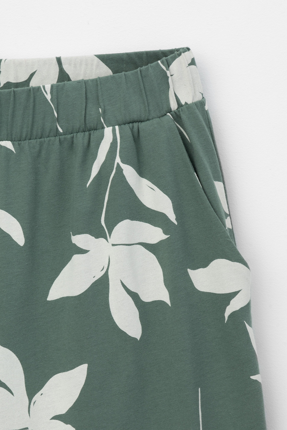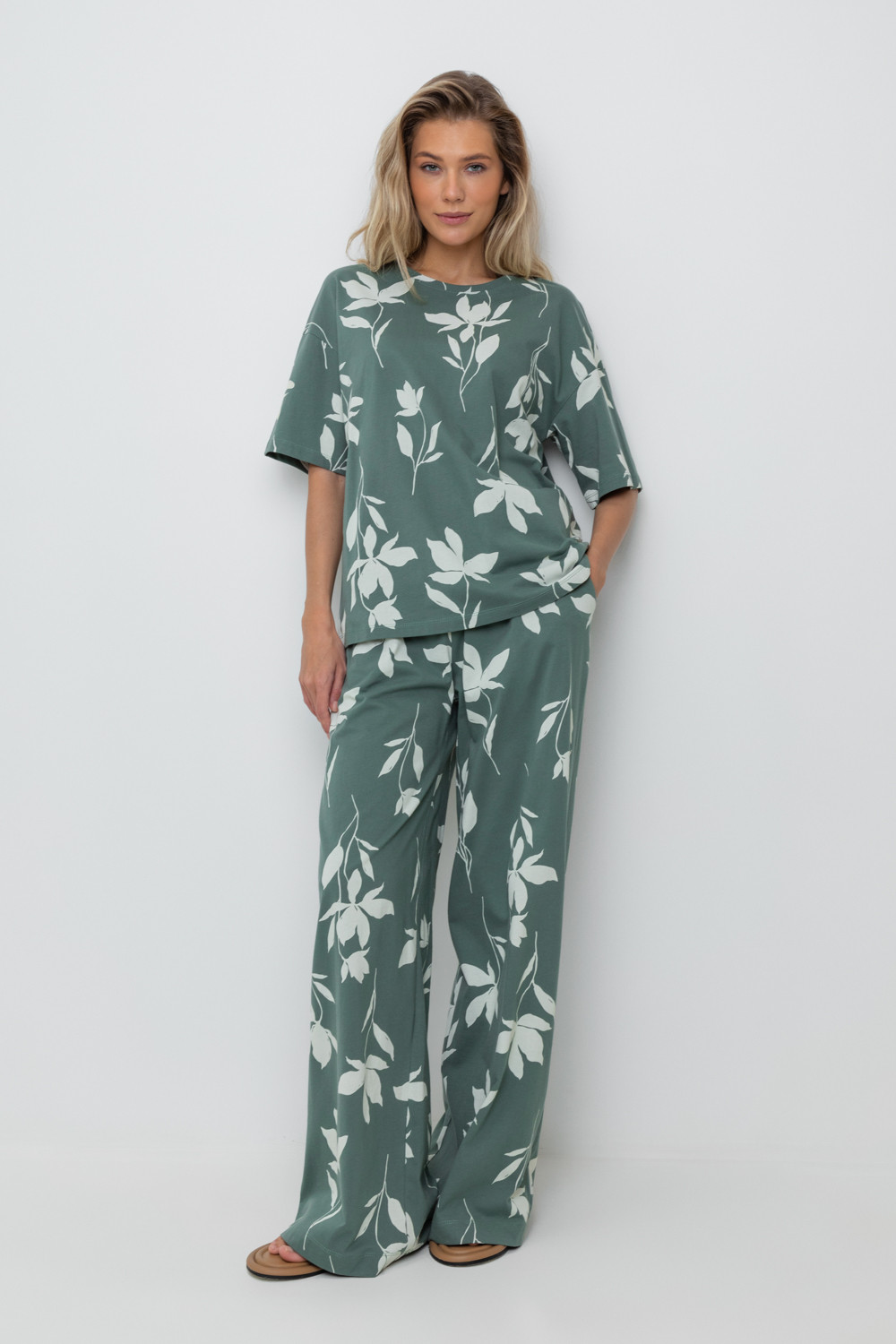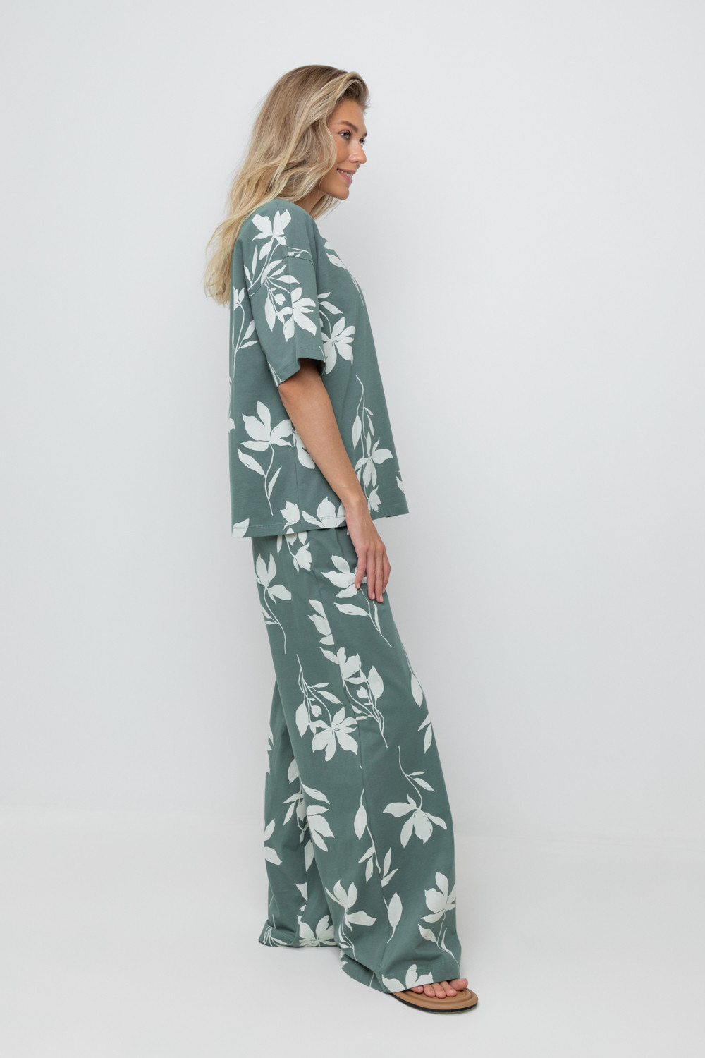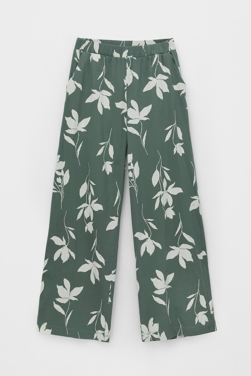 Брюки прямого свободного кроя с боковыми карманами из набивного трикотажа супрем.