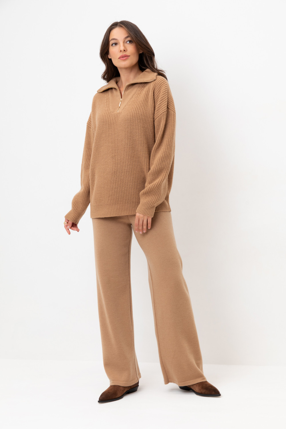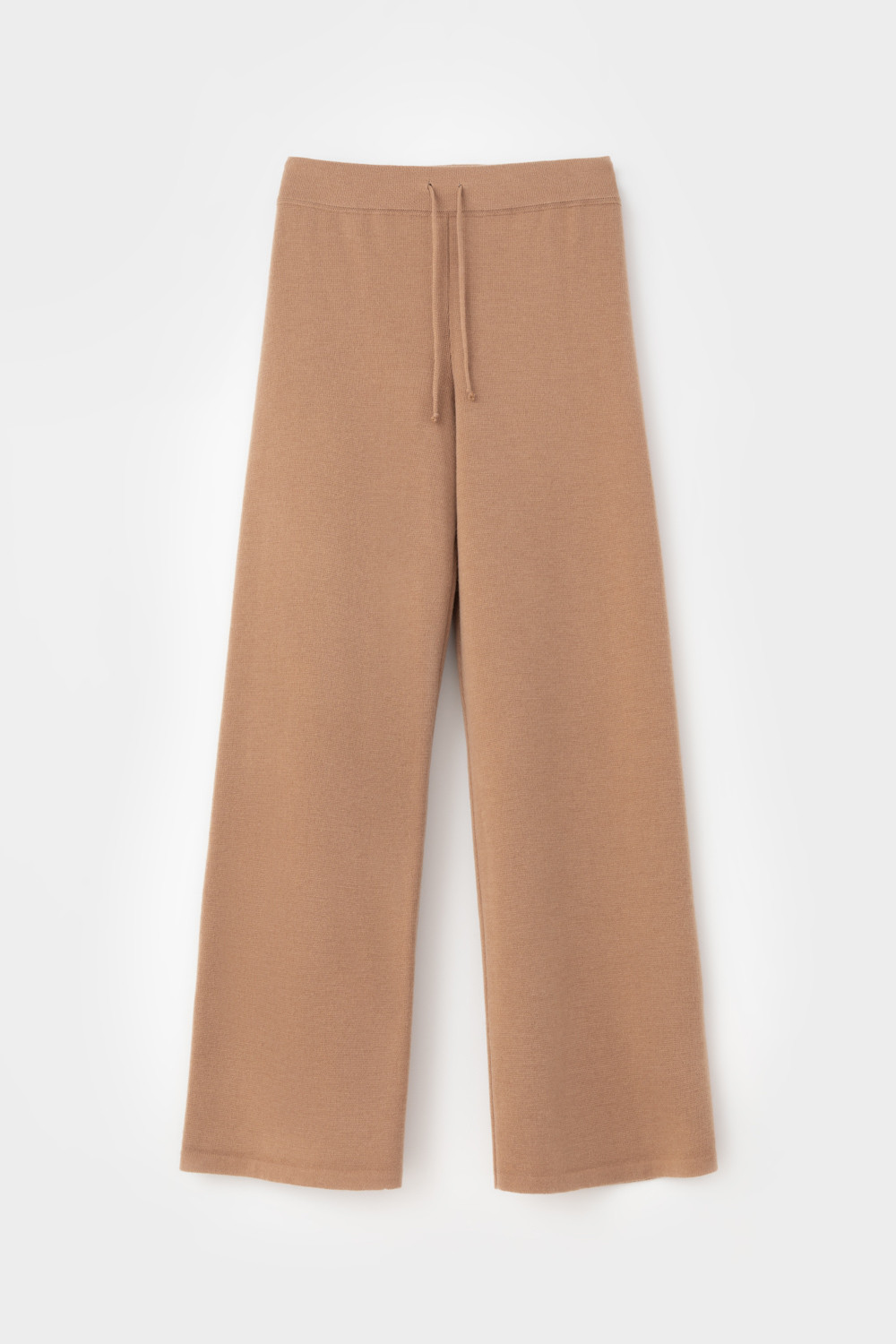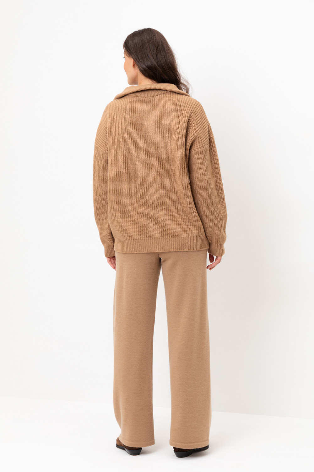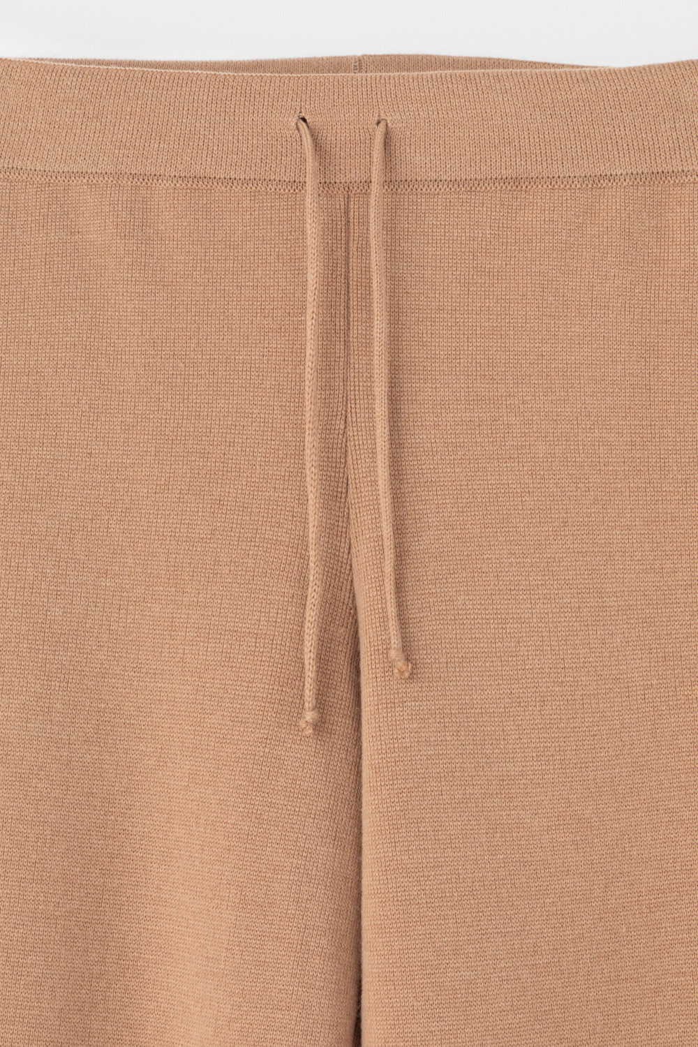 Пояс регулируется вязаным шнуром в тон брюк. Плотная фактура вязания согревает и сохраняет форму во время носки.