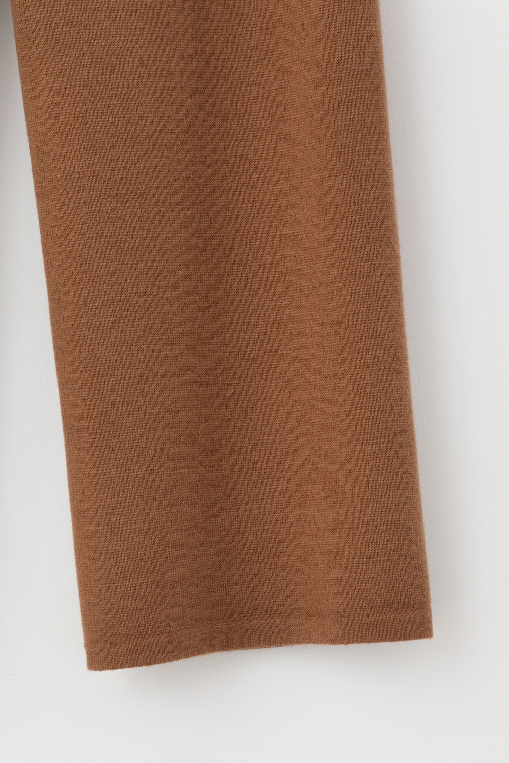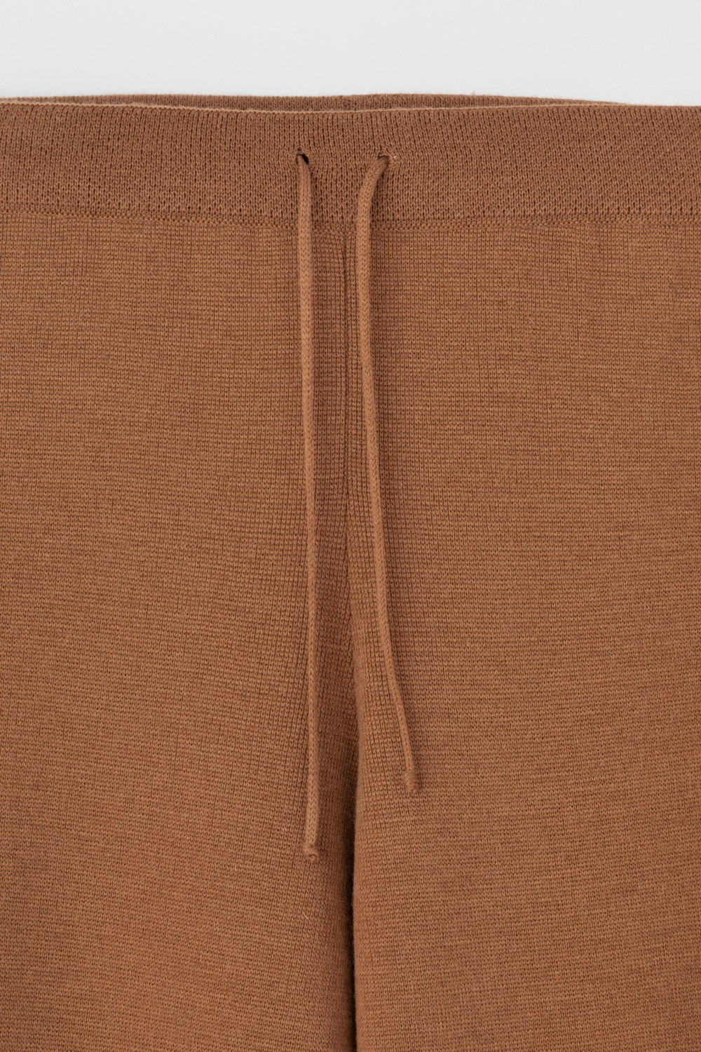 Пояс регулируется вязаным шнуром в тон брюк. Плотная фактура вязания согревает и сохраняет форму во время носки.