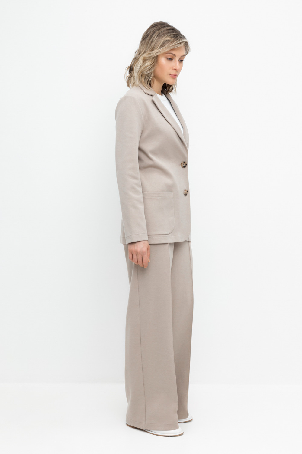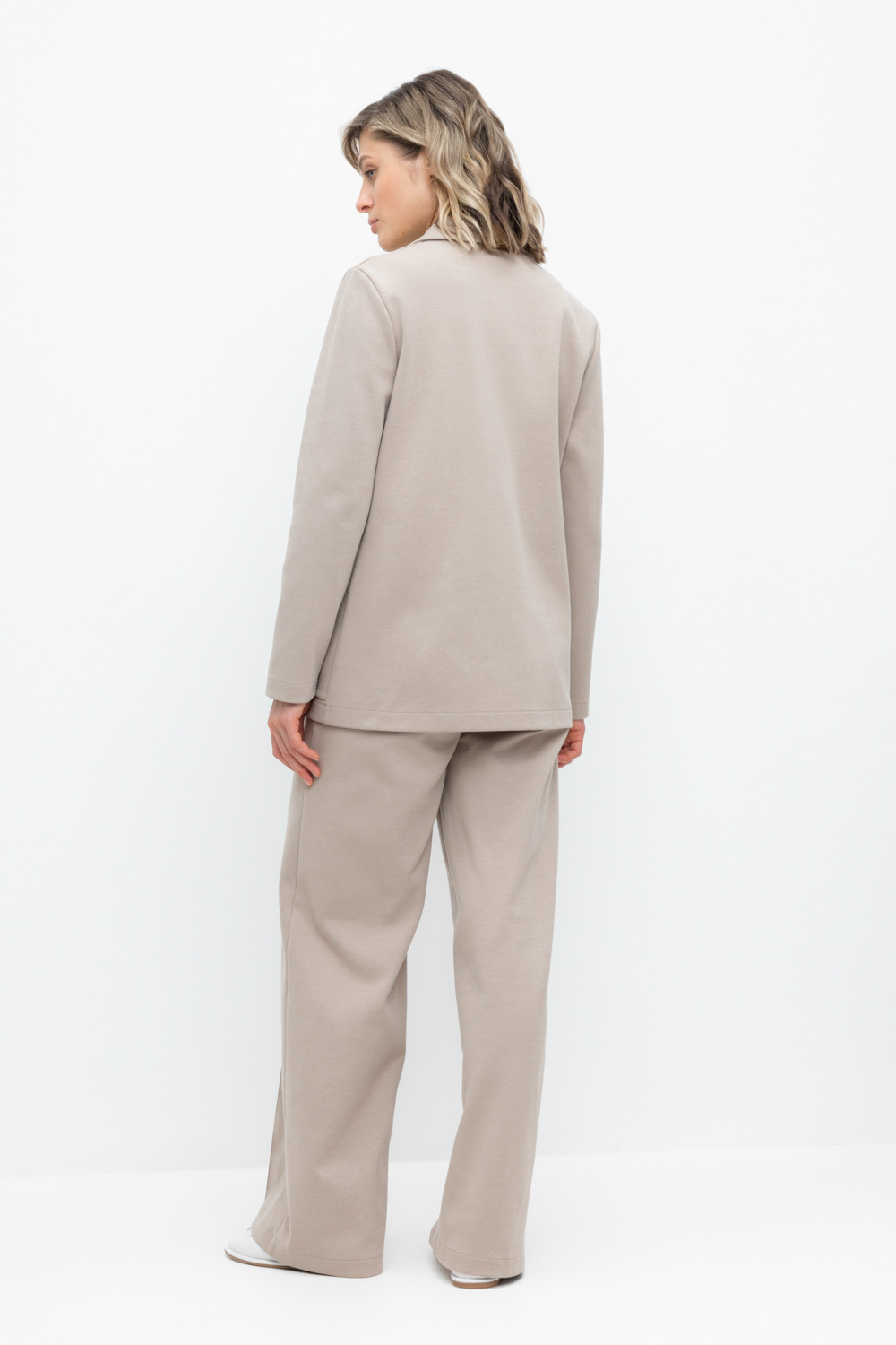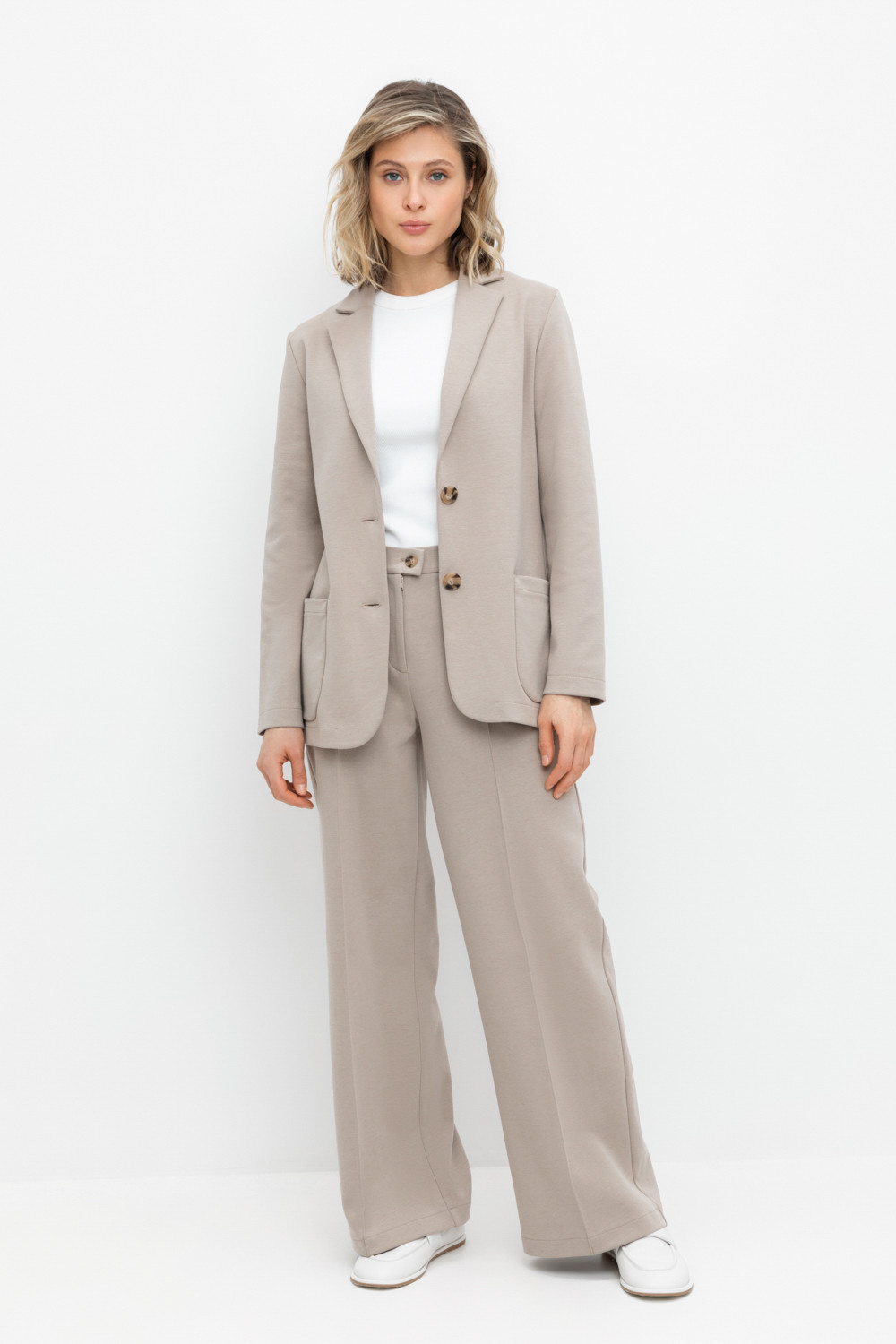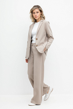 Свободные женские брюки со стрелками и боковыми карманами из плотного гладкого трикотажа интерлок. Застегиваются на молнию и кнопку. Низ обработан плоскими швами.