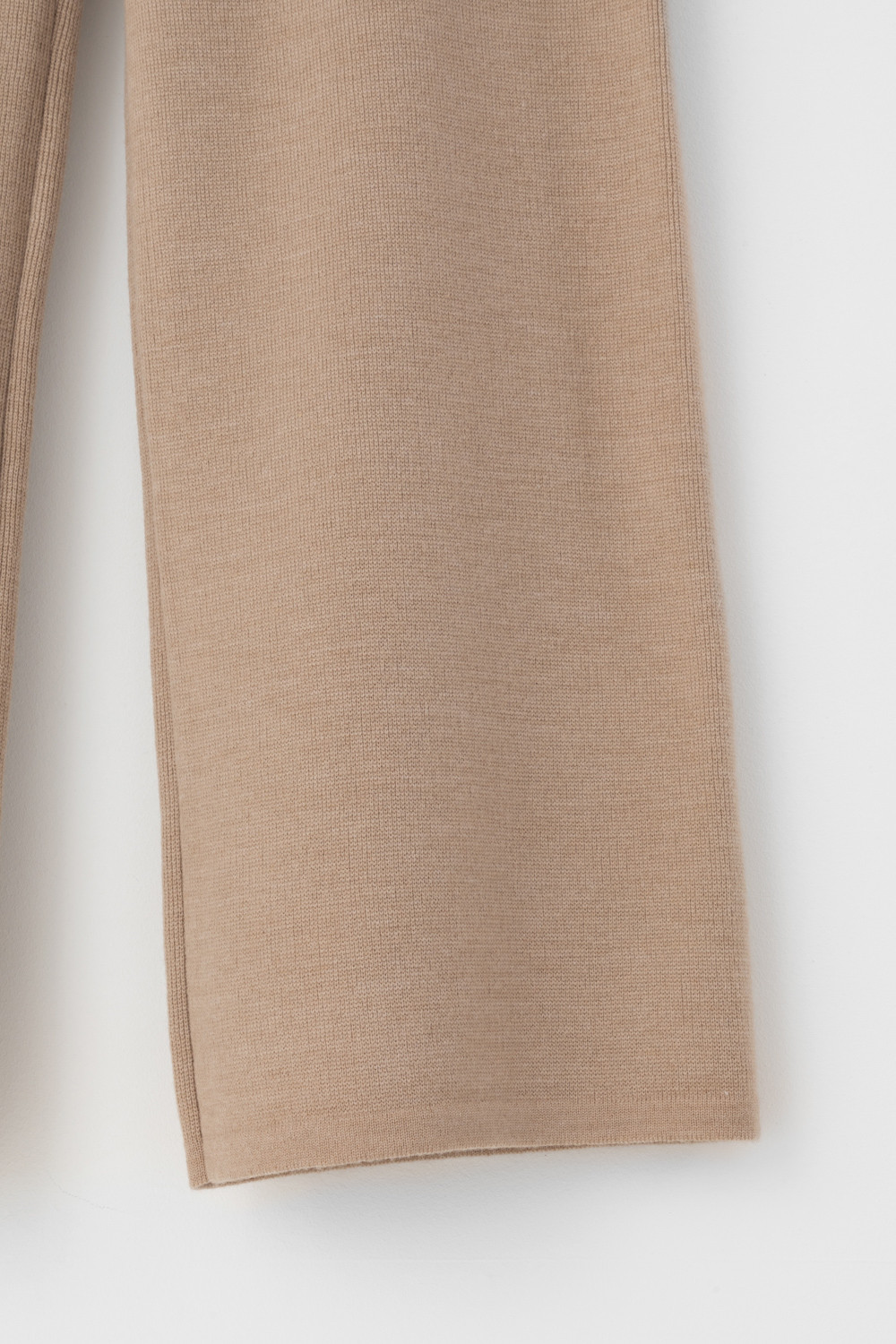 Пояс регулируется вязаным шнуром в тон брюк. Плотная фактура вязания согревает и сохраняет форму во время носки.