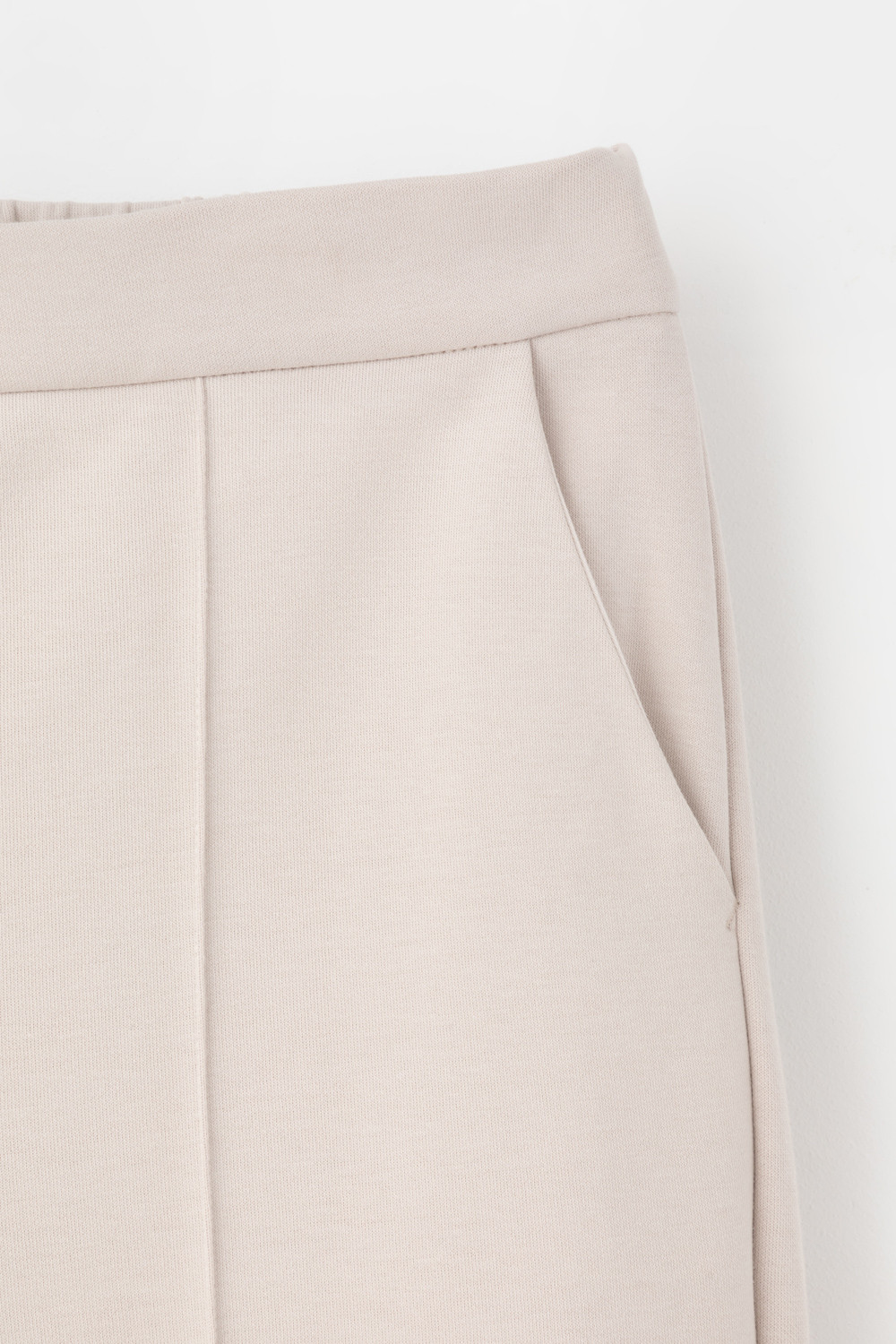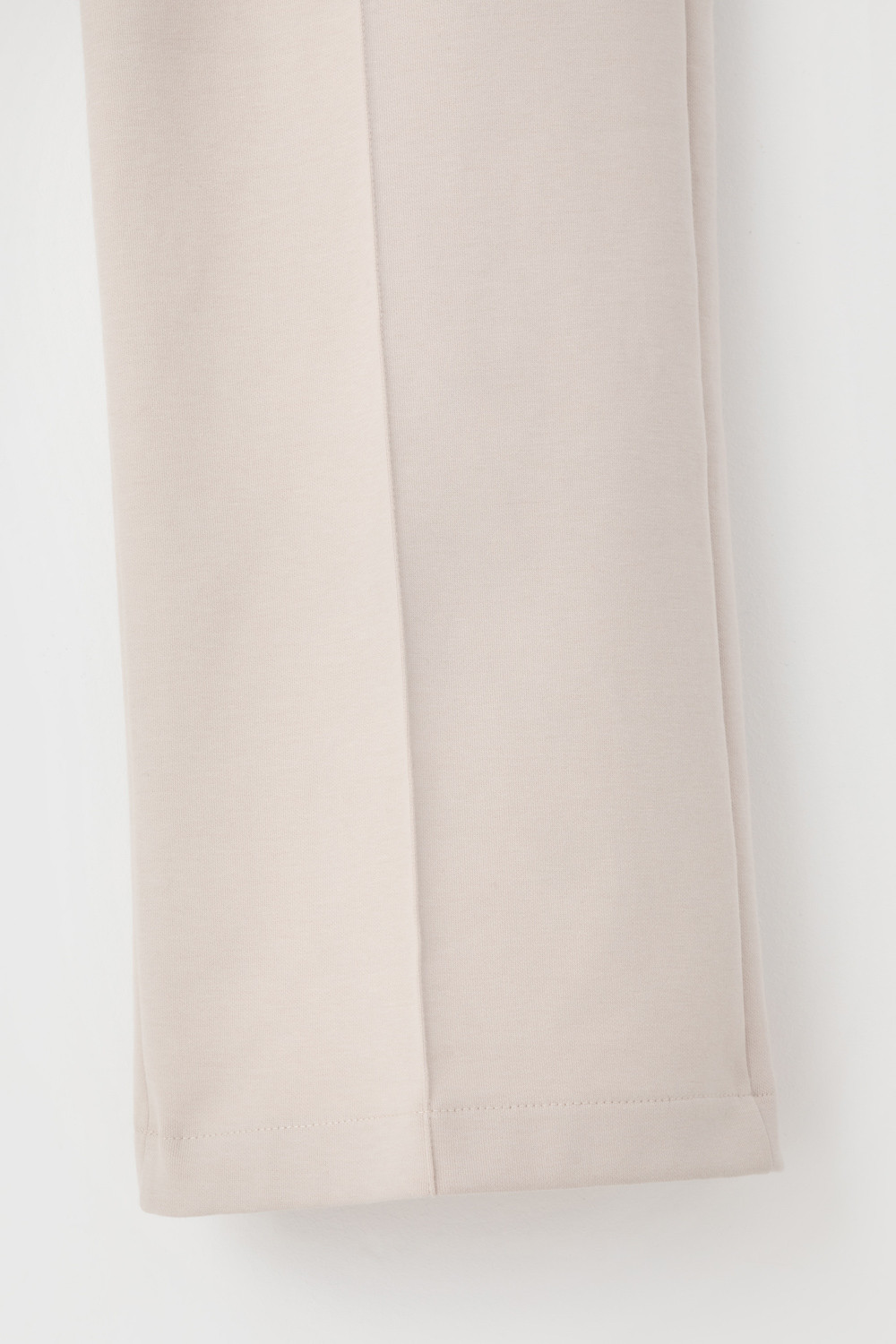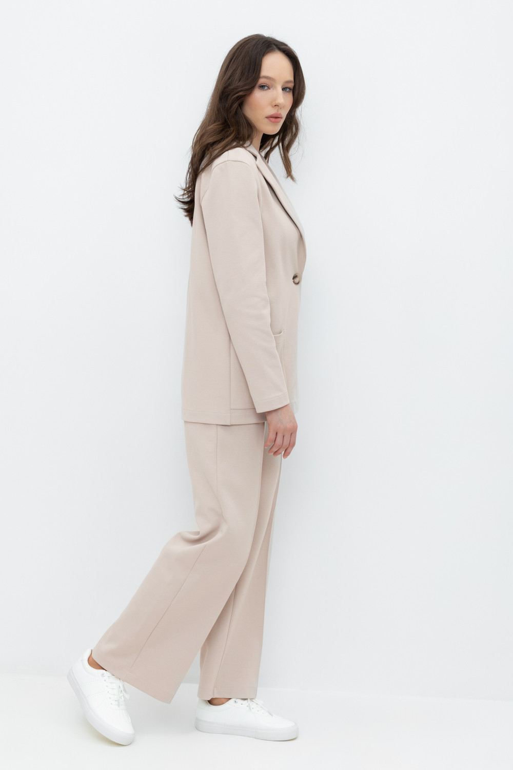 Свободные женские брюки со стрелкой и боковыми карманами из плотного гладкого трикотажа интерлок. Застежка на кнопку. Низ обработан плоскими швами.