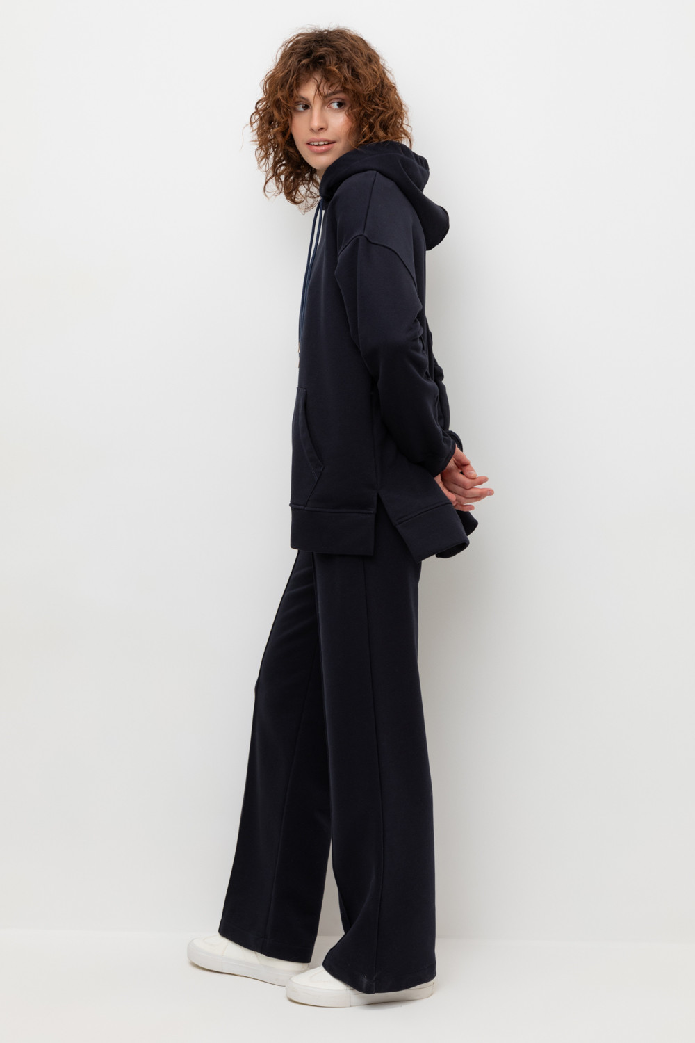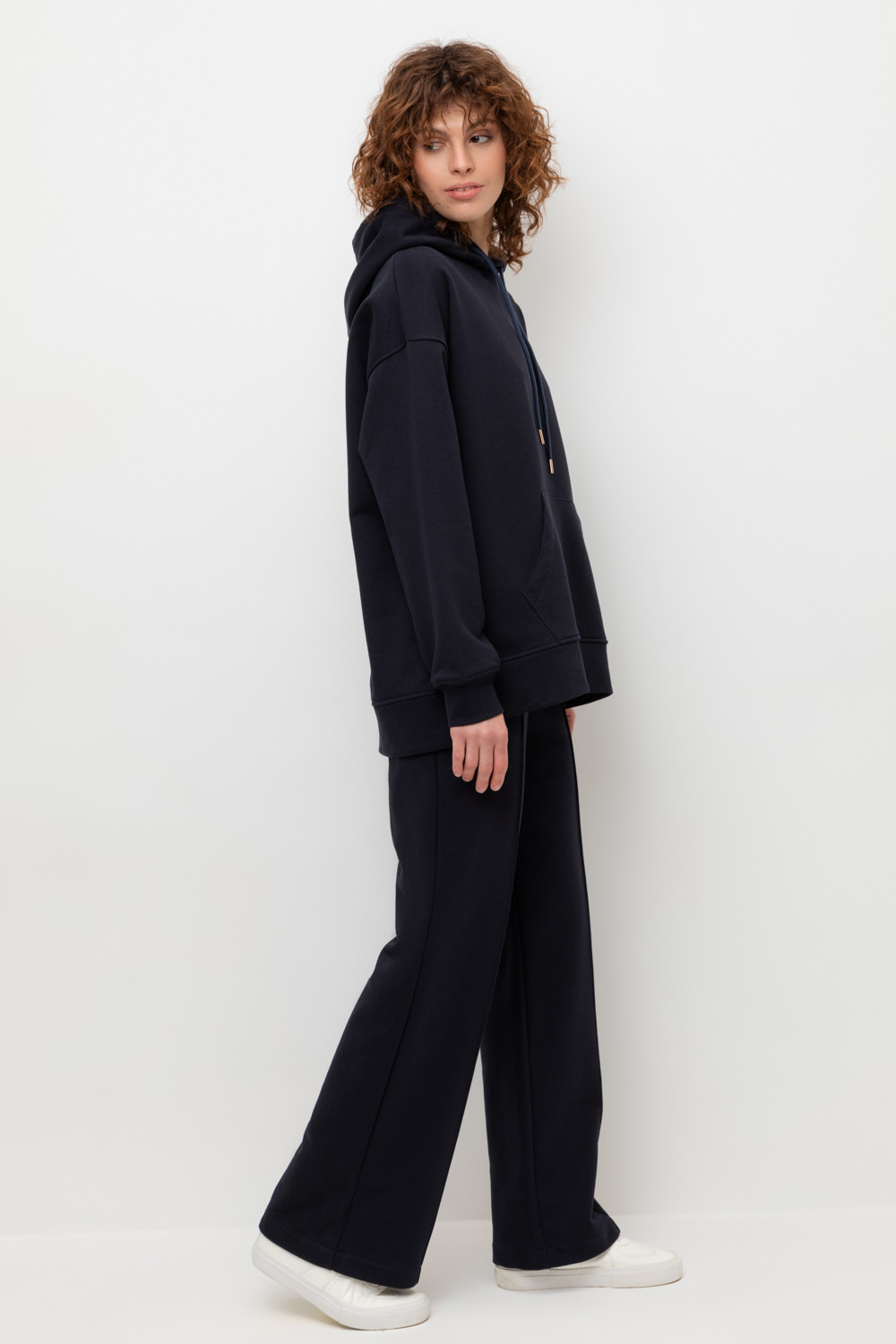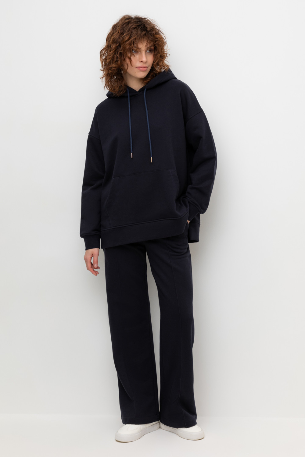 Брюки прямого кроя со стрелкой и боковыми карманами из мягкого петельчатого футера. В составе 80% натурального хлопка и 20% полиэстера, при этом полиэстер ввязан внутрь по особой технологии и не соприкасается с кожей. Пояс со шнурком позволяет регулировать посадку. Идеальный и комфортный вариант на каждый день.