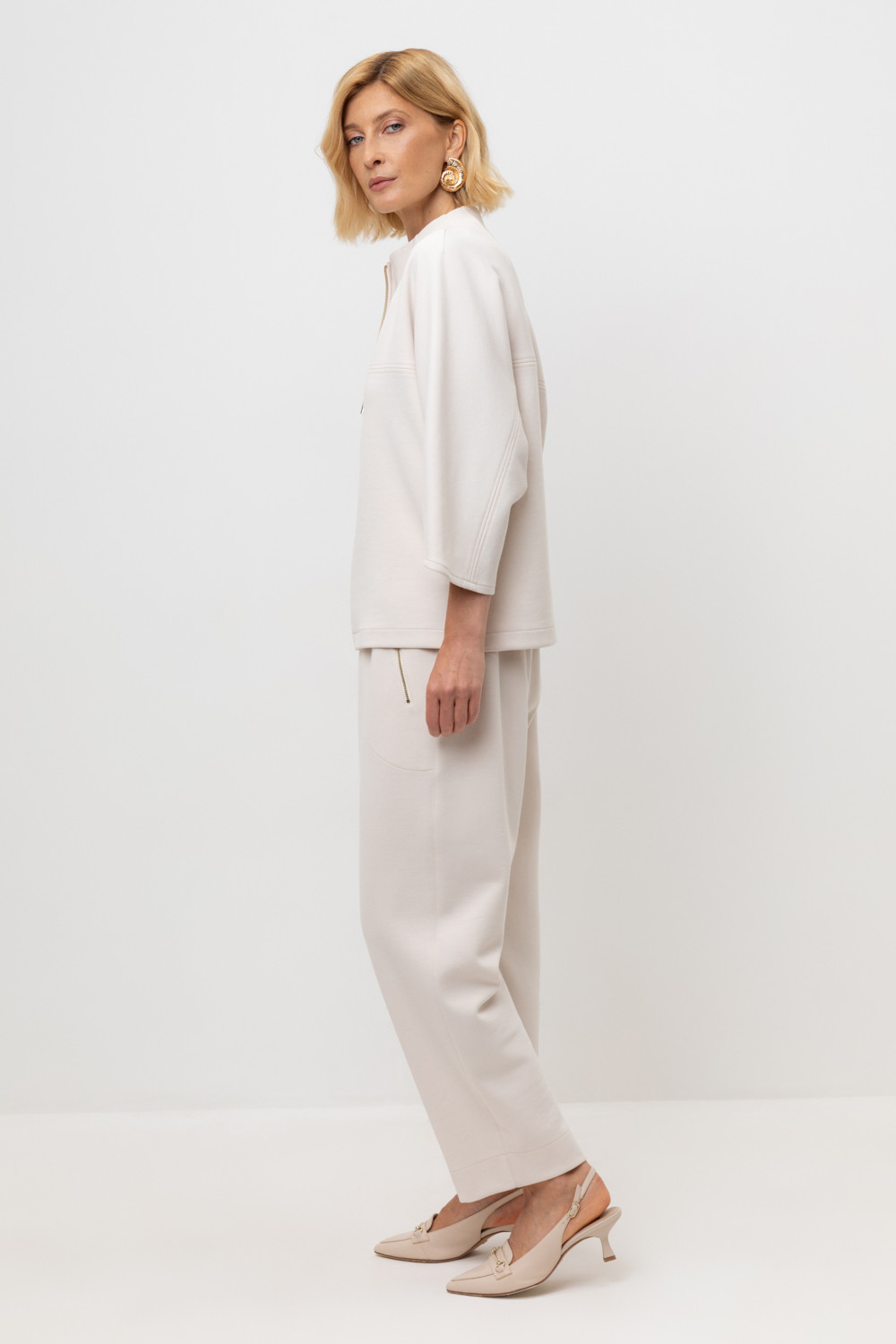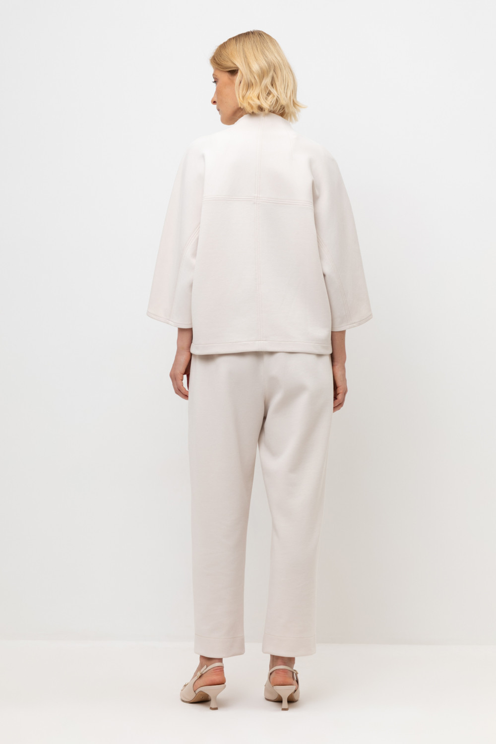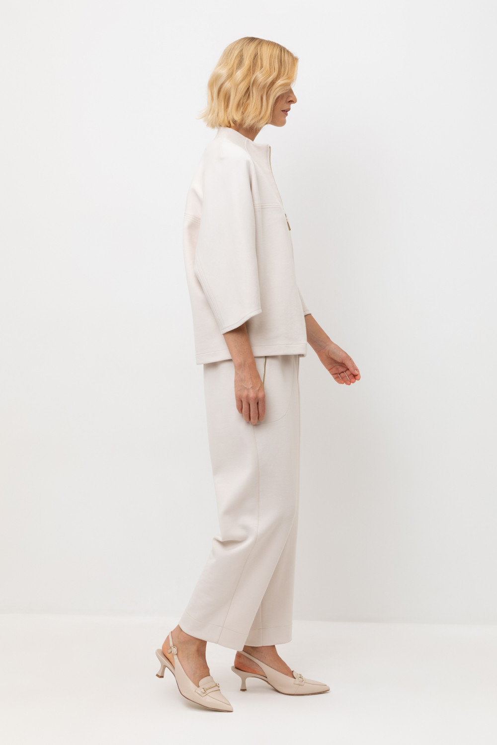 Брюки из высококачественного трикотажного полотна. За счет фактуры переплетения и специальных обработок сохраняют силуэт и форму. Хлопок в составе добавляет комфорт при носке. Эластичный пояс регулируемый шнуром обеспечивает идеальную посадку. В сочетании с жакетом из этой коллекции вы создадите расслабленный образ для летних дней.