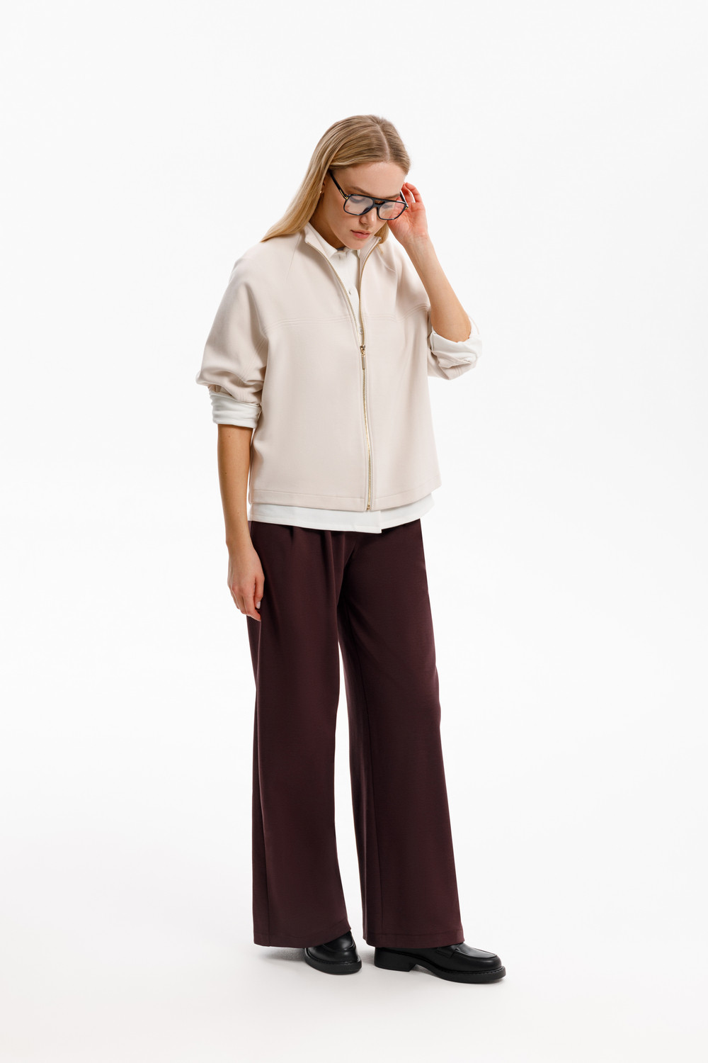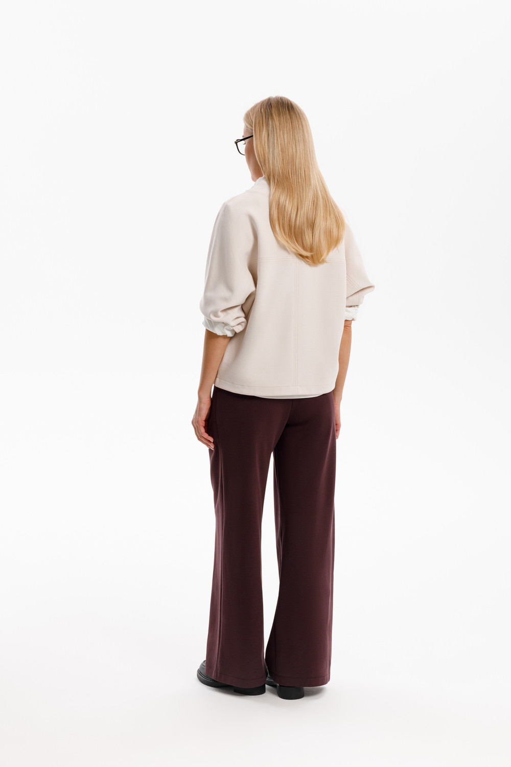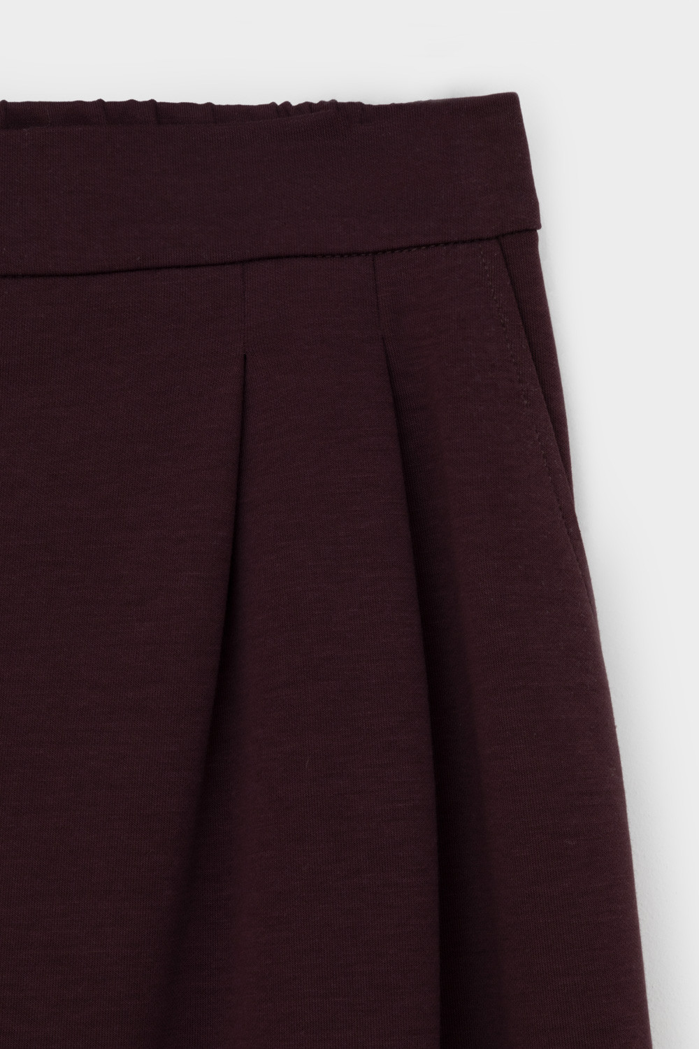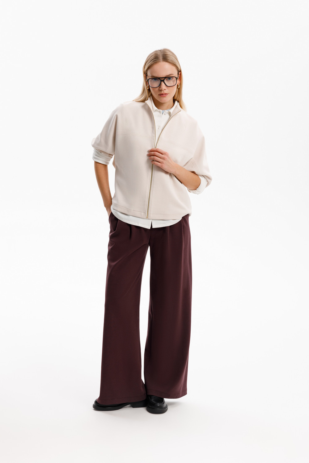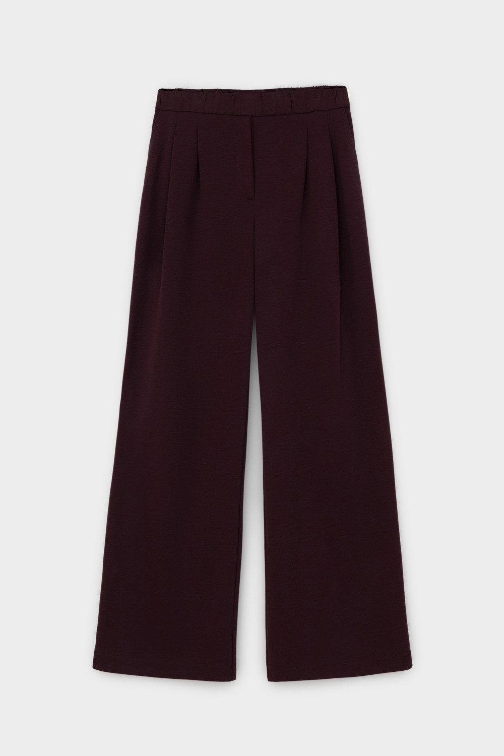 Брюки с защипами на талии, изготовленные из премиального трикотажа DOUBLE FACE, дарят ощущение комфорта и легкости. Складки спереди придают изделию свободный силуэт.