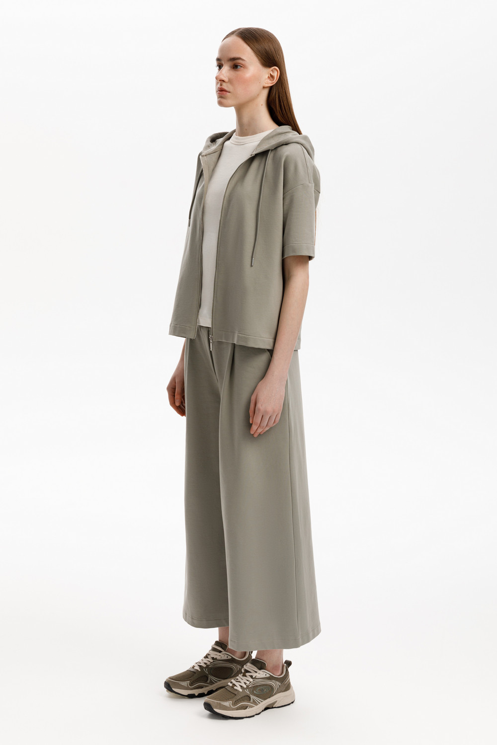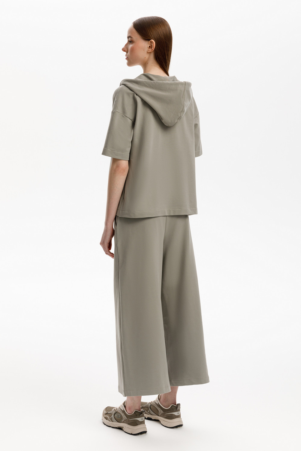Широкие укороченные брюки из мягкого эластичного футера создают непринужденный образ. Высокий пояс с имитацией застежки и защипы придают брюкам расслабленный стиль. Подарите себе комфорт и свободу с нашим качеством.