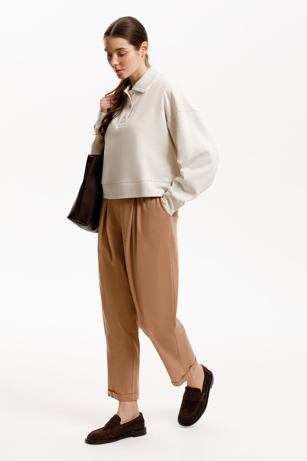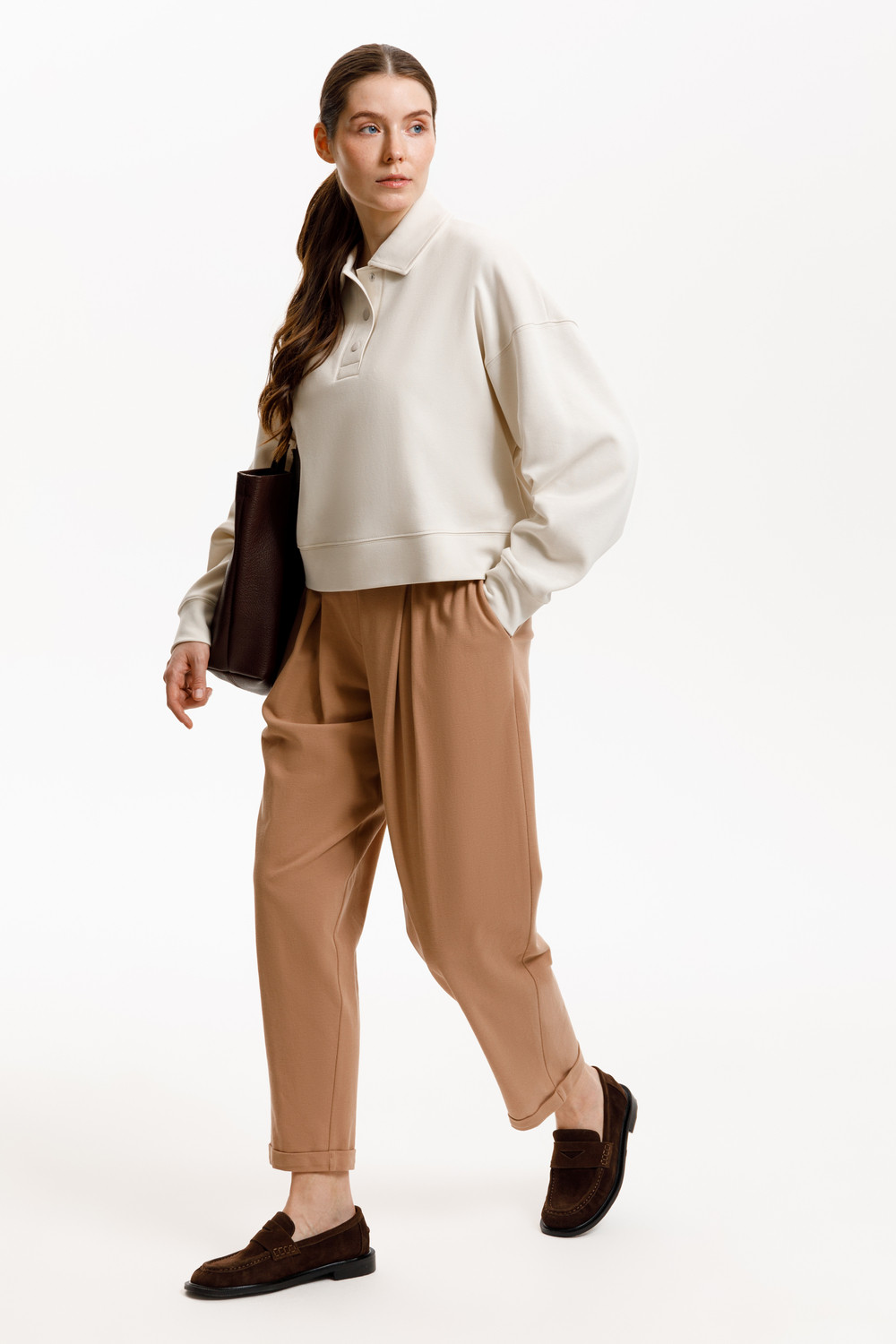 Трикотажные брюки с эластичным поясом, изготовленные из 100% хлопка, дарят ощущение комфорта и легкости. Имитация застежки и складки спереди придают изделию свободный силуэт. В сочетании с рубашкой-поло из этой коллекции, вы создадите стильный образ для теплых летних дней.