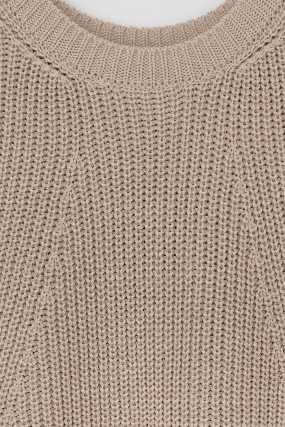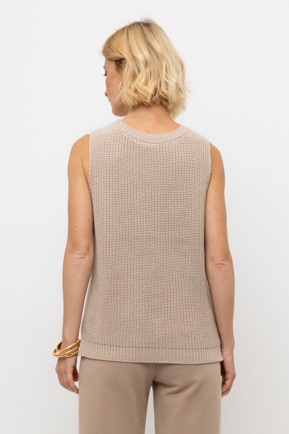 Нежный топ в классическом переплетении нитей цвета беж выполнен из итальянской хлопковой пряжи. Лаконичный стиль топа позволяет сочетать его в разных образах.