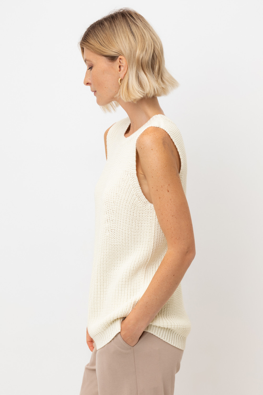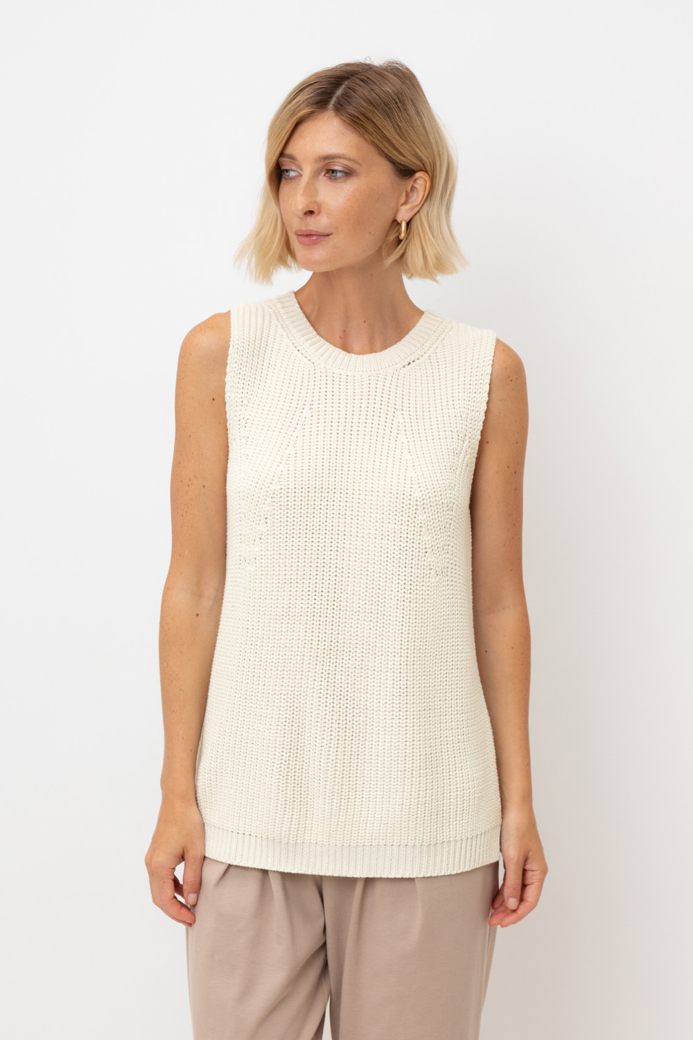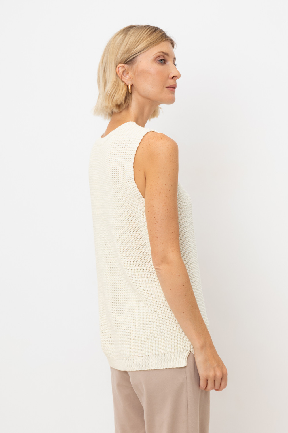 Нежный топ в классическом переплетении нитей молочного цвета выполнен из итальянской хлопковой пряжи. Лаконичный стиль топа позволяет сочетать его в разных образах.