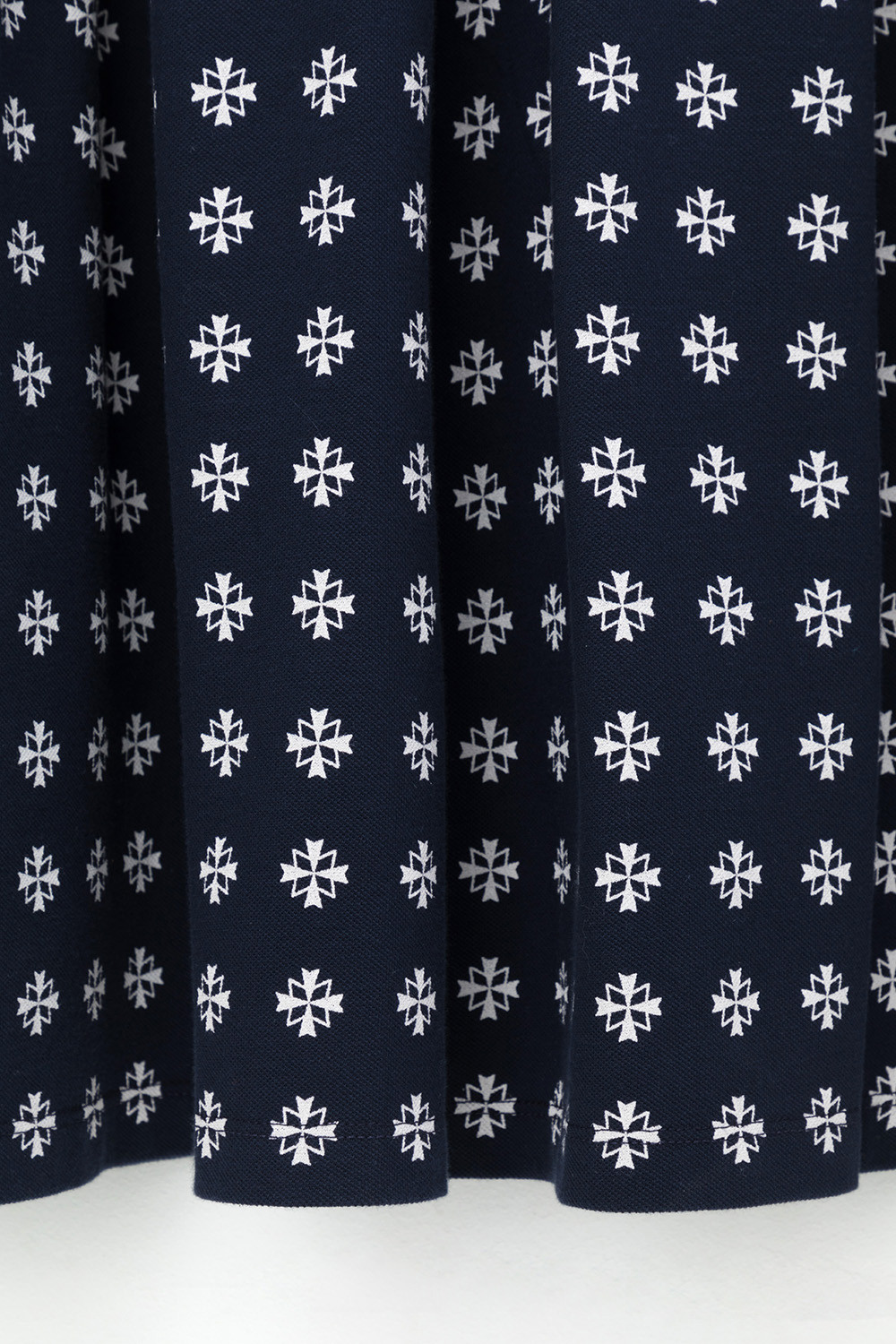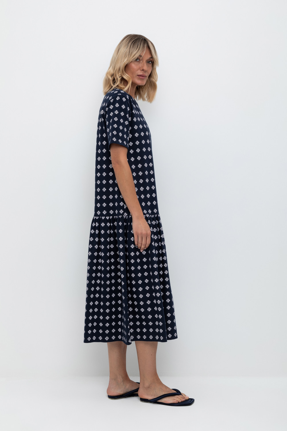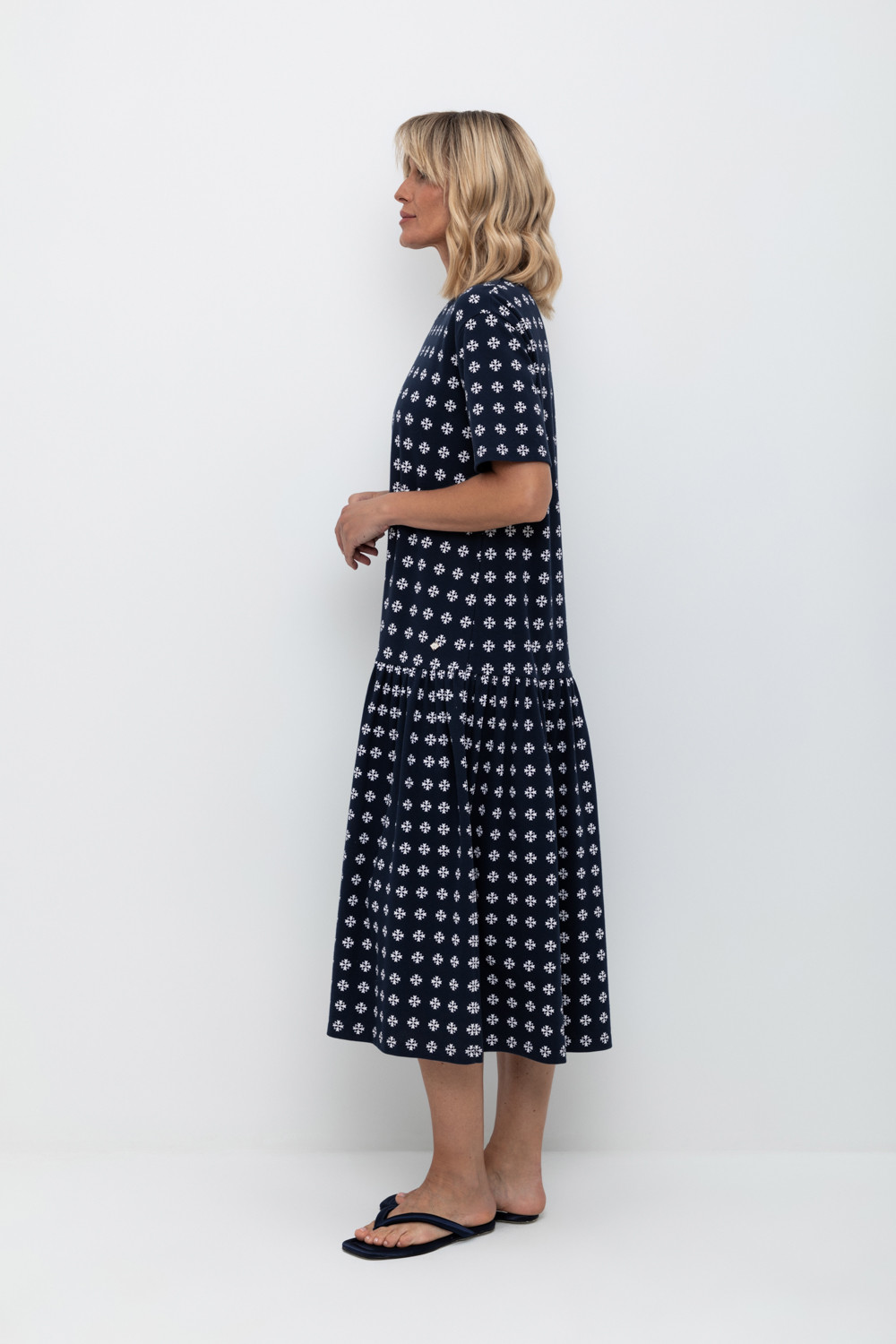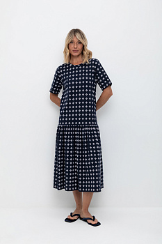 Трикотажное платье с воланом из набивного пике из длинноволокнистого гребенного хлопка. Спущенное плечо придает изделию свободный силуэт.
