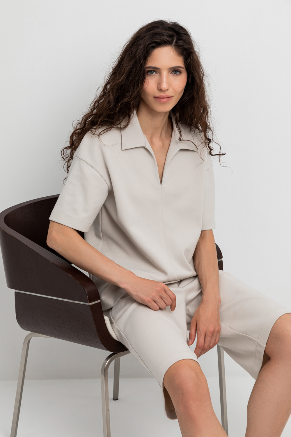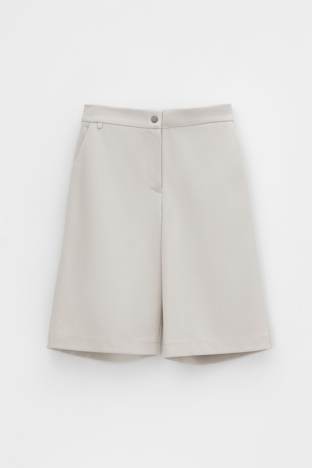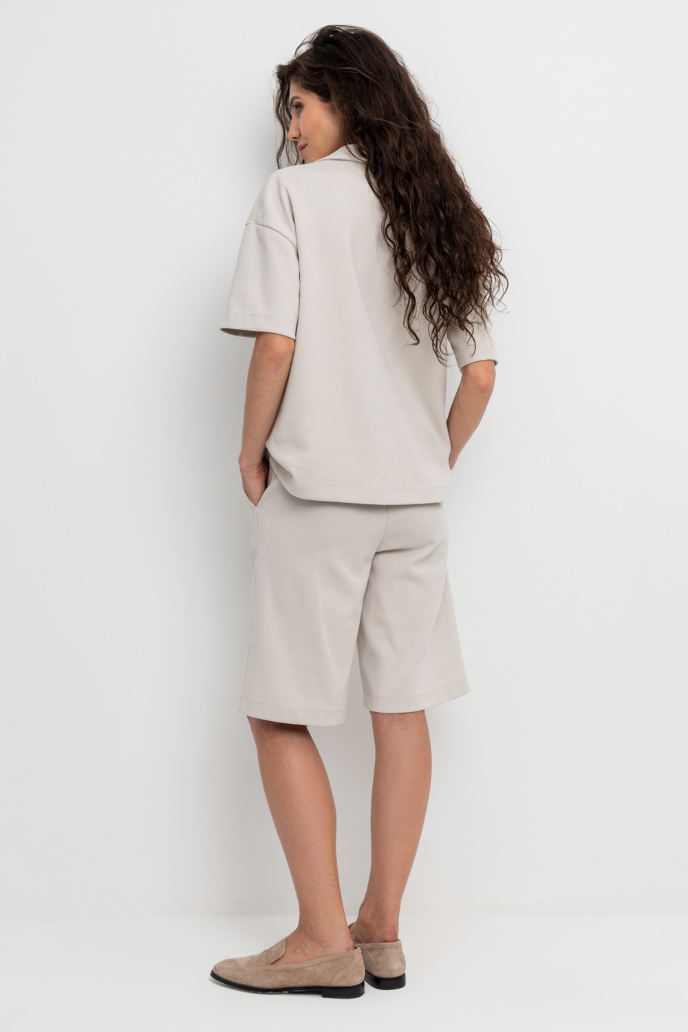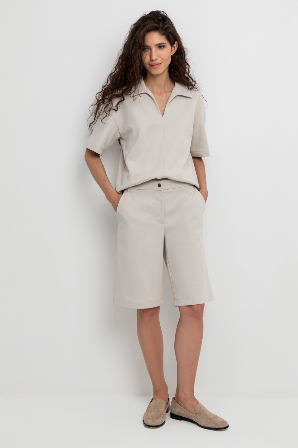 Удлиненные женские шорты из плотного гладкого трикотажа интерлок с удобными боковыми карманами и застежкой на молнию и кнопку. Низ обработан плоскими швами.