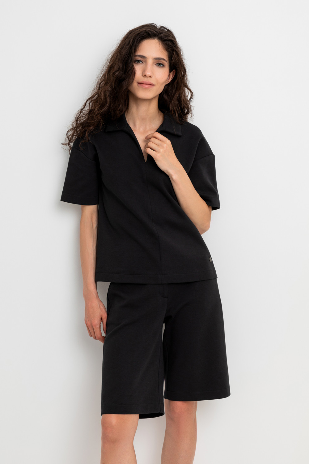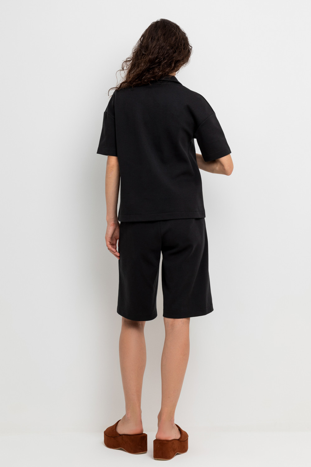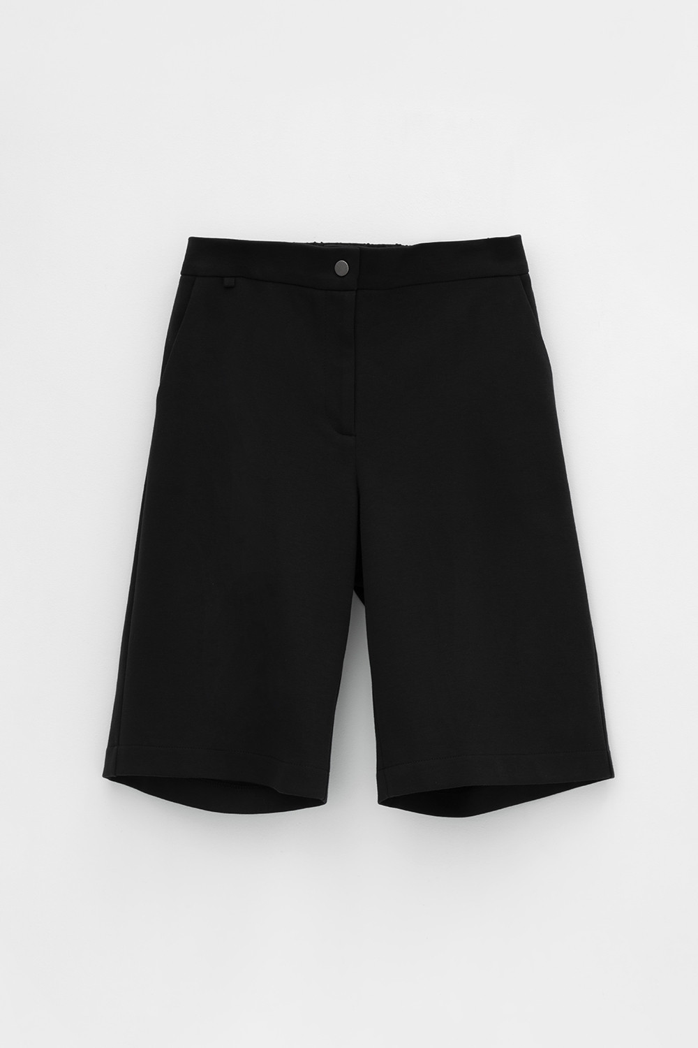 Удлиненные женские шорты из плотного гладкого трикотажа интерлок с удобными боковыми карманами и застежкой на молнию и кнопку. Низ обработан плоскими швами.