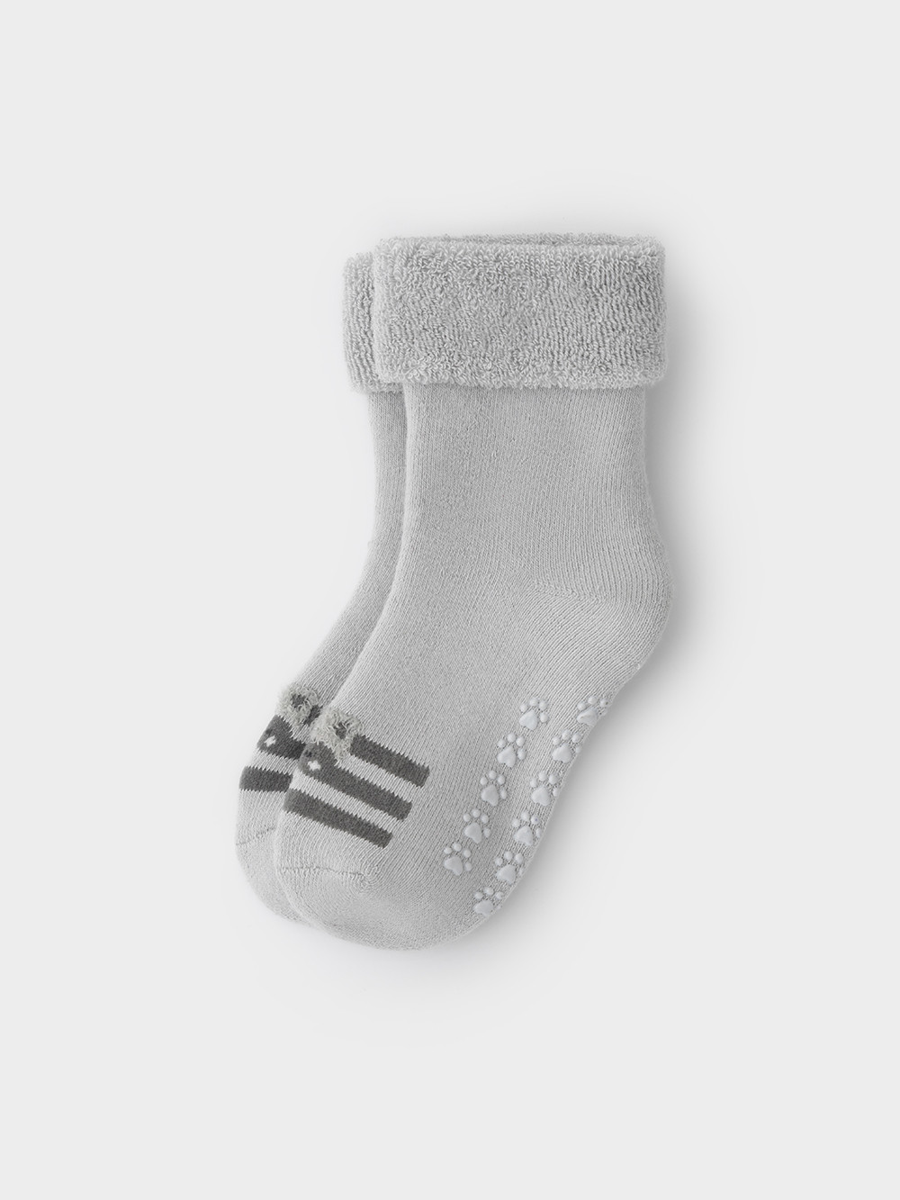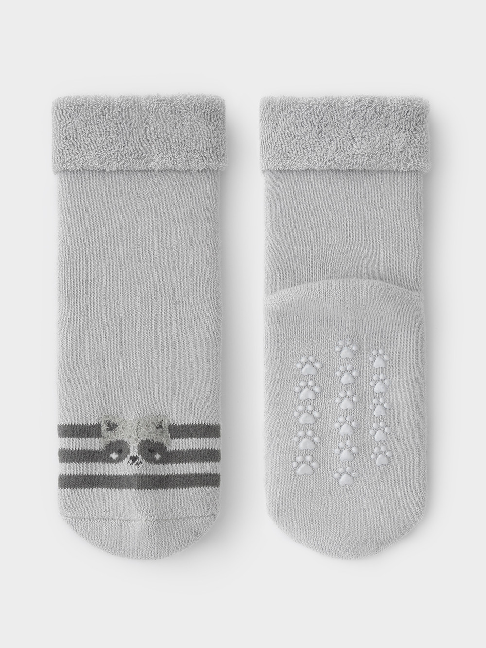 Носки махровые с формованной пяткой и отворотом по краю. На подошве резиновые стопперы. Украшены рисунком. Изделие сохраняет форму и стойкий цвет после многочисленных стирок.