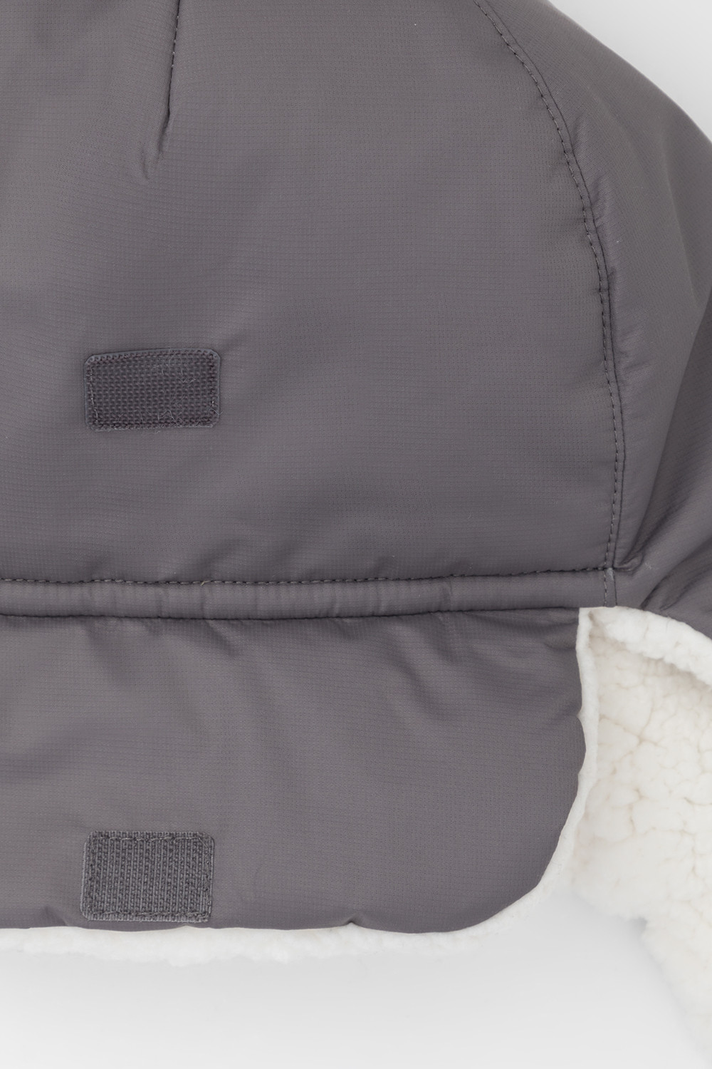 Зимняя шапка детская из однотонной мембранной ткани. Внутри искусственный утеплитель и подклад из мягкого длинноворсового флиса. Застёгивается под подбородком на липучку. Спереди отворот на липучке. На затылке эластичная резинка. Сбоку прикреплён светоотражатель.