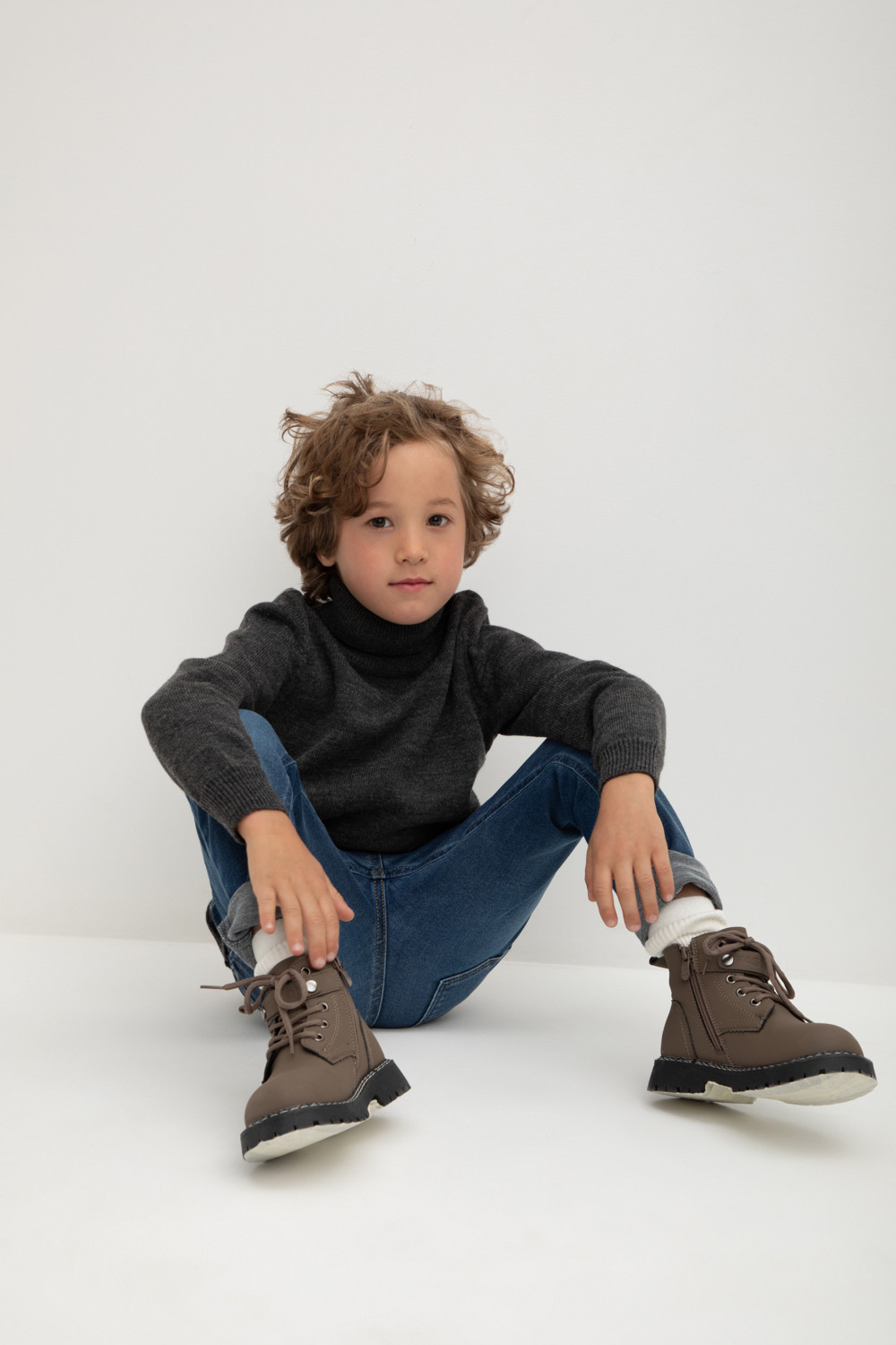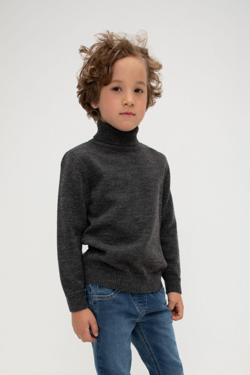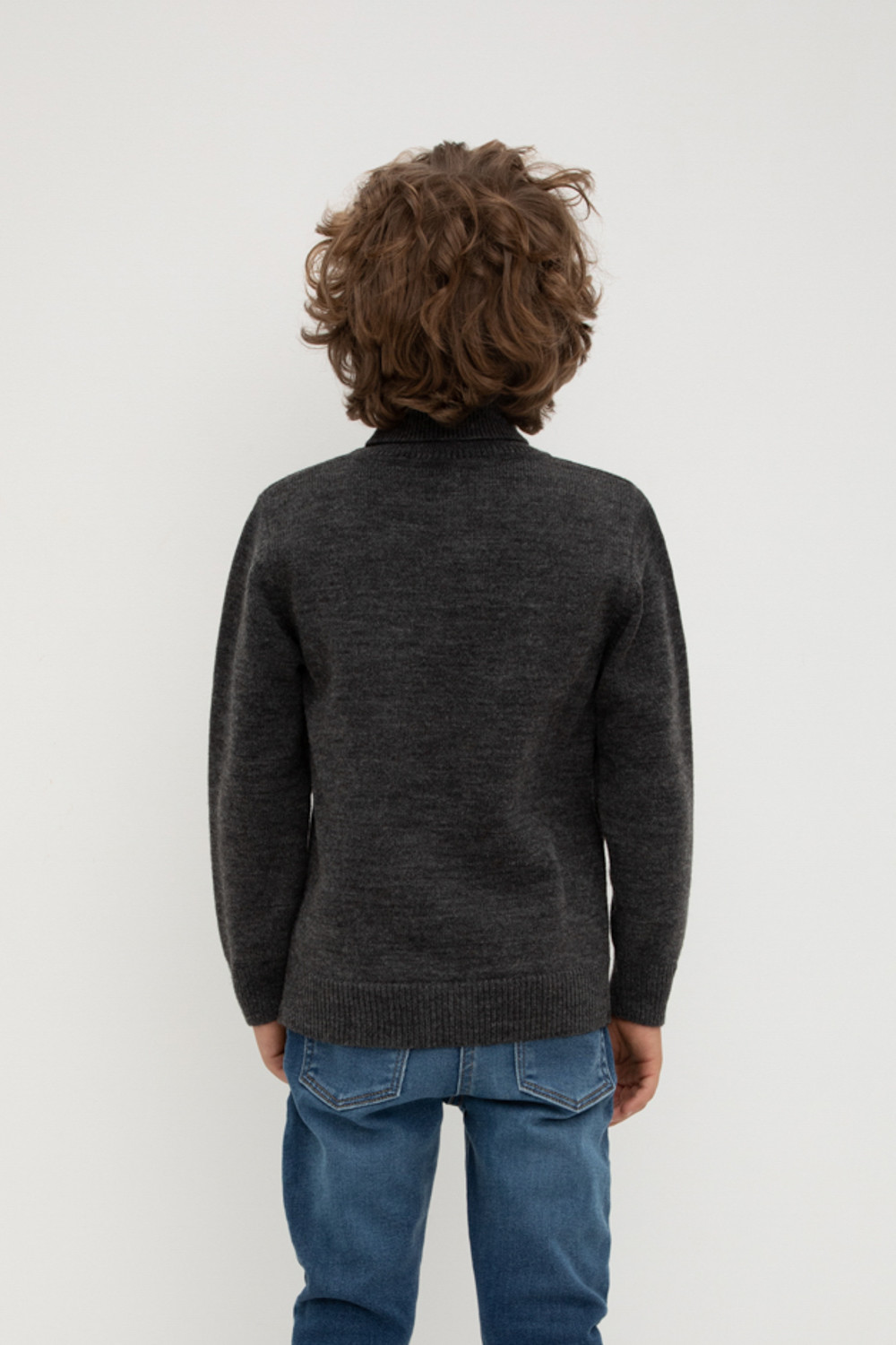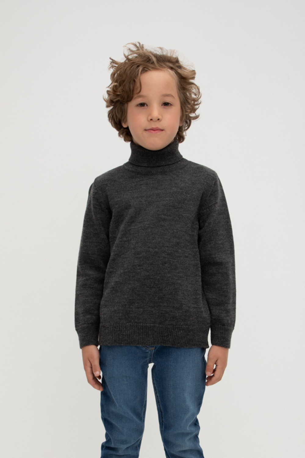 Вязаный джемпер для мальчика из мягкой полушерстяной пряжи. Высокий воротник с отворотом хорошо защищает от холода. Длинные рукава с манжетами. Внизу эластичный пояс. Изделие сохраняет форму и стойкий цвет после многочисленных стирок.