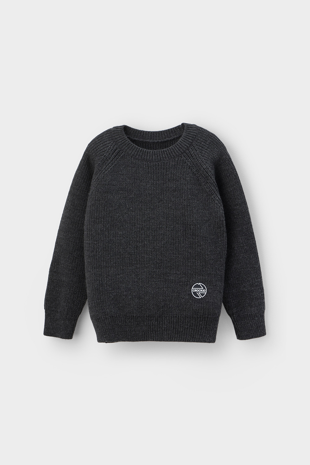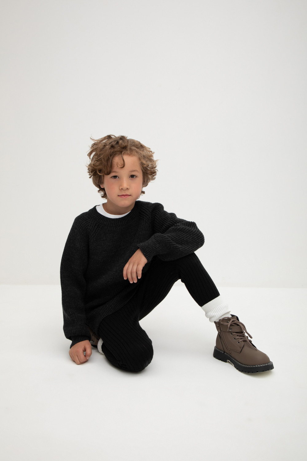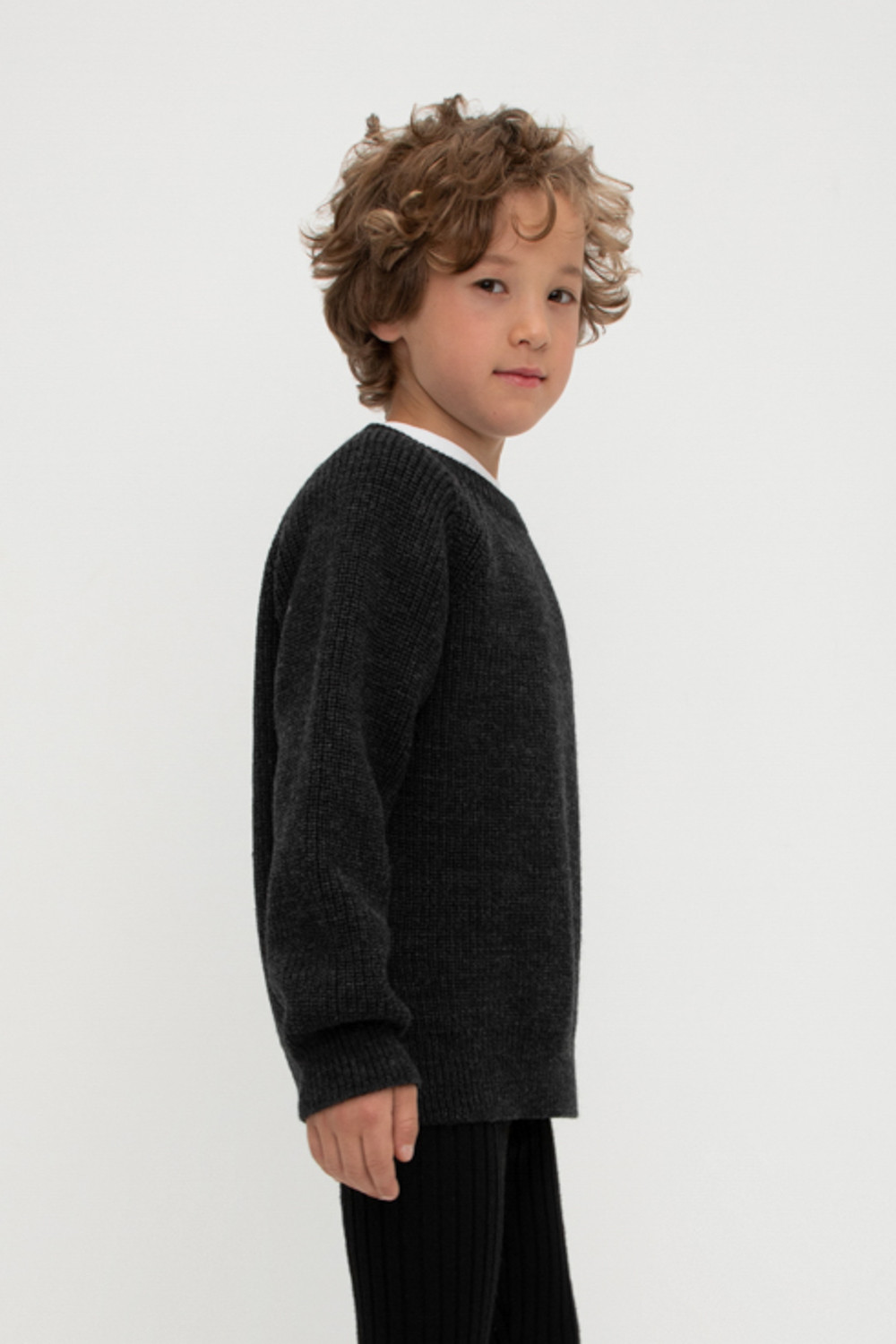 Вязаный джемпер для мальчика из мягкой полушерстяной пряжи. Длинные рукава с манжетами. Внизу эластичный пояс. Спереди нашивка. Изделие сохраняет форму и стойкий цвет после многочисленных стирок.