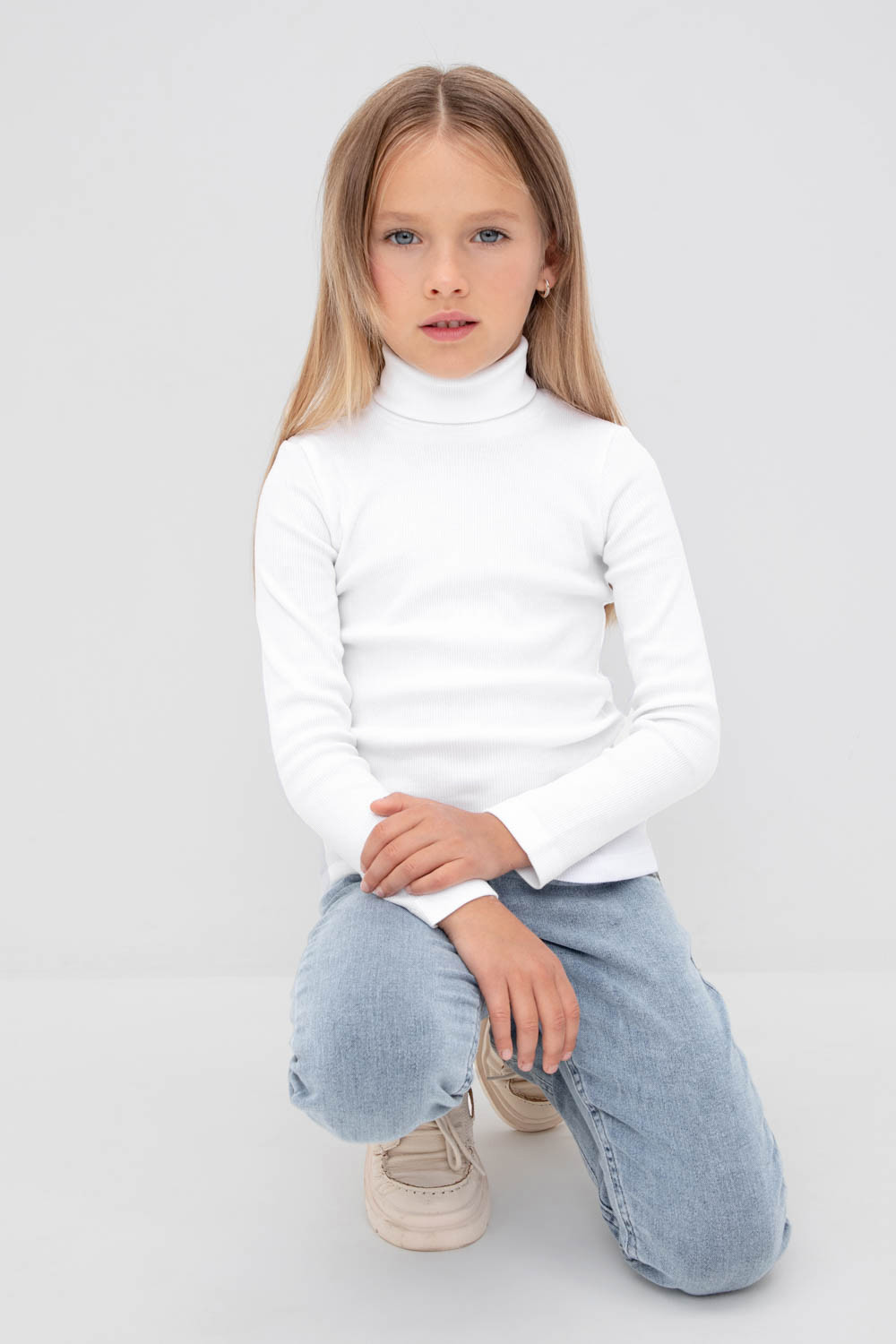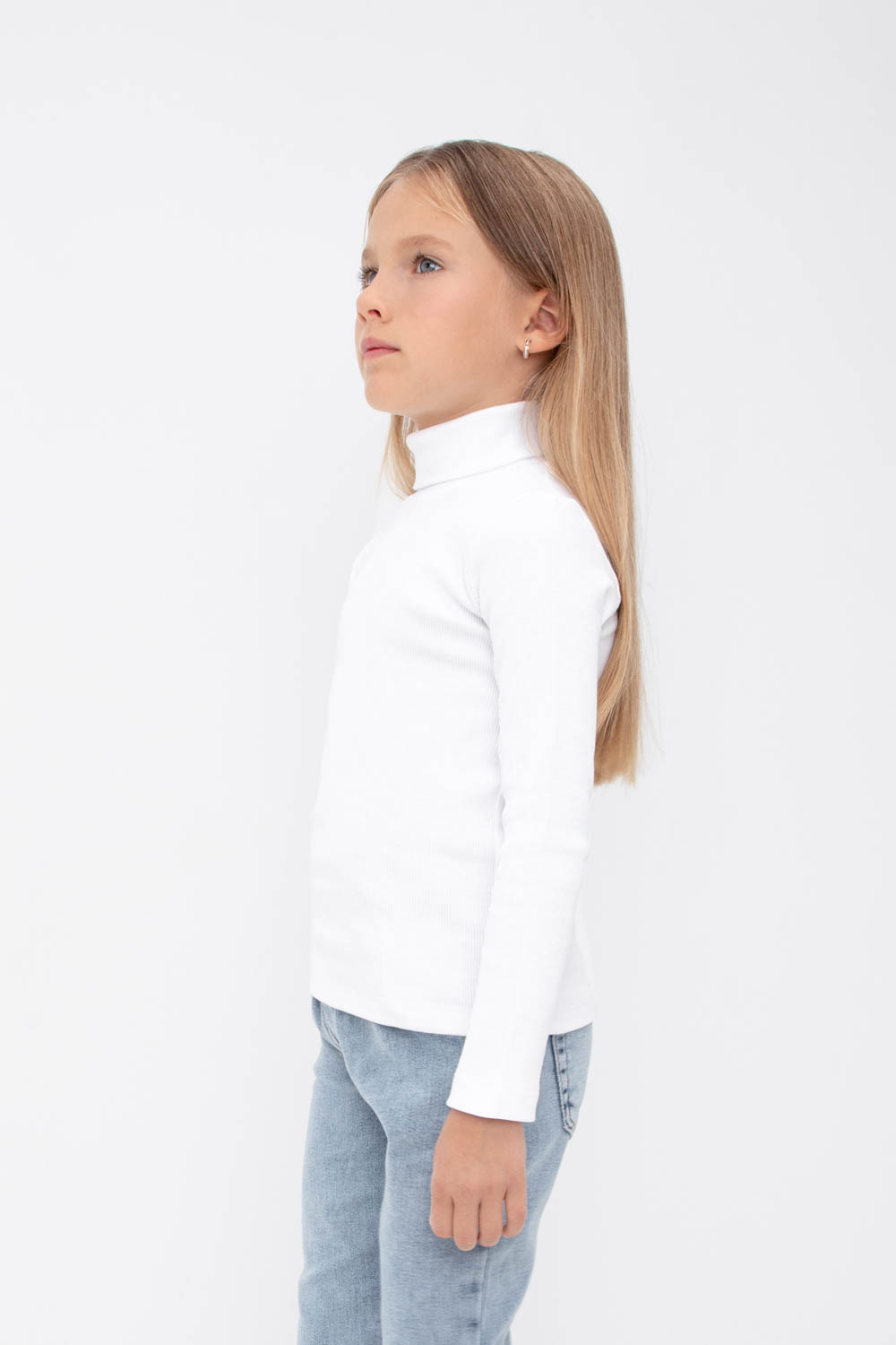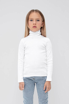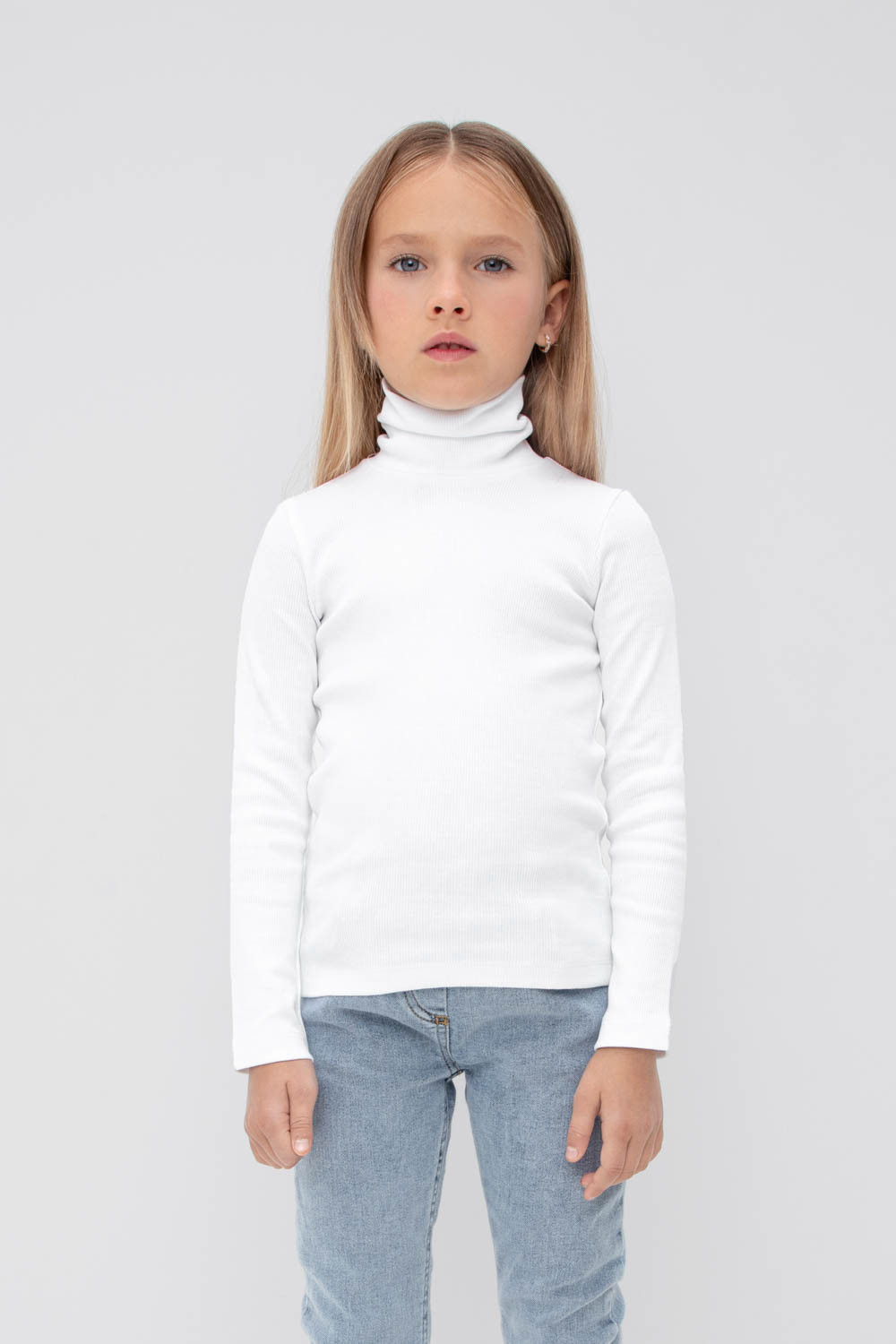 Однотонная детская водолазка из эластичного трикотажа кашкорсе. Длинные рукава. Высокая горловина с отворотом.