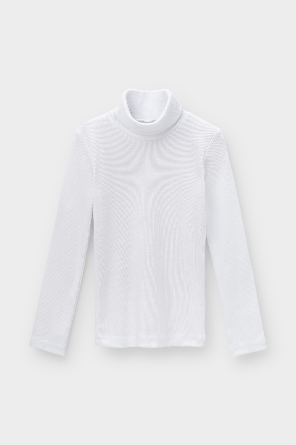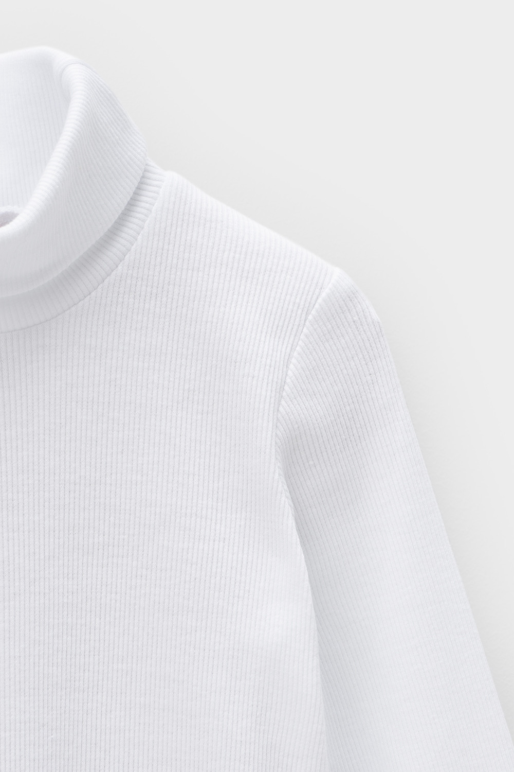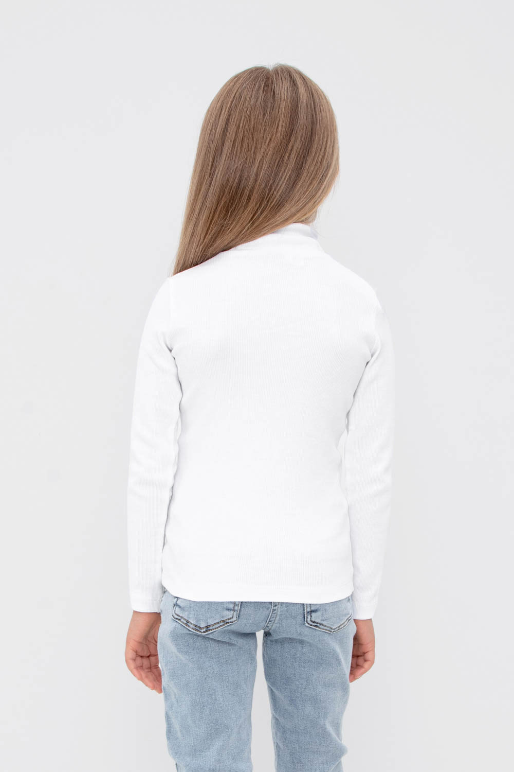 Однотонная детская водолазка из эластичного трикотажа кашкорсе. Длинные рукава. Высокая горловина с отворотом.