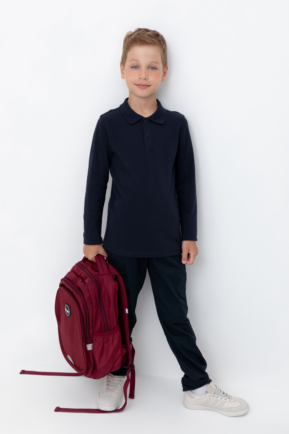 Джемпер поло с длинными рукавами для мальчика из трикотажного полотна пике. Вязаный воротник. Удобная застежка спереди. По бокам разрезы, обработанные киперной лентой.
