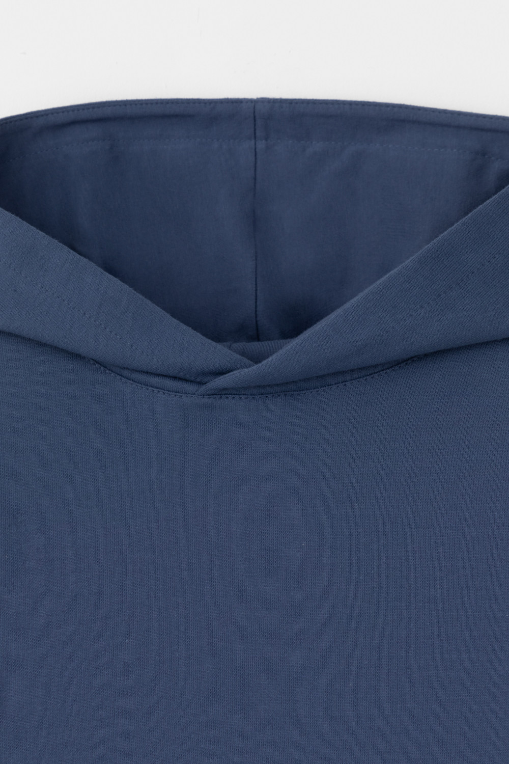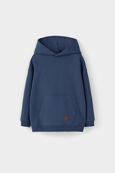 Однотонная трикотажная толстовка с капюшоном из петельчатого футера. Спереди удобный накладной карман-кенгуру. Манжеты и пояс из эластичного трикотажа в рубчик.