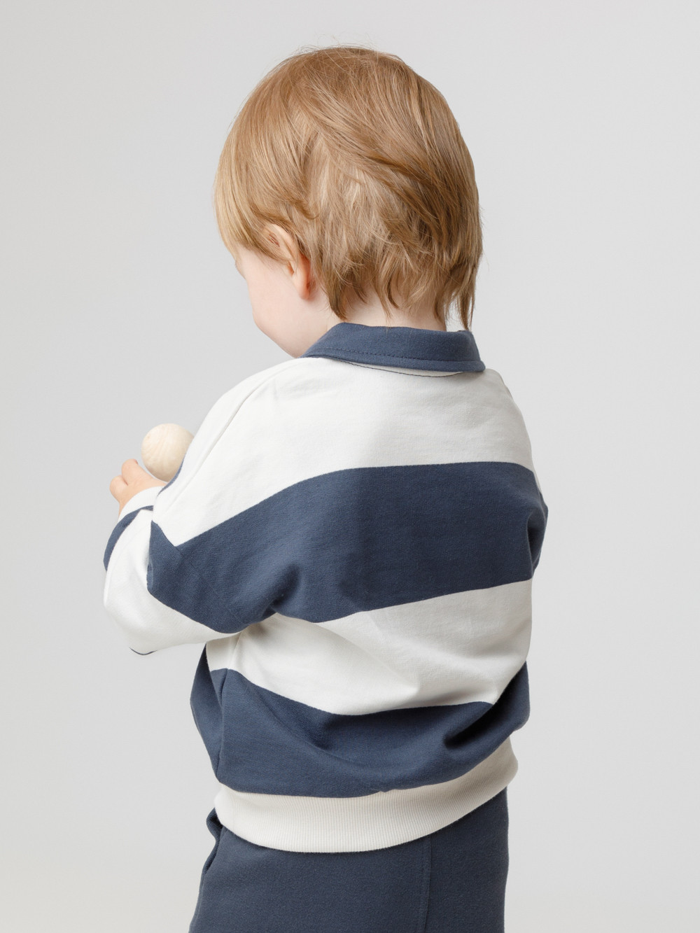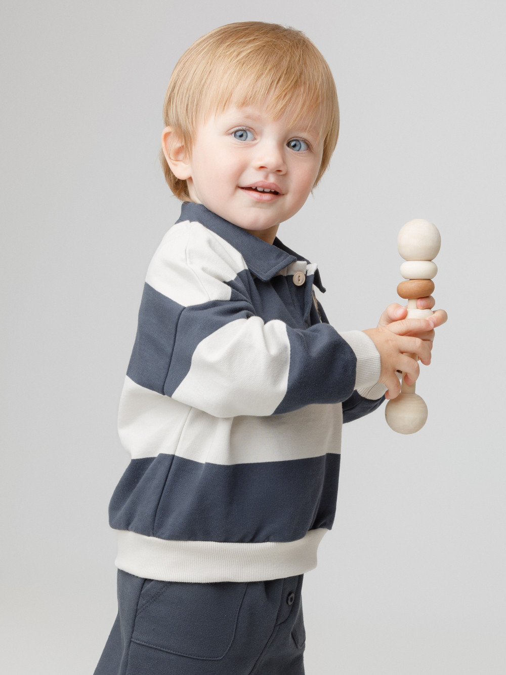 Свитшот с воротником для мальчика. Изготовлен из высококачественного петельчатого футера. Манжеты и пояс выполнены из эластичного полотна. На груди застёжка на пуговицу. Изделие сохраняет цвет и форму после многократных стирок.