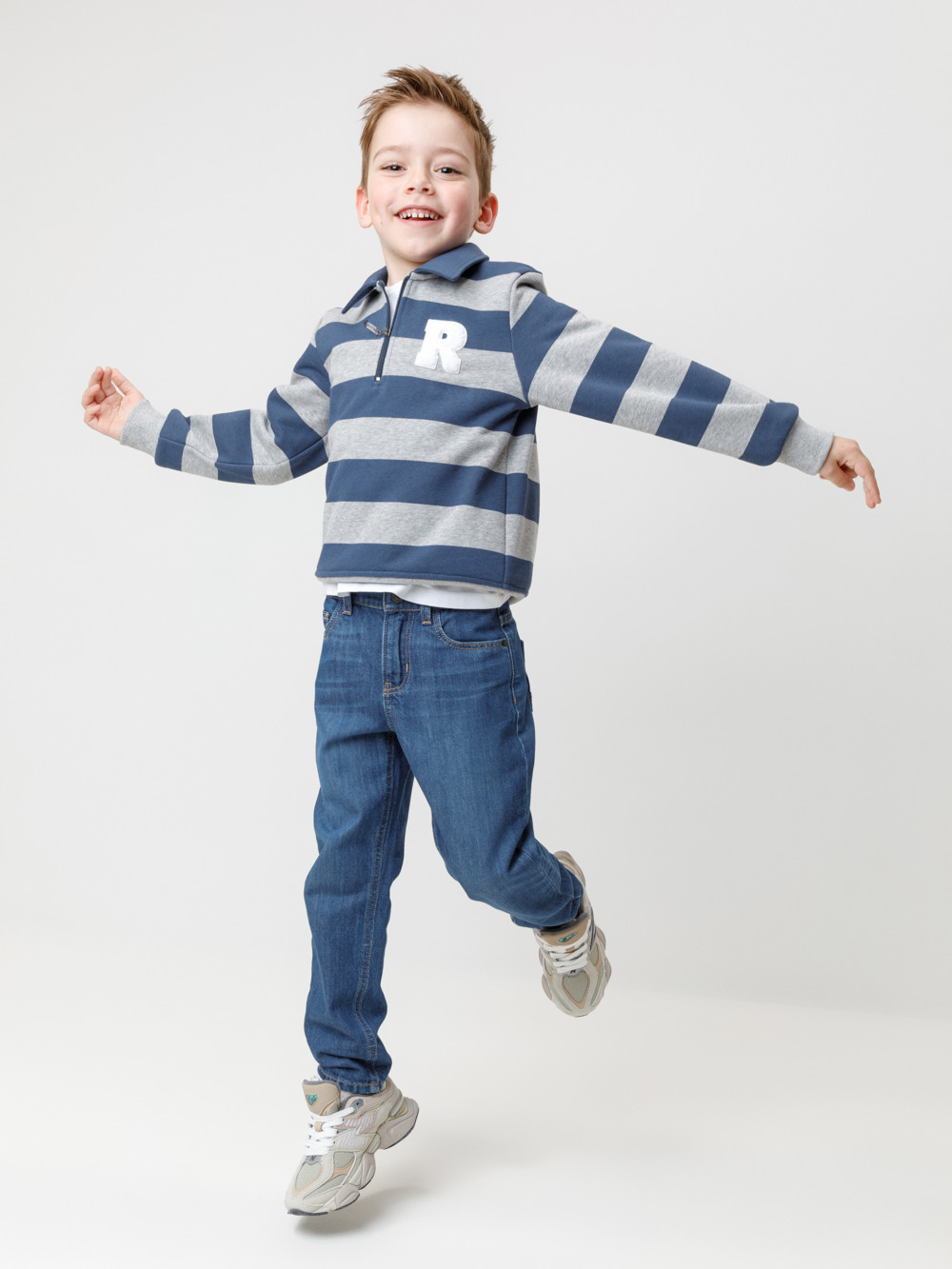 Свитшот с воротником для мальчика. Изготовлен из высококачественного петельчатого футера. В составе 80% натурального хлопка и 20% полиэстера, при этом полиэстер ввязан внутрь по особой технологии и не соприкасается с кожей. Манжеты и пояс выполнены из эластичного полотна. На груди короткая застёжка на молнию. Оригинальный рисунок выполнен из стойких текстильных гипоаллергенных красителей. Изделие сохраняет цвет и форму после многократных стирок.