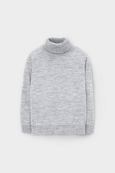 Вязаный джемпер для мальчика из полушерстяной пряжи. Высокий воротник с отворотом хорошо защищает от холода.  Длинные рукава с манжетами. Внизу эластичный пояс. Изделие сохраняет форму и стойкий цвет после многочисленных стирок.