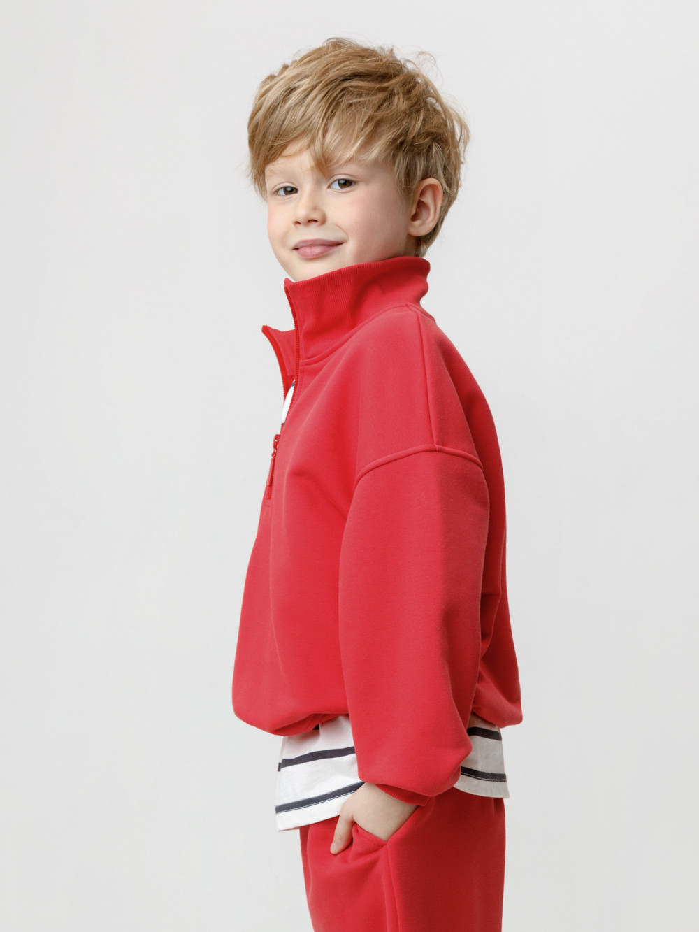 Джемпер из мягкого петельчатого трикотажа для мальчика. У изделия эластичные горловина, манжеты и пояс. Застёгивается на короткую молнию. Оригинальный принт выполнен из стойких текстильных гипоаллергенных красителей. Джемпер сохраняет цвет и форму после многократных стирок. Все трикотажные полотна производятся в соответствии с нормами швейцарского сертификата ЭкоТекс.