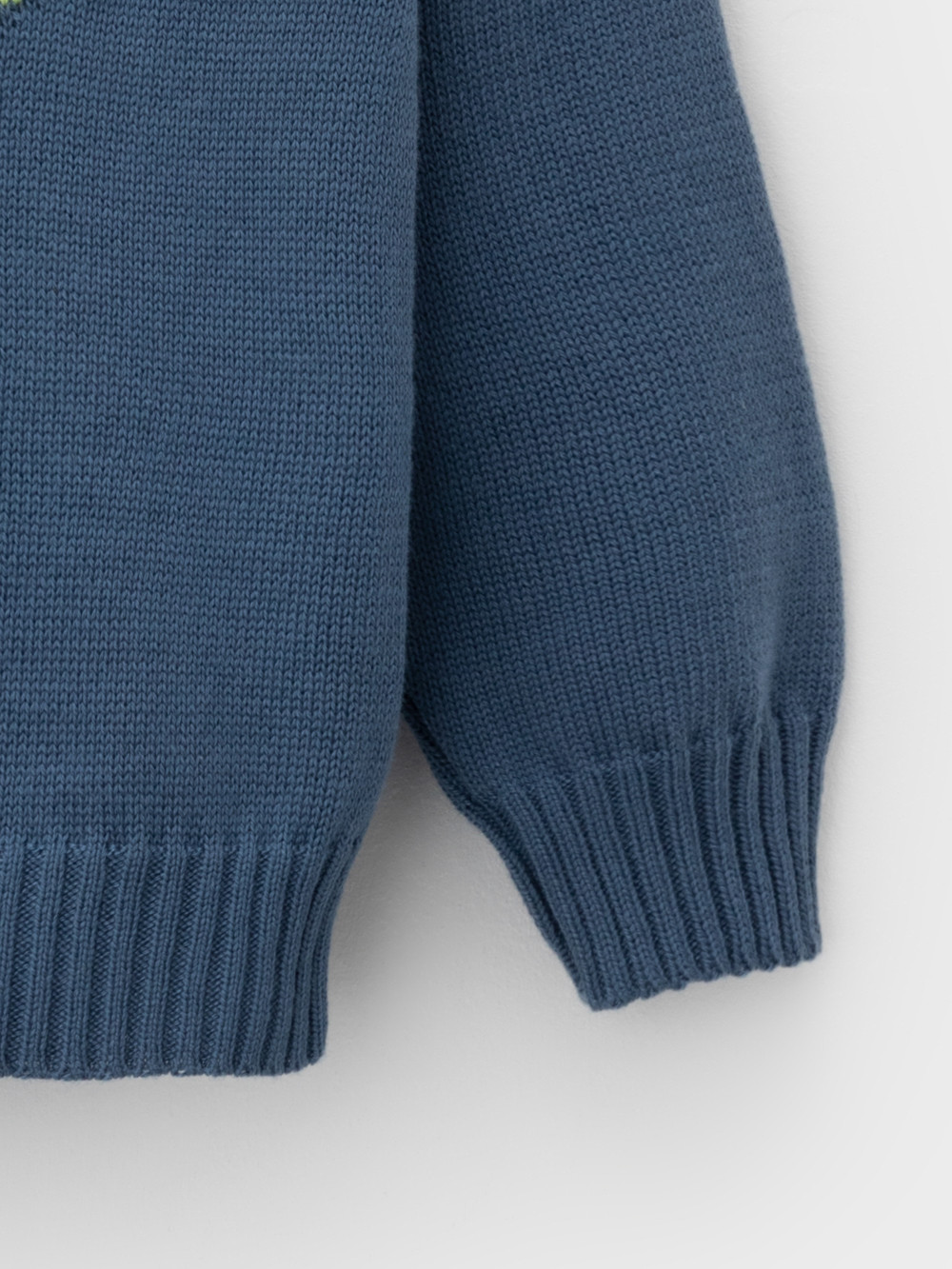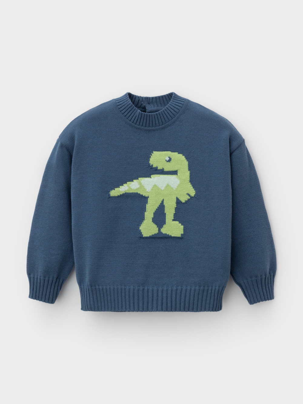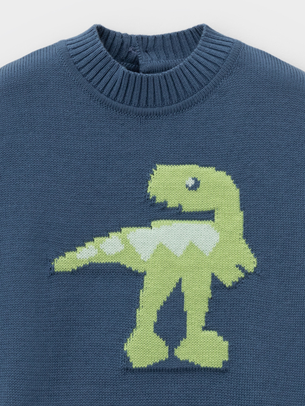 Вязаный джемпер с рисунком для мальчика. Изготовлен из мягкой хлопковой пряжи с добавлением акрила. Длинные рукава с манжетами. Внизу эластичный пояс. На спинке застёжка на пуговицу. Изделие сохраняет форму и стойкий цвет после многочисленных стирок.