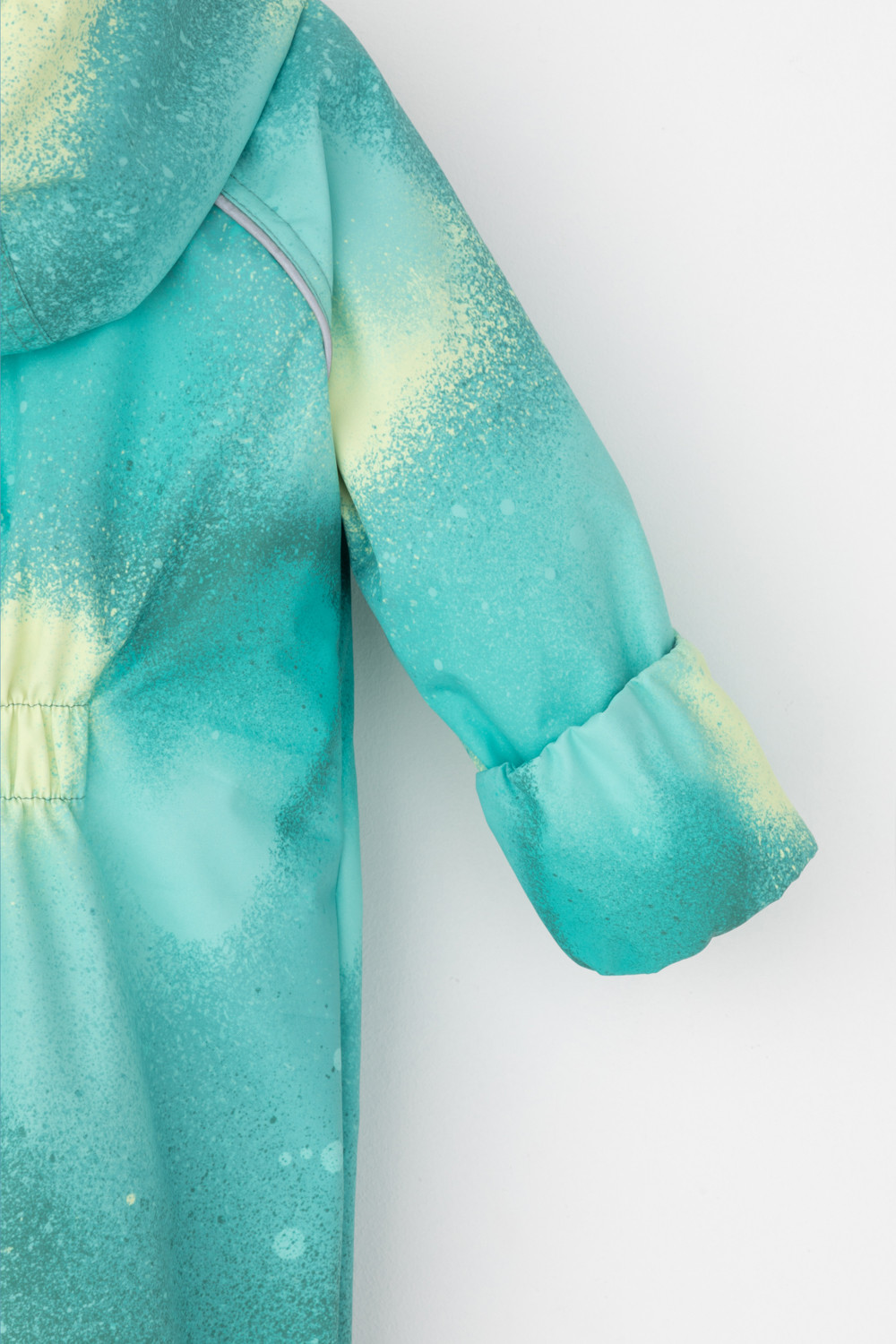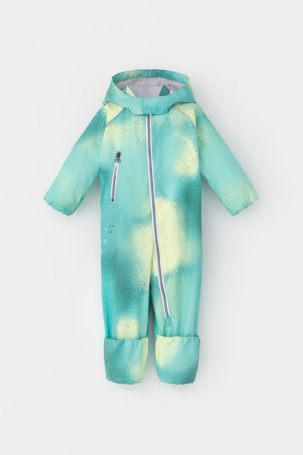Ветровочный комбинезон ясельный из мембранной ткани с дополнительной тефлоновой обработкой. Данный вид обработки предохраняет изделие от загрязнения и лучше отводит влагу. Подклад из 100% хлопка. У изделия удлиненная молния для легкого одевания с защитой подбородка. Утяжка на капюшоне с потайными стопперами. По низу рукавов и брючин, а также на спинке изделия эластичная резинка для лучшего прилегания. Для фиксации комбинезона используются съемные силиконовые штрипки. В размерах  74-80 функциональные отвороты на рукавах и брючинах. Во всех изделиях верхнего ассортимента для безопасности ребенка предусмотрены светоотражающие элементы.