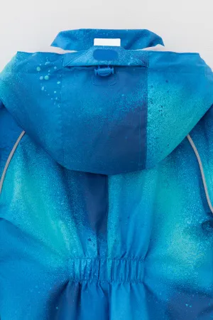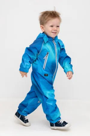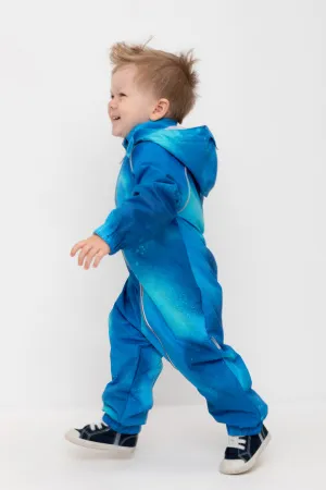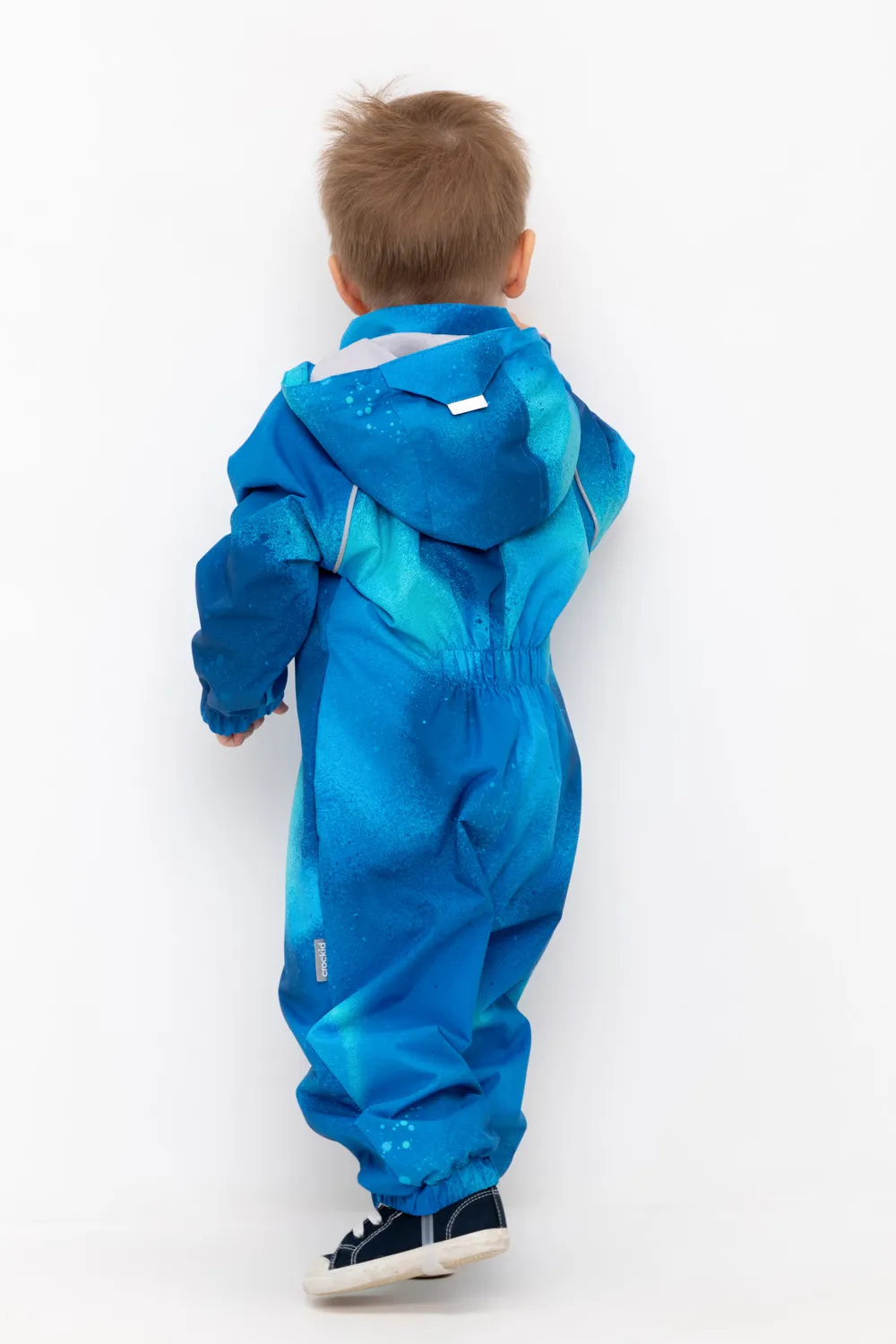 Ветровочный комбинезон ясельный из мембранной ткани с дополнительной тефлоновой обработкой. Данный вид обработки предохраняет изделие от загрязнения и лучше отводит влагу. Подклад из 100% хлопка. У изделия удлиненная молния для легкого одевания с защитой подбородка. Утяжка на капюшоне с потайными стопперами. По низу рукавов и брючин, а также на спинке изделия эластичная резинка для лучшего прилегания. Для фиксации комбинезона используются съемные силиконовые штрипки. В размерах  74-80 функциональные отвороты на рукавах и брючинах. Во всех изделиях верхнего ассортимента для безопасности ребенка предусмотрены светоотражающие элементы.