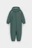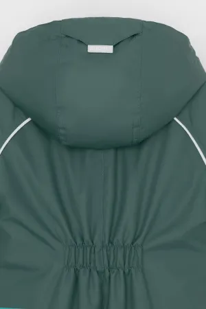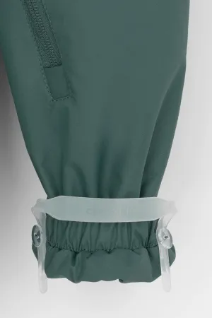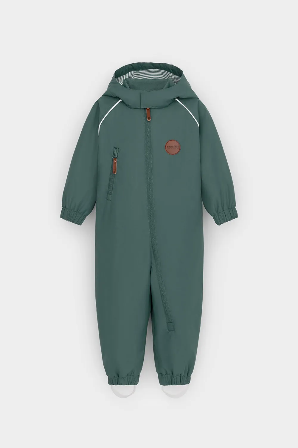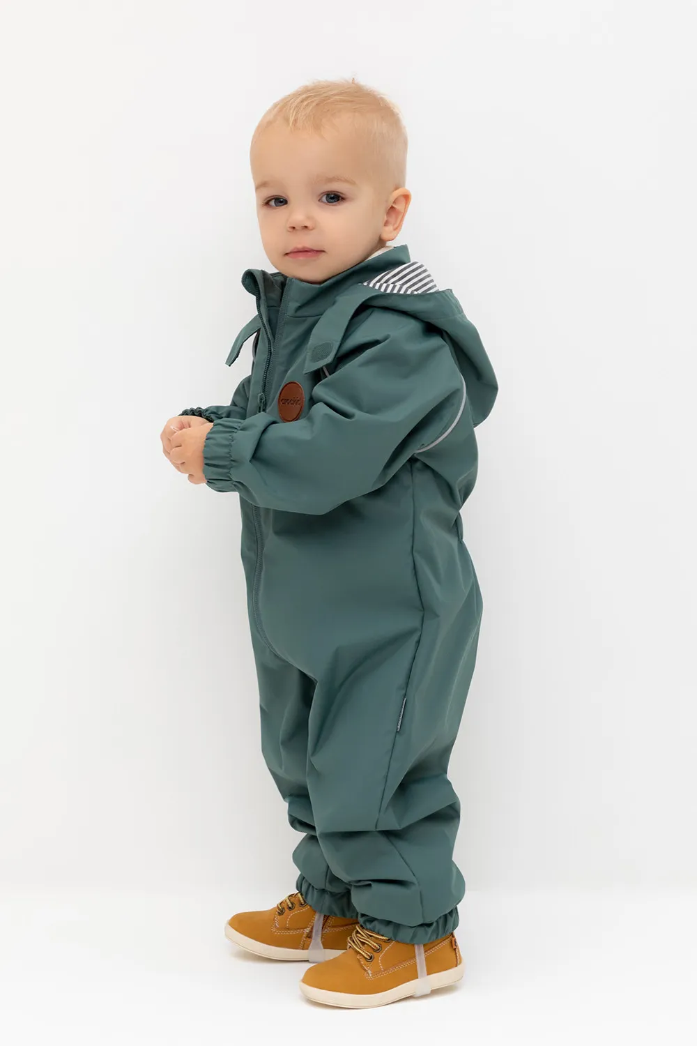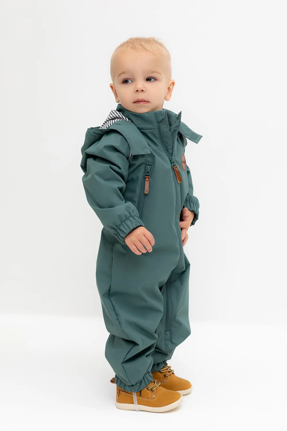 Ветровочный комбинезон ясельный из мембранной ткани с дополнительной тефлоновой обработкой. Данный вид обработки предохраняет изделие от загрязнения и лучше отводит влагу. Подклад из 100% хлопка. У изделия удлиненная молния для легкого одевания с защитой подбородка. Утяжка на капюшоне с потайными стопперами. По низу рукавов и брючин, а также на спинке изделия эластичная резинка для лучшего прилегания. Для фиксации комбинезона используются съемные силиконовые штрипки. В размерах 68-74 и 74-80 функциональные отвороты на рукавах и брючинах. Во всех изделиях верхнего ассортимента для безопасности ребенка предусмотрены светоотражающие элементы.