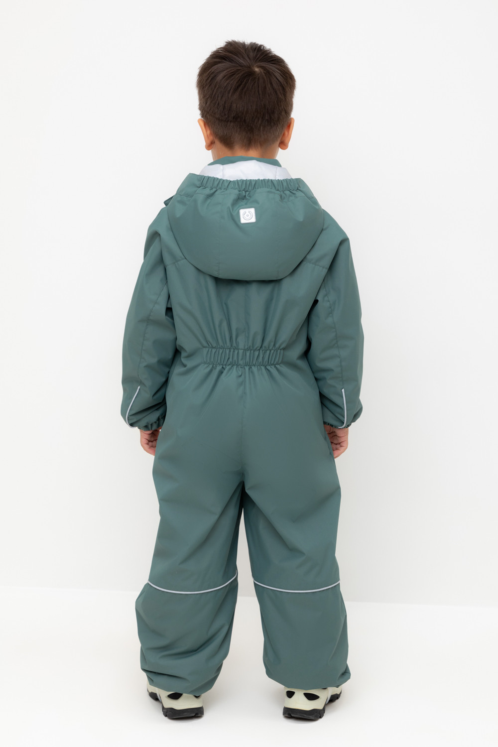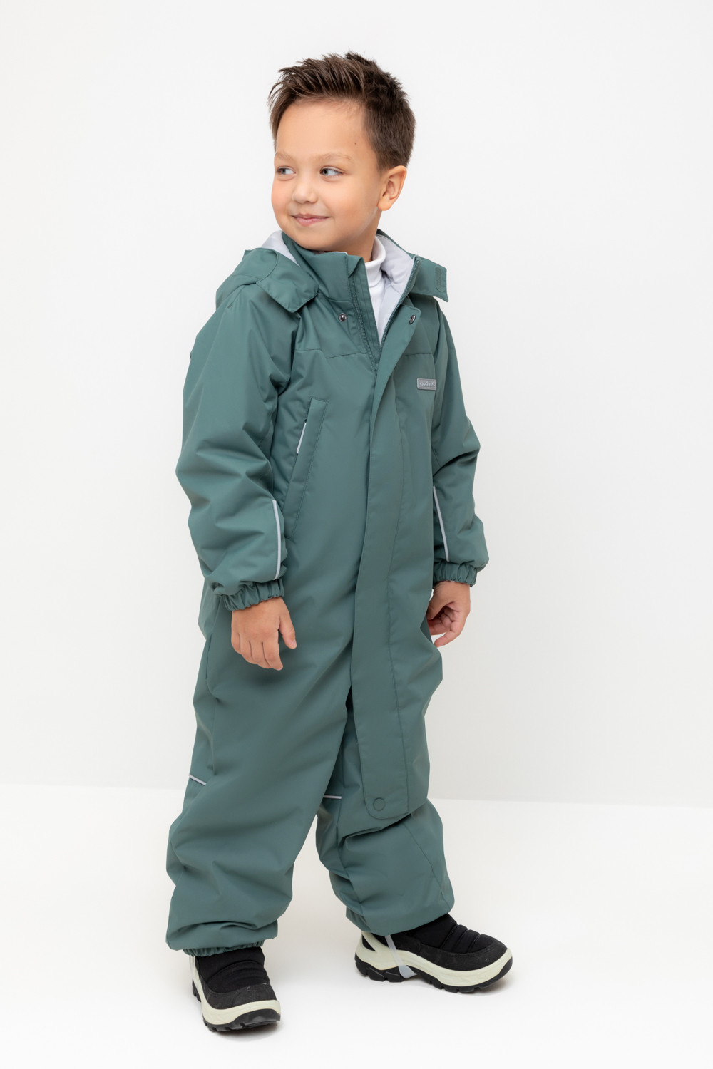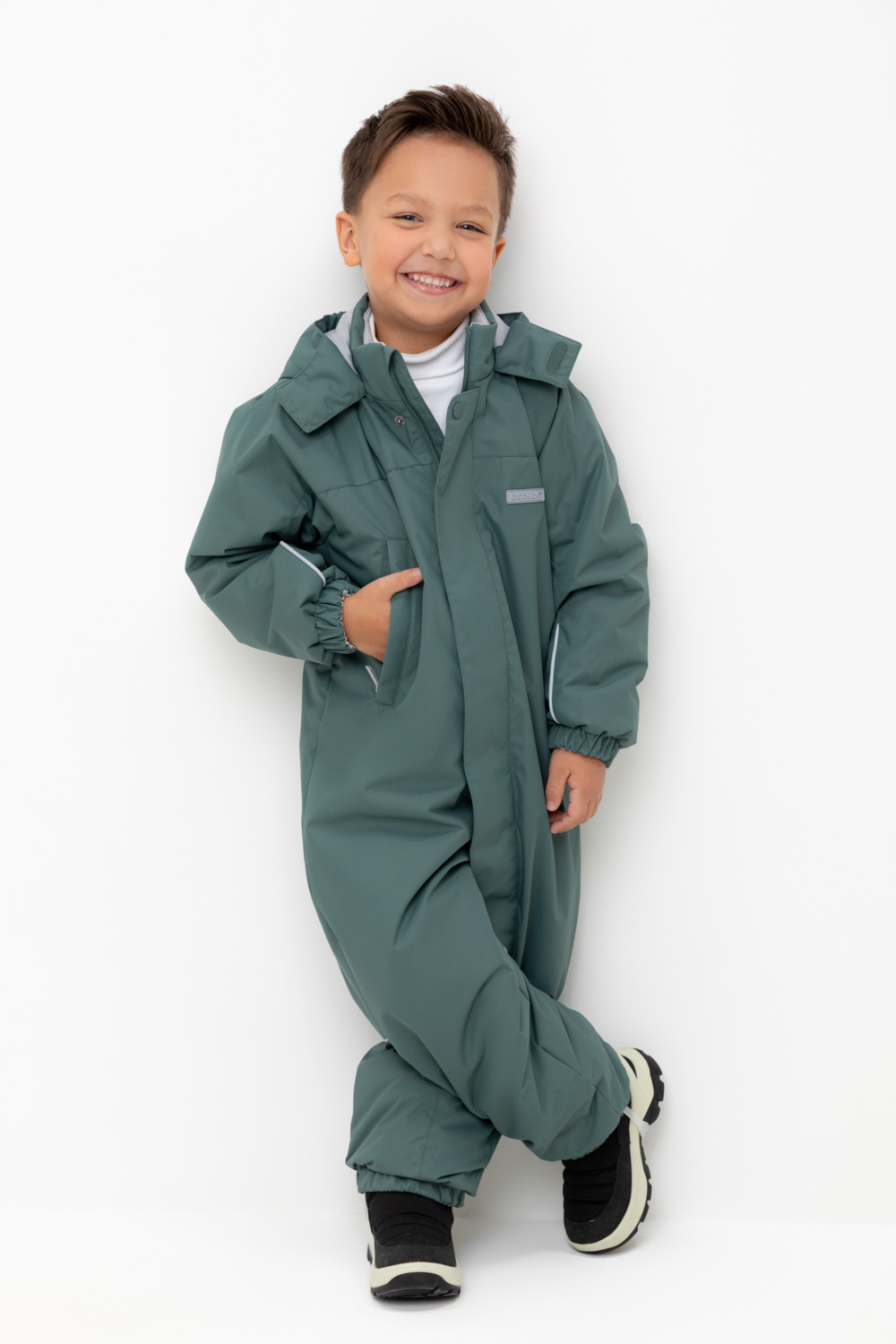 Демисезонный комбинезон для мальчика с утеплителем SEE, 120 г/м2. Выполнен из мембранной ткани с дополнительной тефлоновой обработкой. Данный вид обработки предохраняет изделие от загрязнения и лучше отводит влагу. Подклад из 100% полиэстера. Для удобного одевания комбинезон застёгивается на удлинённую молнию с защитой подбородка и имеет дополнительную ветрозащитную планку на липучках и кнопках. Капюшон не снимается, по верхнему краю есть эластичная вставка. По низу рукавов и брючин, а также на спинке изделия предусмотрены эластичные резинки для лучшего прилегания. Для фиксации комбинезона используются съёмные силиконовые штрипки. Во всех изделиях верхнего ассортимента для безопасности ребёнка предусмотрены светоотражающие элементы.