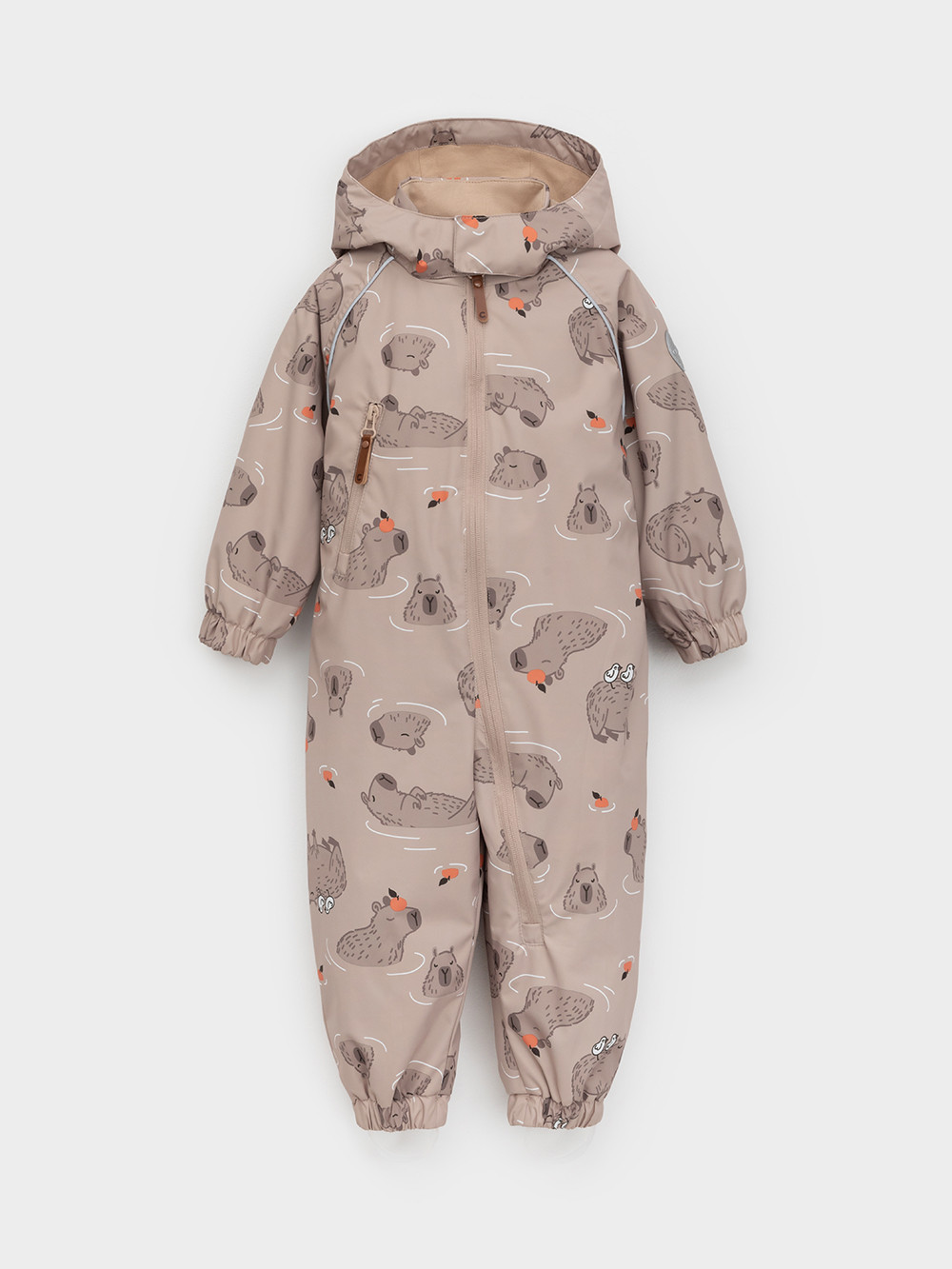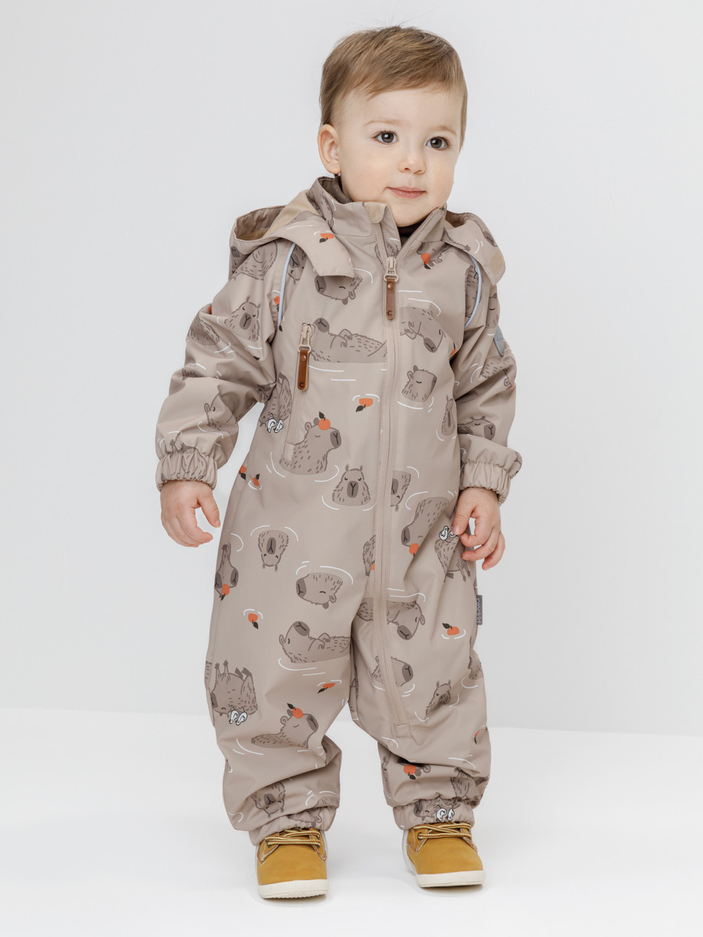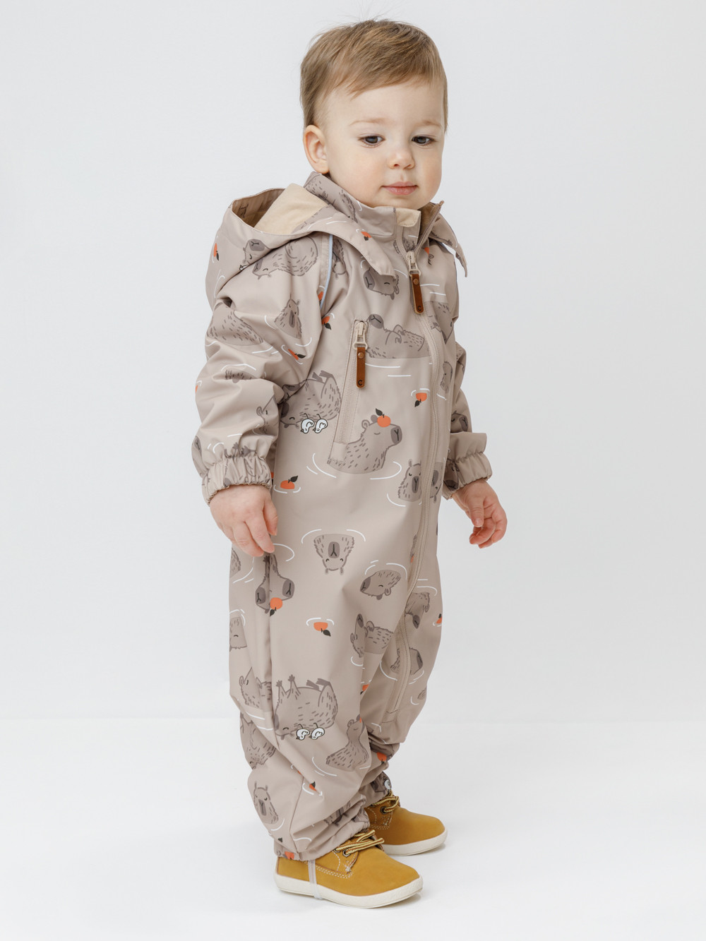 Ветровочный комбинезон ясельный без утеплителя. Выполнен из мембранной ткани с дополнительной тефлоновой обработкой. Данный вид обработки предохраняет изделие от загрязнения и лучше отводит влагу. Подклад из 100% хлопка. Для удобного одевания комбинезон застёгивается на удлинённую молнию с защитой подбородка. Утяжка на капюшоне с потайным стоппером. По низу рукавов и брючин, а также на спинке изделия предусмотрены эластичные резинки для лучшего прилегания. Для фиксации комбинезона используются съёмные силиконовые штрипки. В размерах 68-74 и 74-80 есть функциональные отвороты на рукавах и брючинах. Во всех изделиях верхнего ассортимента для безопасности ребёнка предусмотрены светоотражающие элементы.
