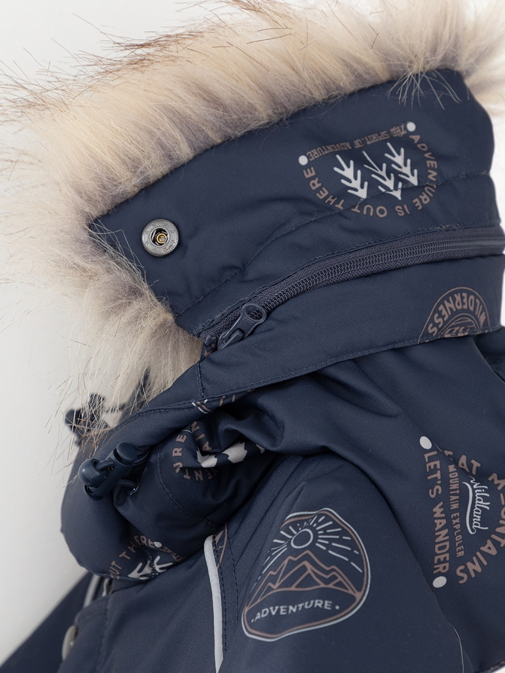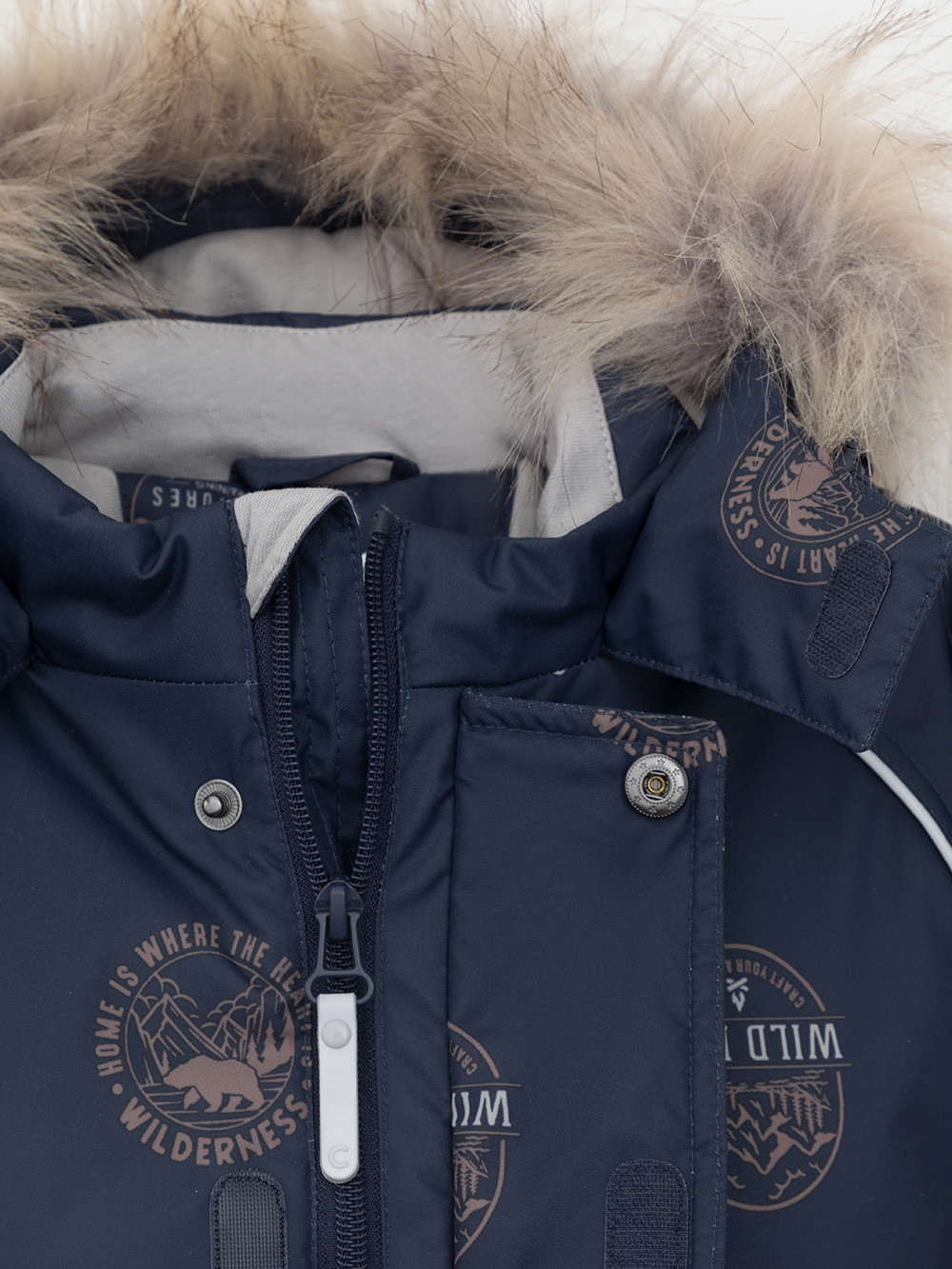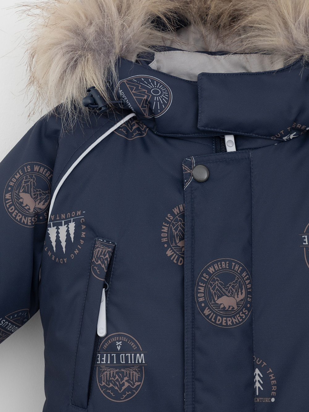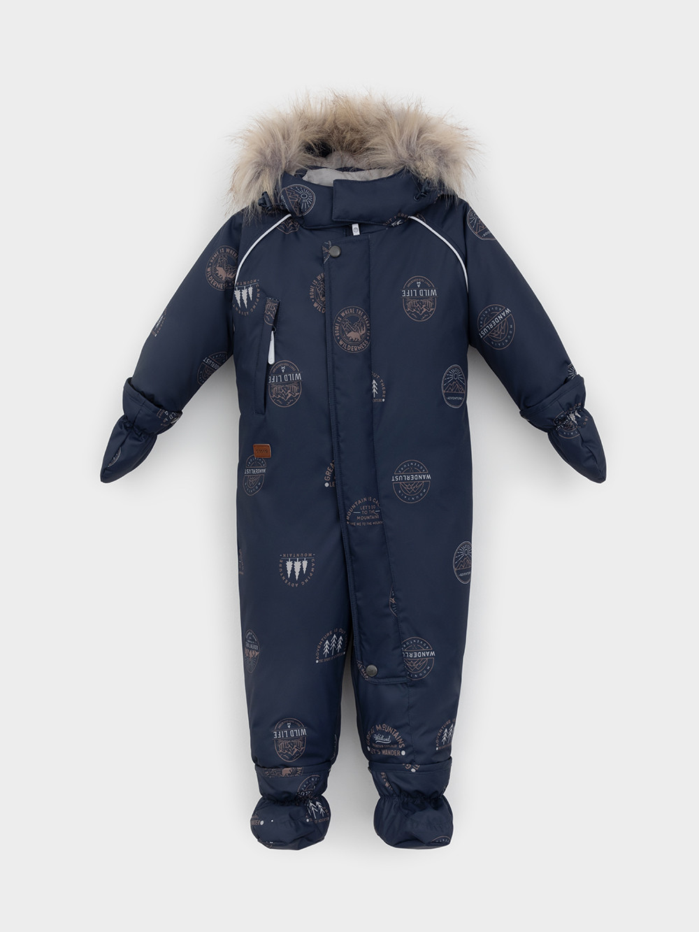 Зимний комбинезон ясельный с утеплителем Fellex®: 300 г/м2. Выполнен из мембранной ткани с дополнительной тефлоновой обработкой, которая предохраняет изделие от загрязнений и отталкивает влагу. Подклад выполнен из 100% хлопка. Комбинезон застёгивается на молнию и внешнюю планку на липучках, предусмотрена защита подбородка. Несъёмный капюшон имеет эластичную утяжку со стопперами и отстёгивающийся мех на молнии. Резинка по спинке для лучшего прилегания. На груди карман на молнии. По рукавам и низу изделия эластичные манжеты, на ножках отстёгивающиеся силиконовые штрипки. В размерах 74-80 и 80-86 в комплекте идут рукавицы и пинетки. Во всех изделиях верхнего ассортимента для безопасности ребёнка предусмотрены светоотражающие элементы.