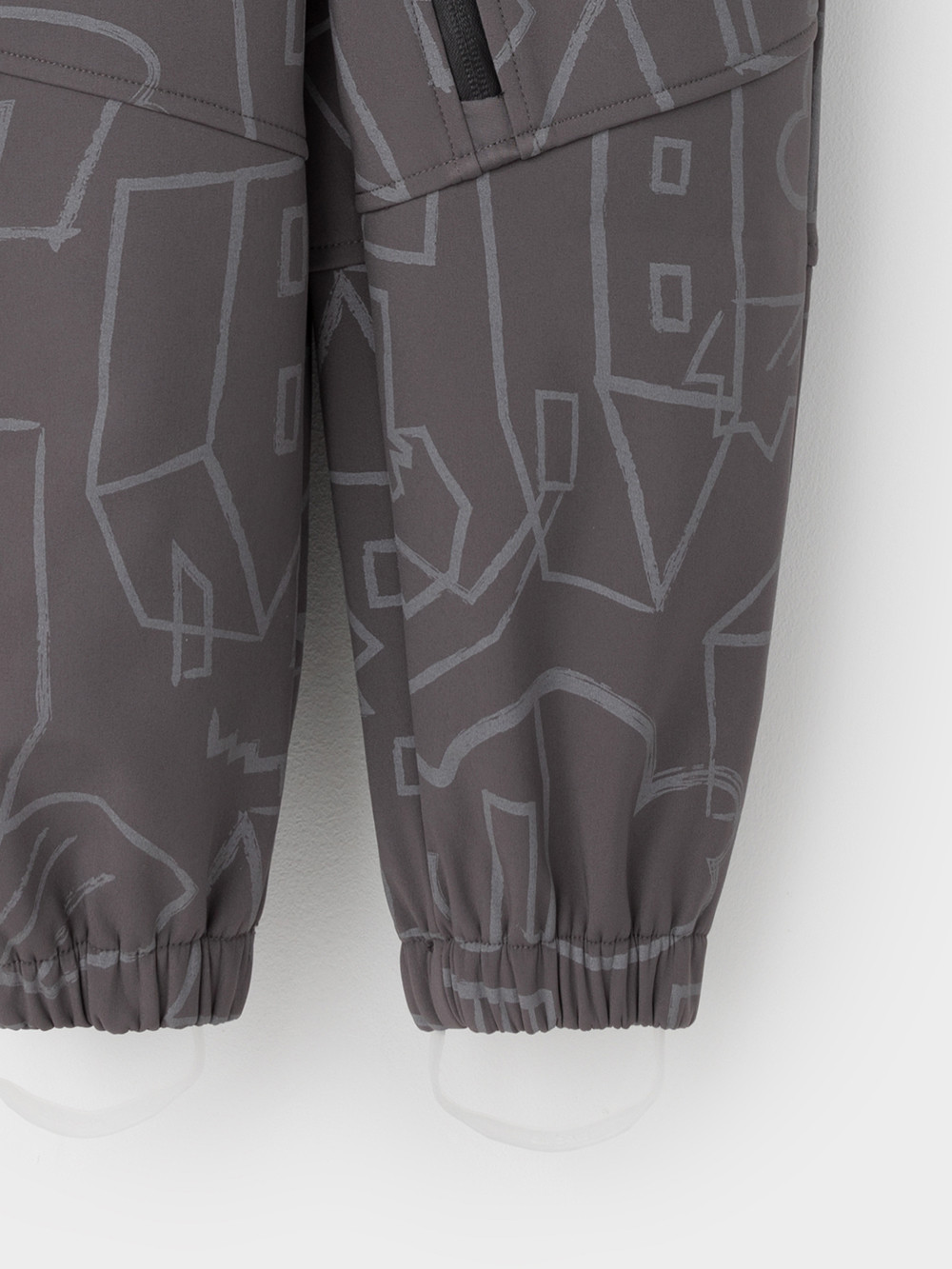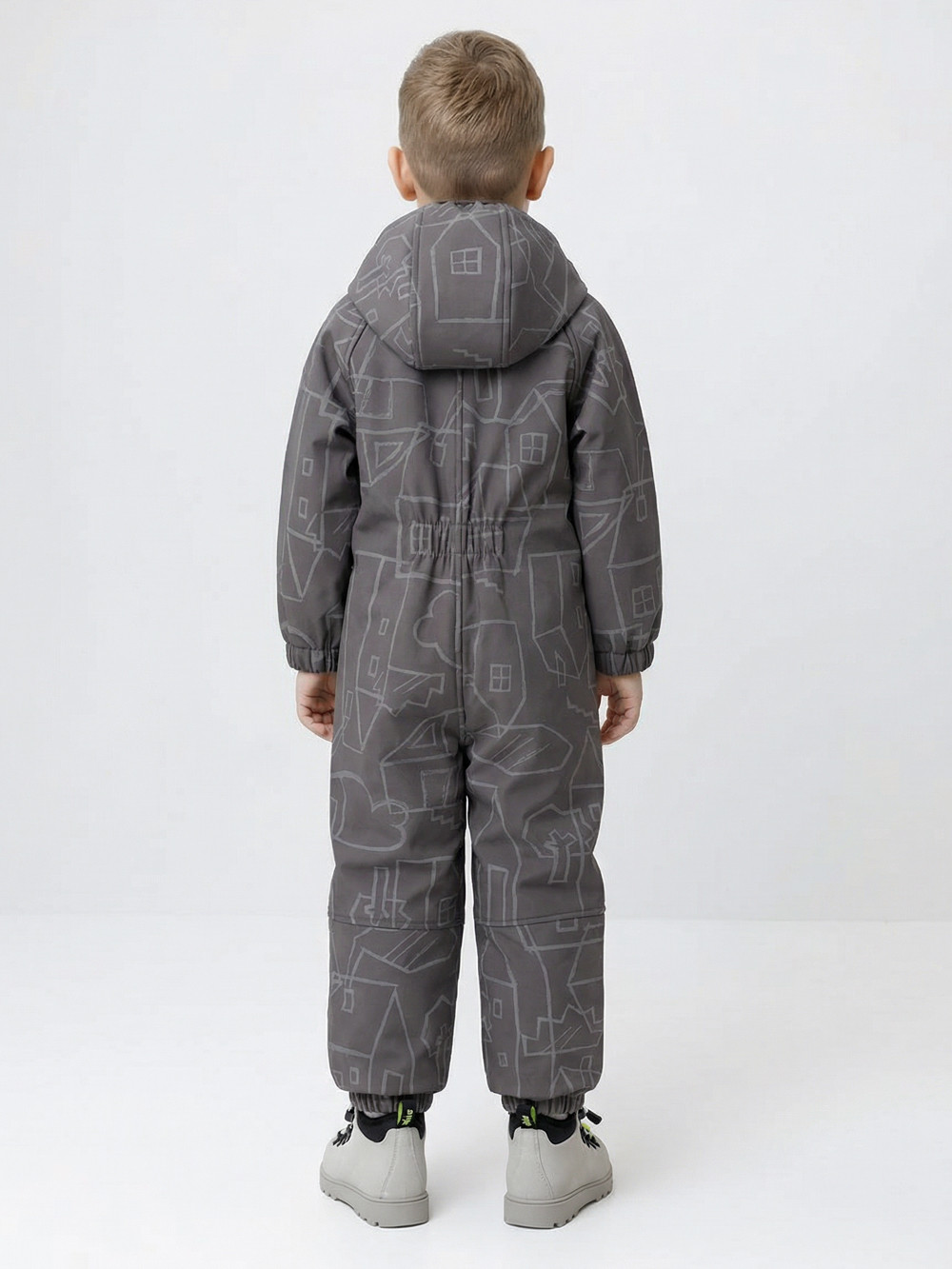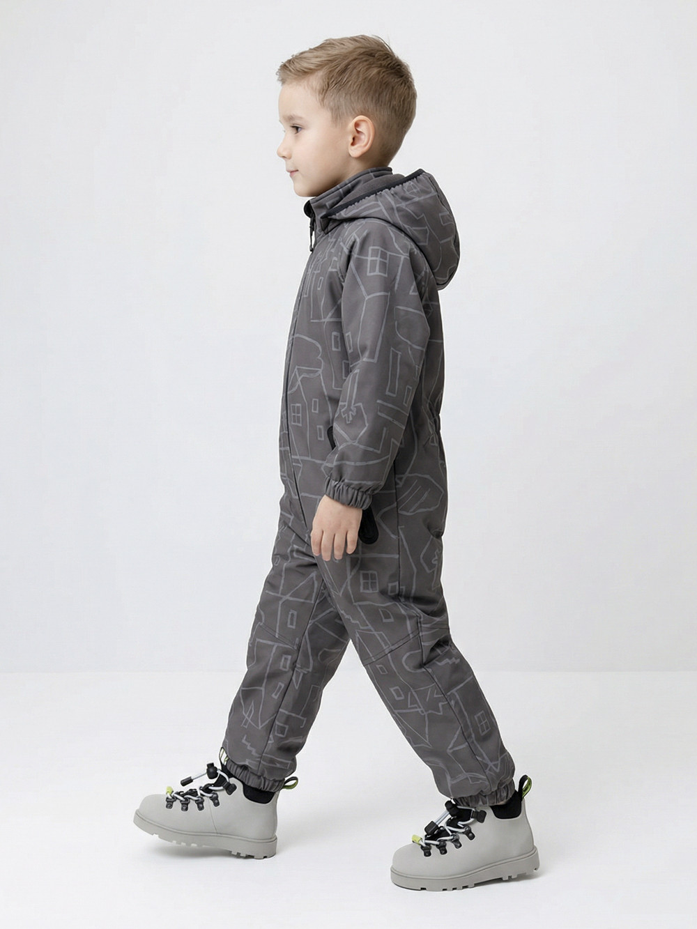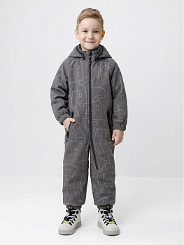 Демисезонный софтшелл комбинезон для мальчика со светоотражающим принтом. Выполнен из мембранной ткани, которая предохраняет изделие от загрязнения и лучше отводит влагу. Подклад из 100% полиэстера. Для удобного одевания комбинезон застёгивается на удлинённую молнию с защитой подбородка. Съемный капюшон на кнопках, по краю есть эластичная вставка. По низу рукавов и брючин, а также на спинке изделия предусмотрены эластичные резинки для лучшего прилегания. Для фиксации комбинезона используются съёмные силиконовые штрипки во всех размерах.