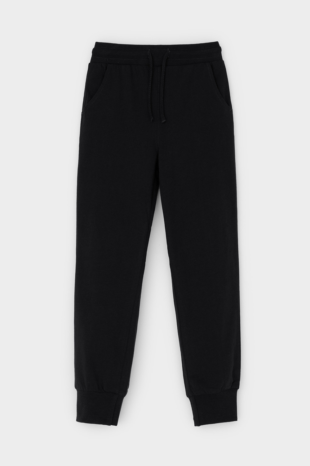 Трикотажные брюки для мальчика из высококачественного трикотажного полотна супрем. Эластичный пояс на резинке регулируется по ширине с помощью шнурка, по бокам два удобных кармана, внизу эластичные манжеты.