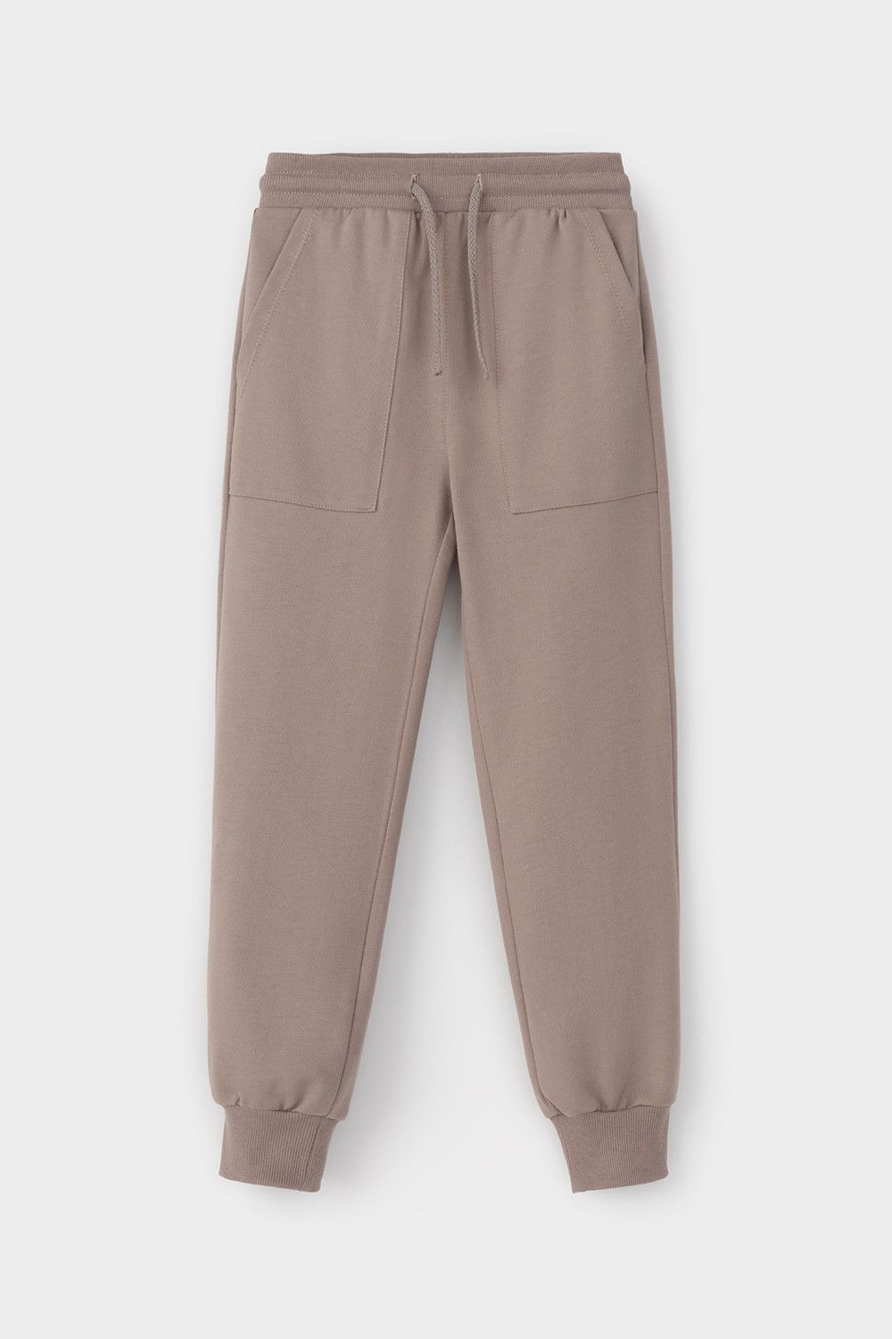 Брюки для мальчика из мягкого петельчатого трикотажа. Эластичный пояс на резинке регулируется по ширине с помощью шнурка. По бокам два удобных накладных кармана. Внизу эластичные манжеты.