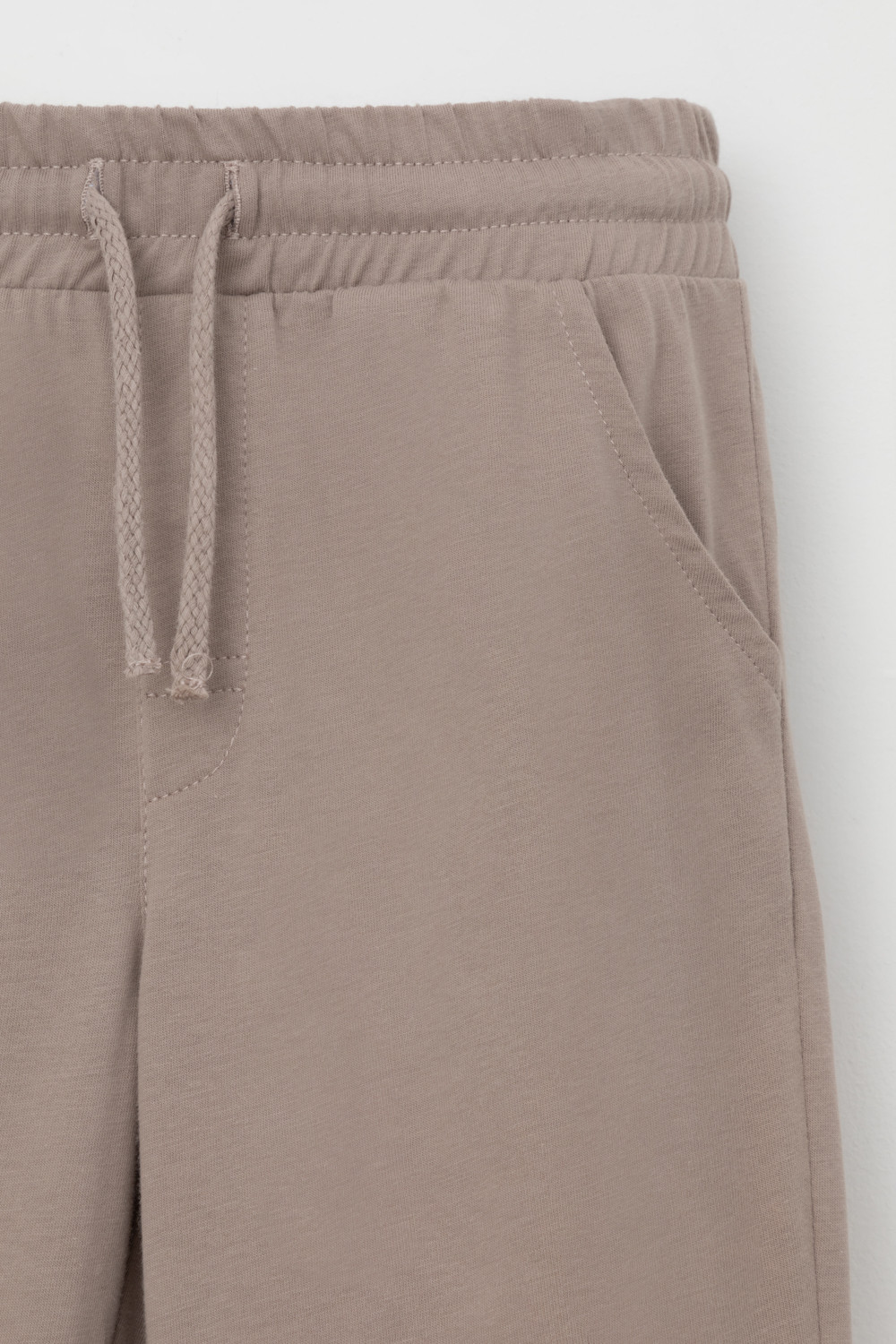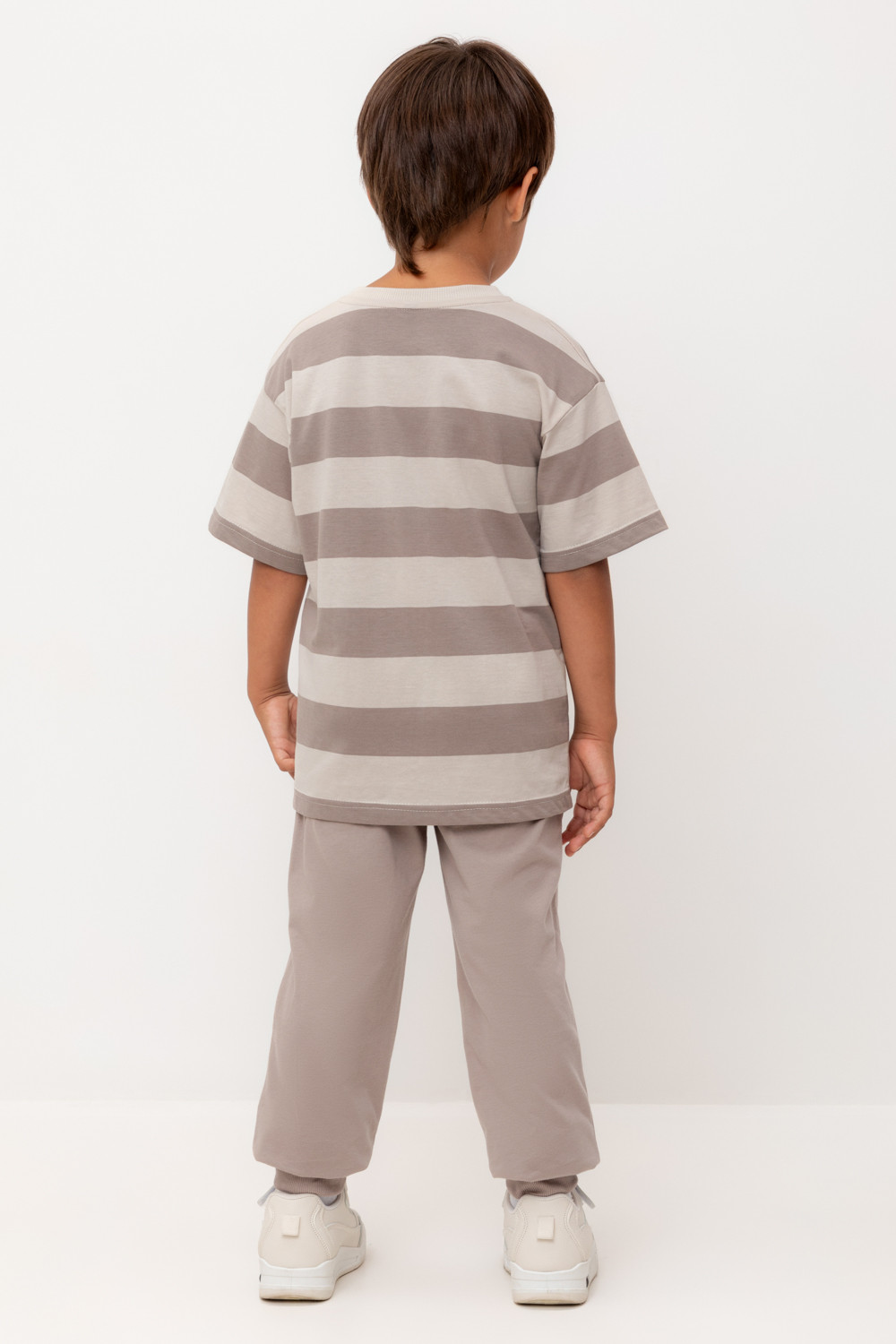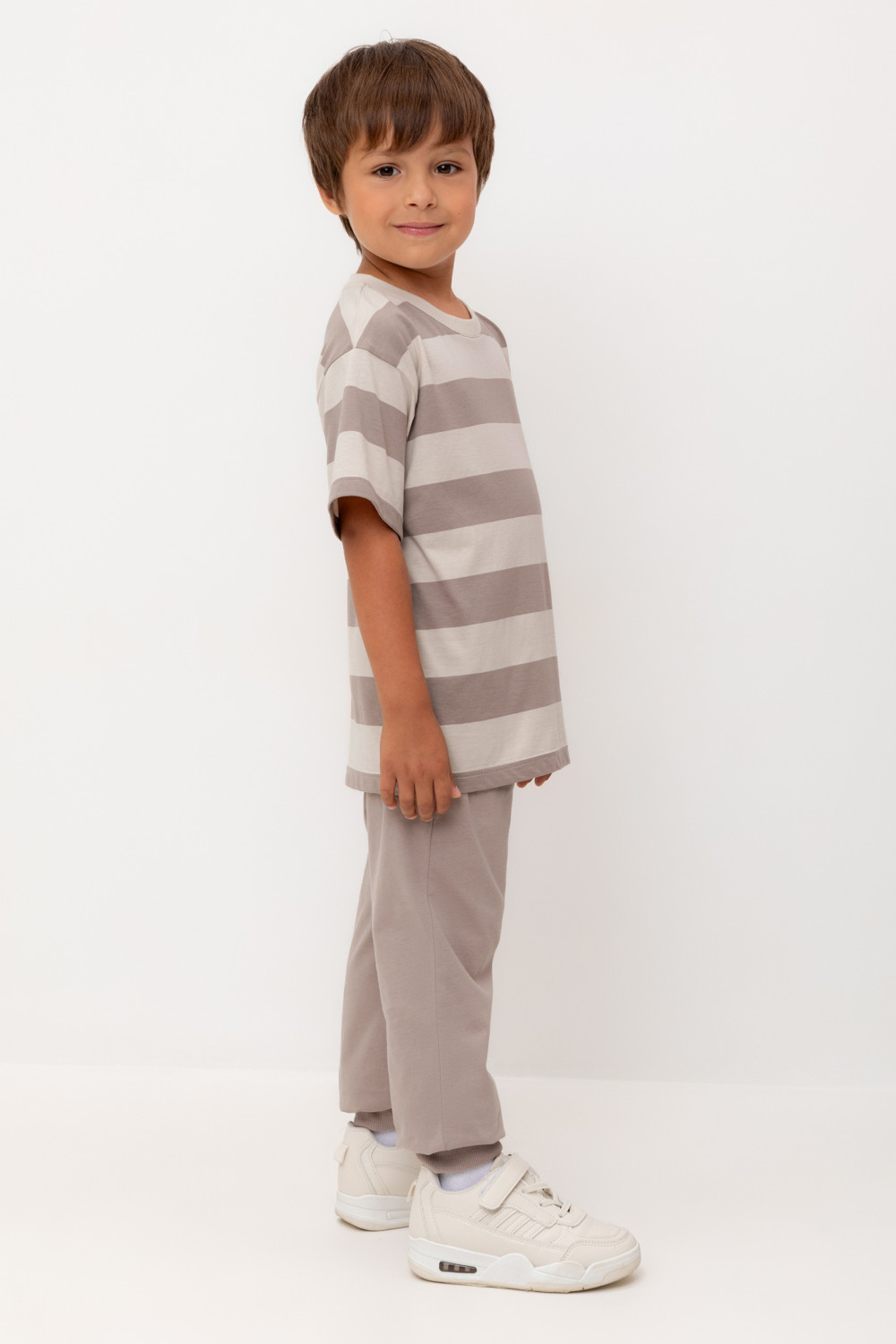 Брюки для мальчика из высококачественного трикотажного полотна. Пояс на резинке регулируется по ширине с помощью шнурка. По бокам два удобных кармана. Внизу эластичные манжеты.