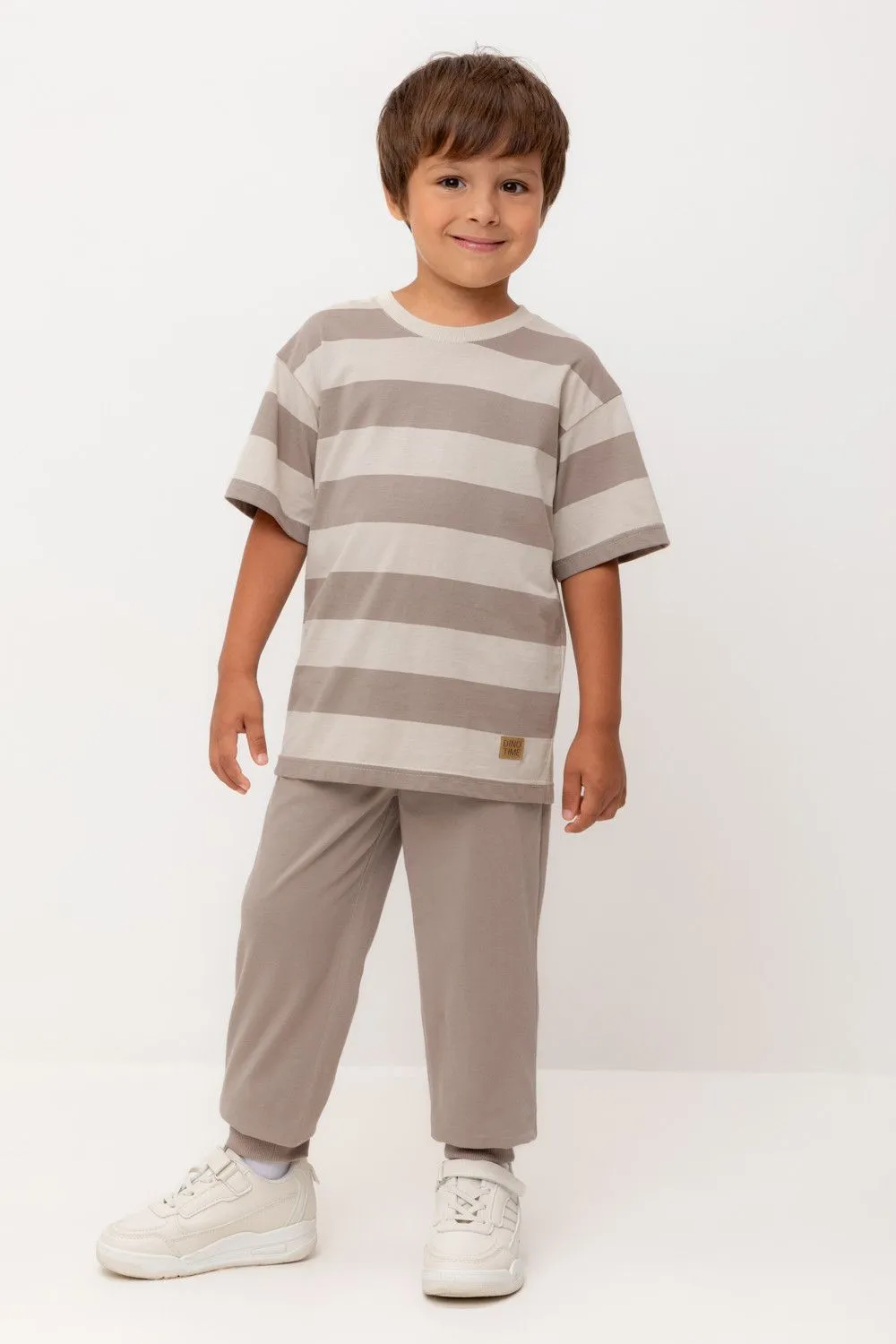 Брюки для мальчика из высококачественного трикотажного полотна. Пояс на резинке регулируется по ширине с помощью шнурка. По бокам два удобных кармана. Внизу эластичные манжеты.