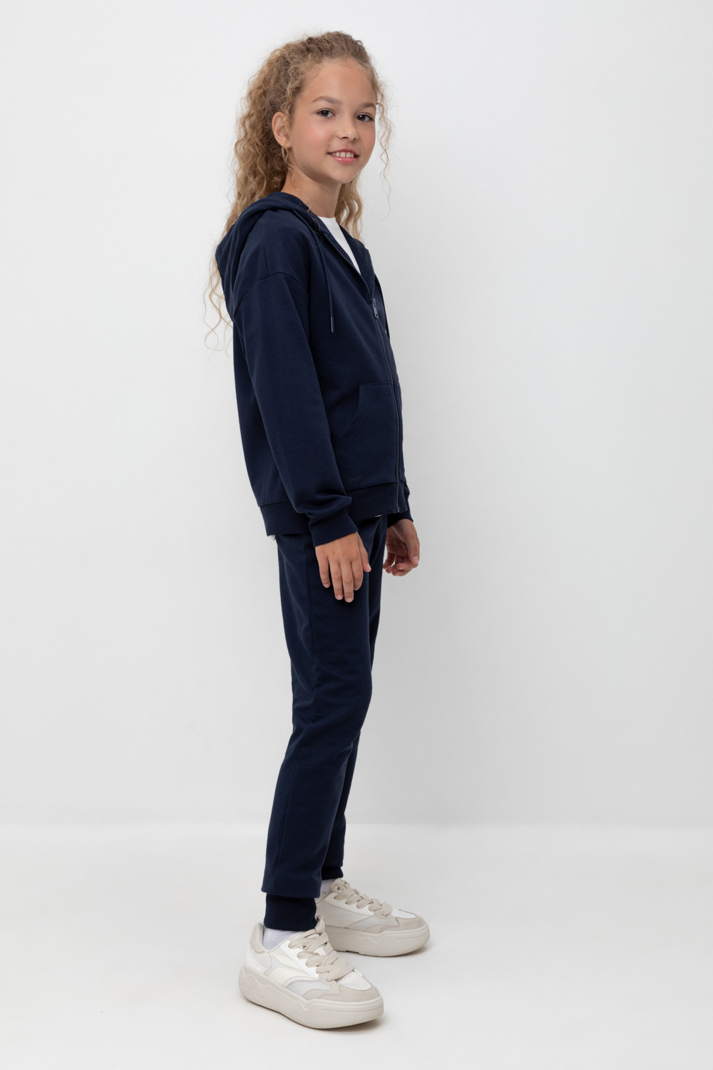Трикотажные брюки из петельчатого футера. Эластичный пояс на резинке регулируется по ширине с помощью шнурка, по бокам два удобных кармана, внизу эластичные манжеты.