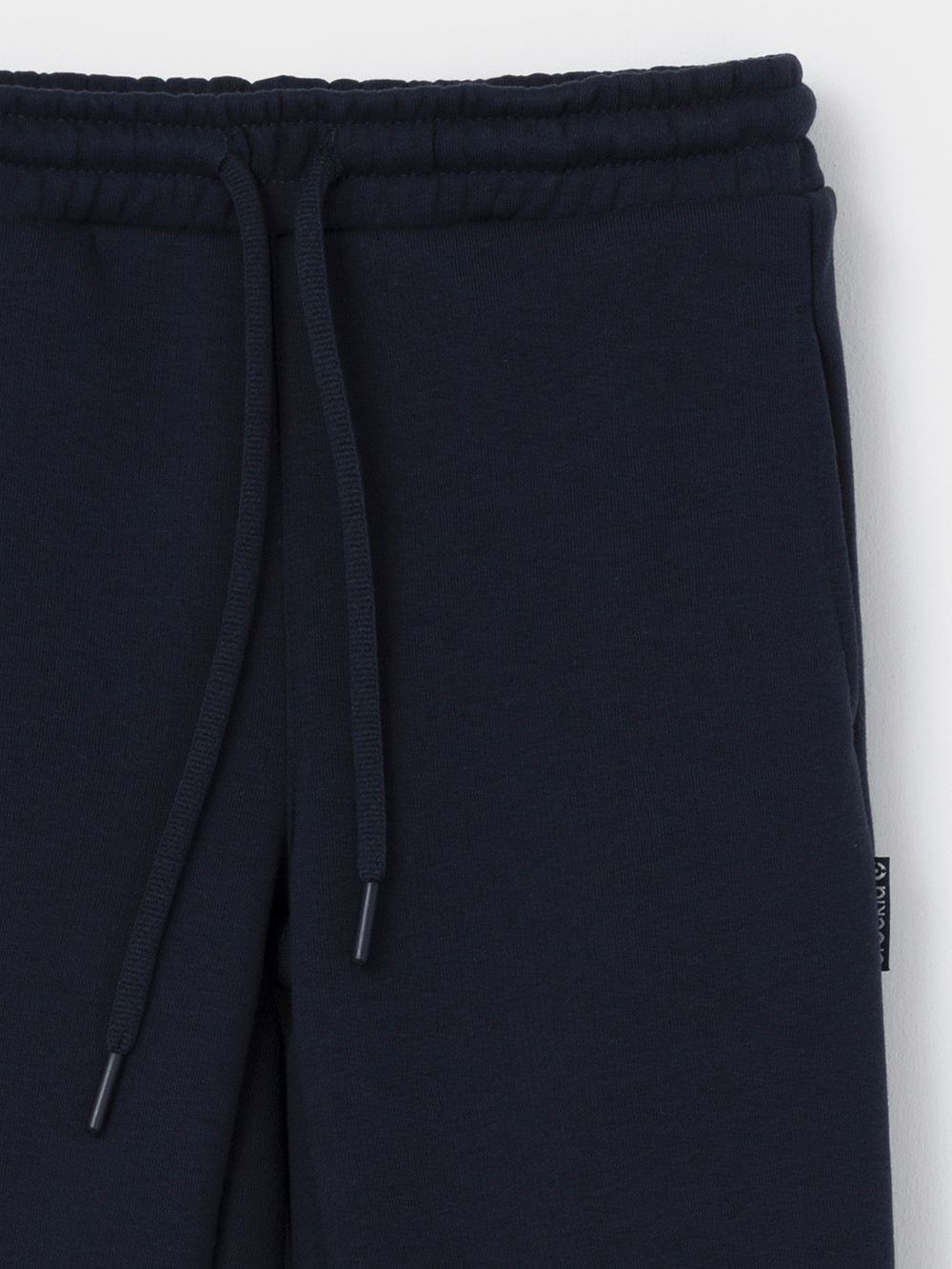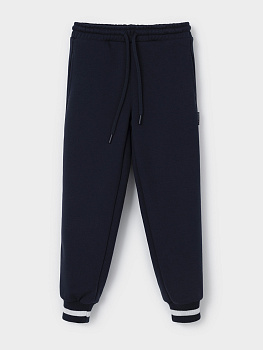 Трикотажные брюки для мальчика из мягкого петельчатого футера. В составе 80% натурального хлопка и 20% полиэстера, при этом полиэстер ввязан внутрь по особой технологии и не соприкасается с кожей.  Эластичный пояс на резинке регулируется по ширине с помощью шнурка. Изделие сохраняет цвет и форму после многократных стирок. Все трикотажные полотна производятся в соответствии с нормами швейцарского сертификата ЭкоТекс.