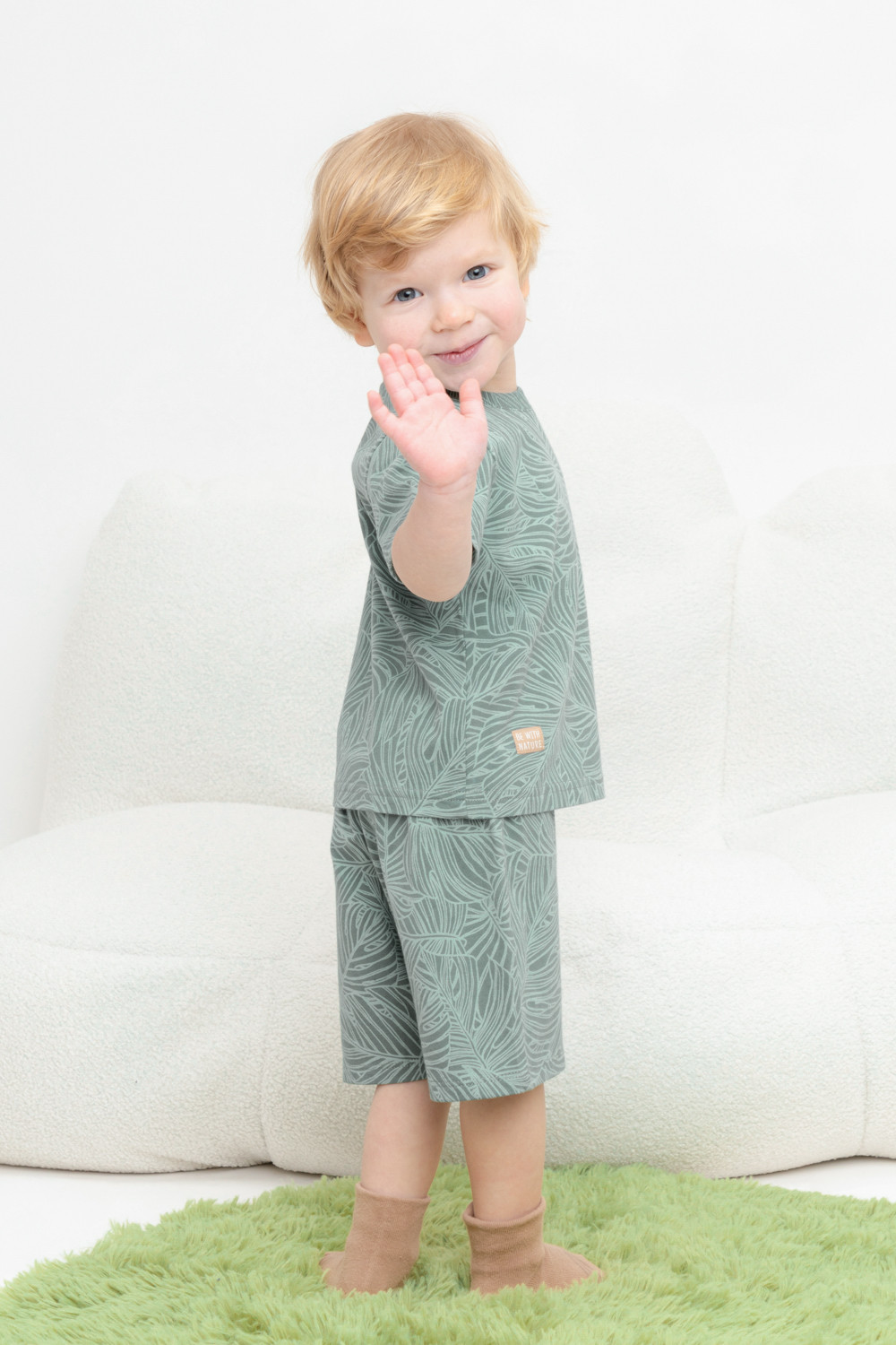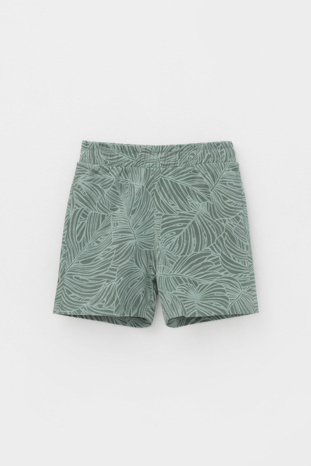Легкие трикотажные шорты для мальчика из набивного высококачественного хлопка. Эластичный пояс регулируется при помощи шнурка.