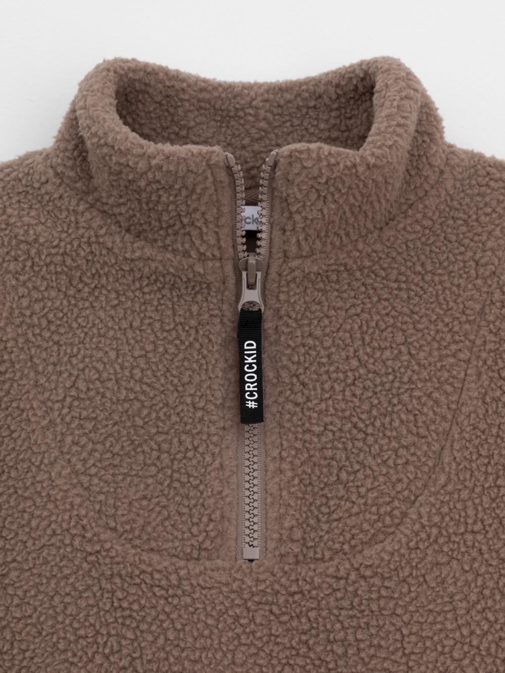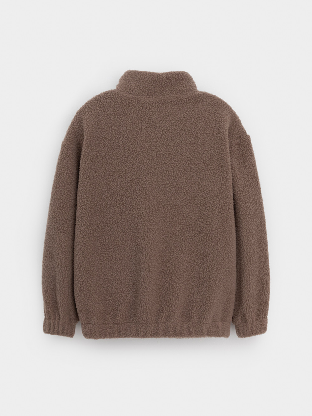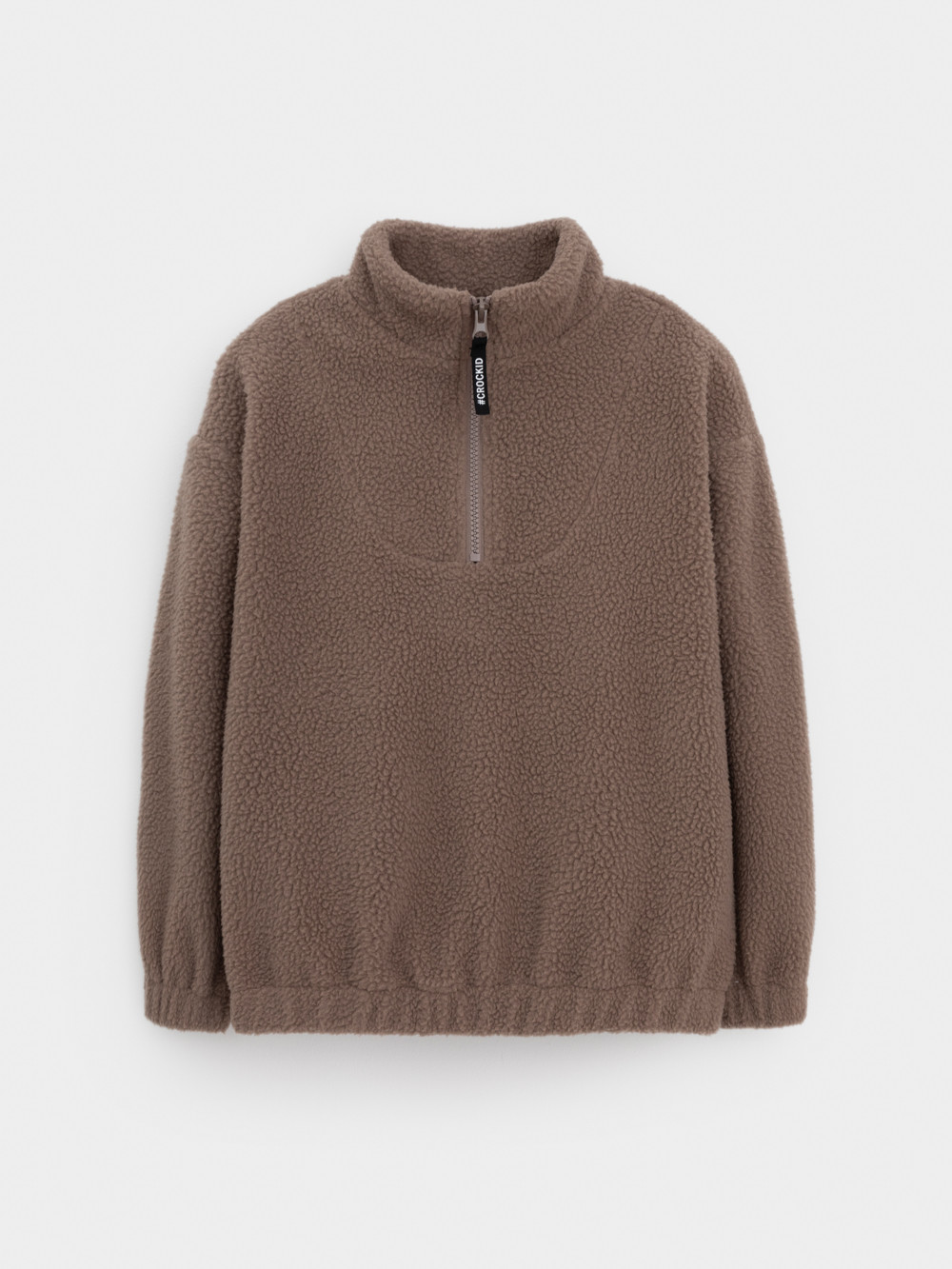 Детская толстовка из флиса. У изделия высокий воротник и застёжка спереди на короткую молнию. Рукава и низ изделия собраны на резинку. Толстовка сохраняет цвет и форму после многократных стирок.