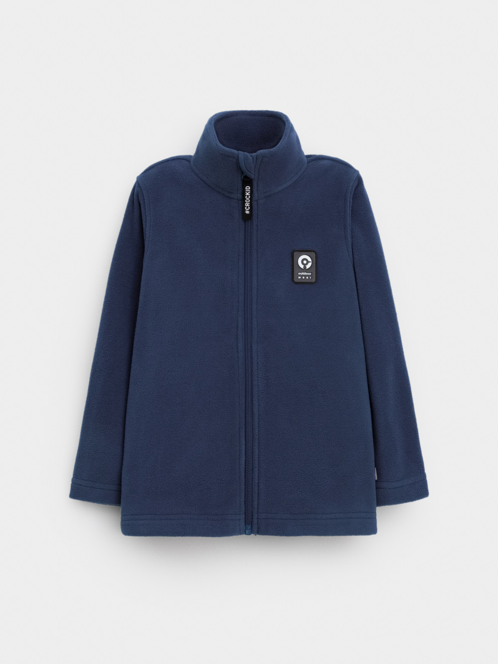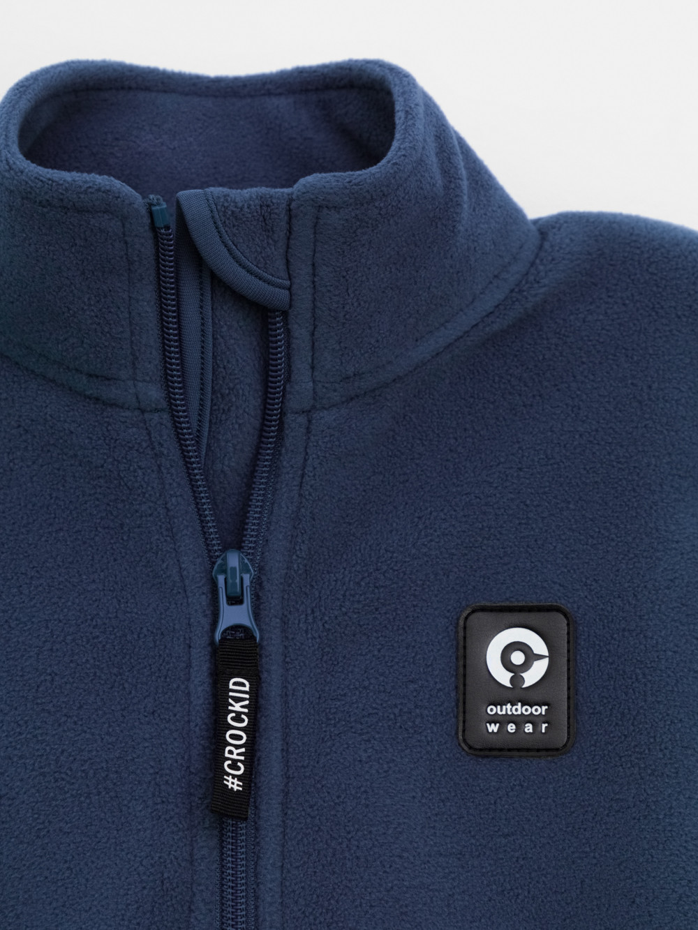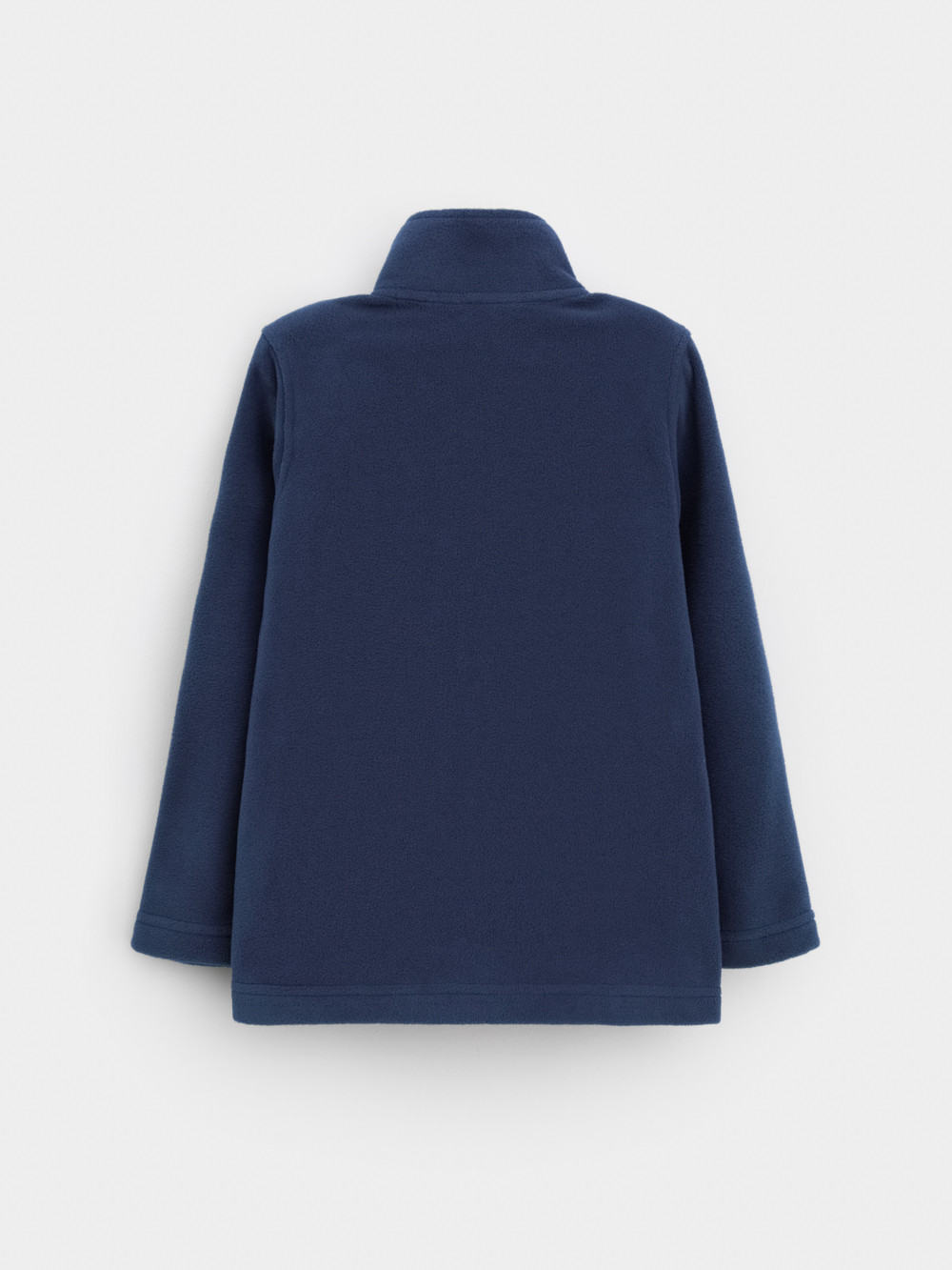 Флисовая куртка для мальчика. У изделия высокий воротник и застёжка на молнию с мягкой защитой шеи и подбородка. По бокам два кармана. Куртка сохраняет цвет и форму после многократных стирок.