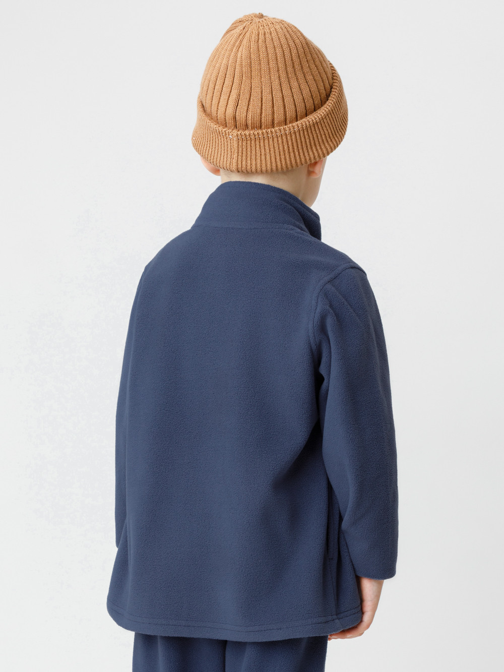 Флисовая куртка для мальчика. У изделия высокий воротник и застёжка на молнию с мягкой защитой шеи и подбородка. По бокам два кармана. Куртка сохраняет цвет и форму после многократных стирок.